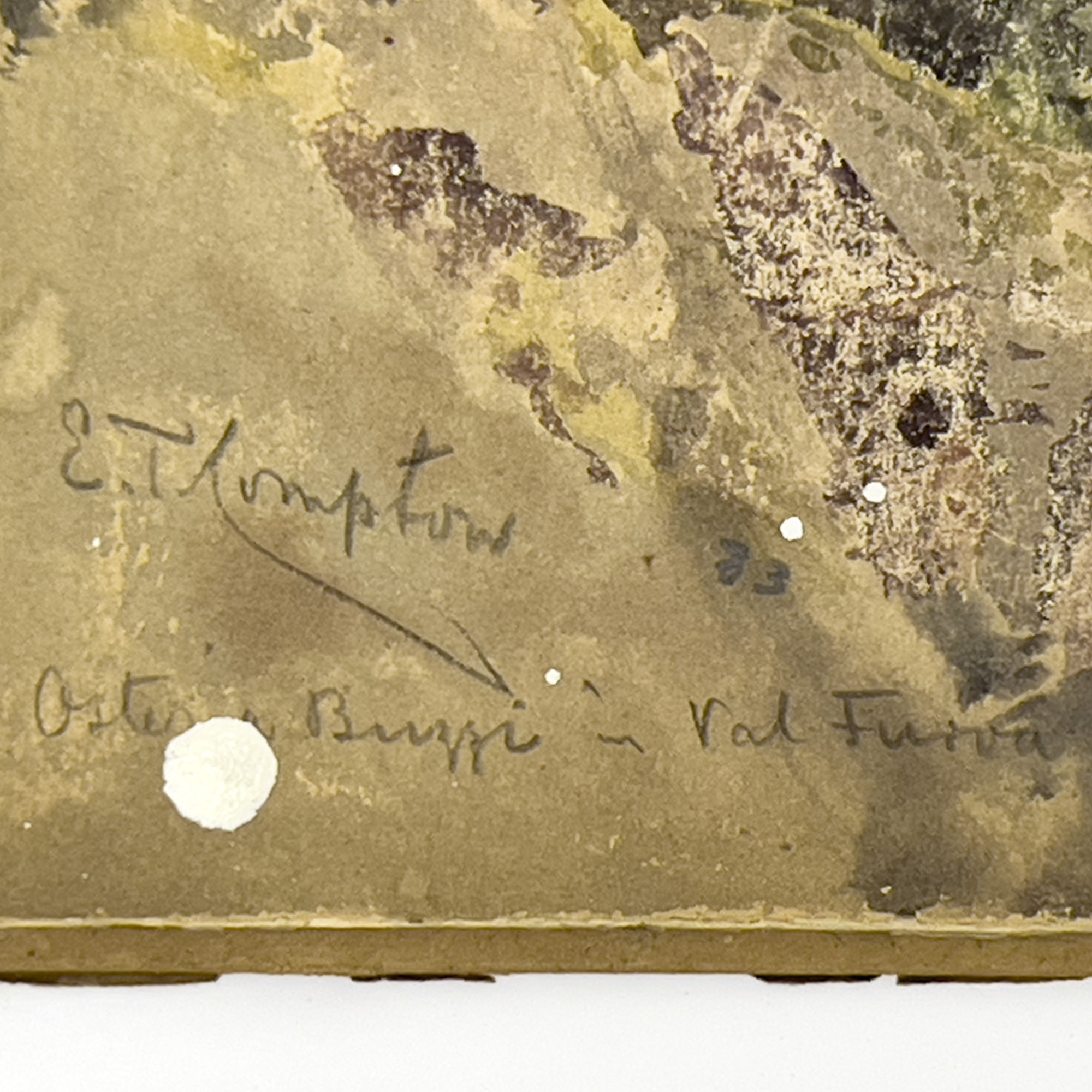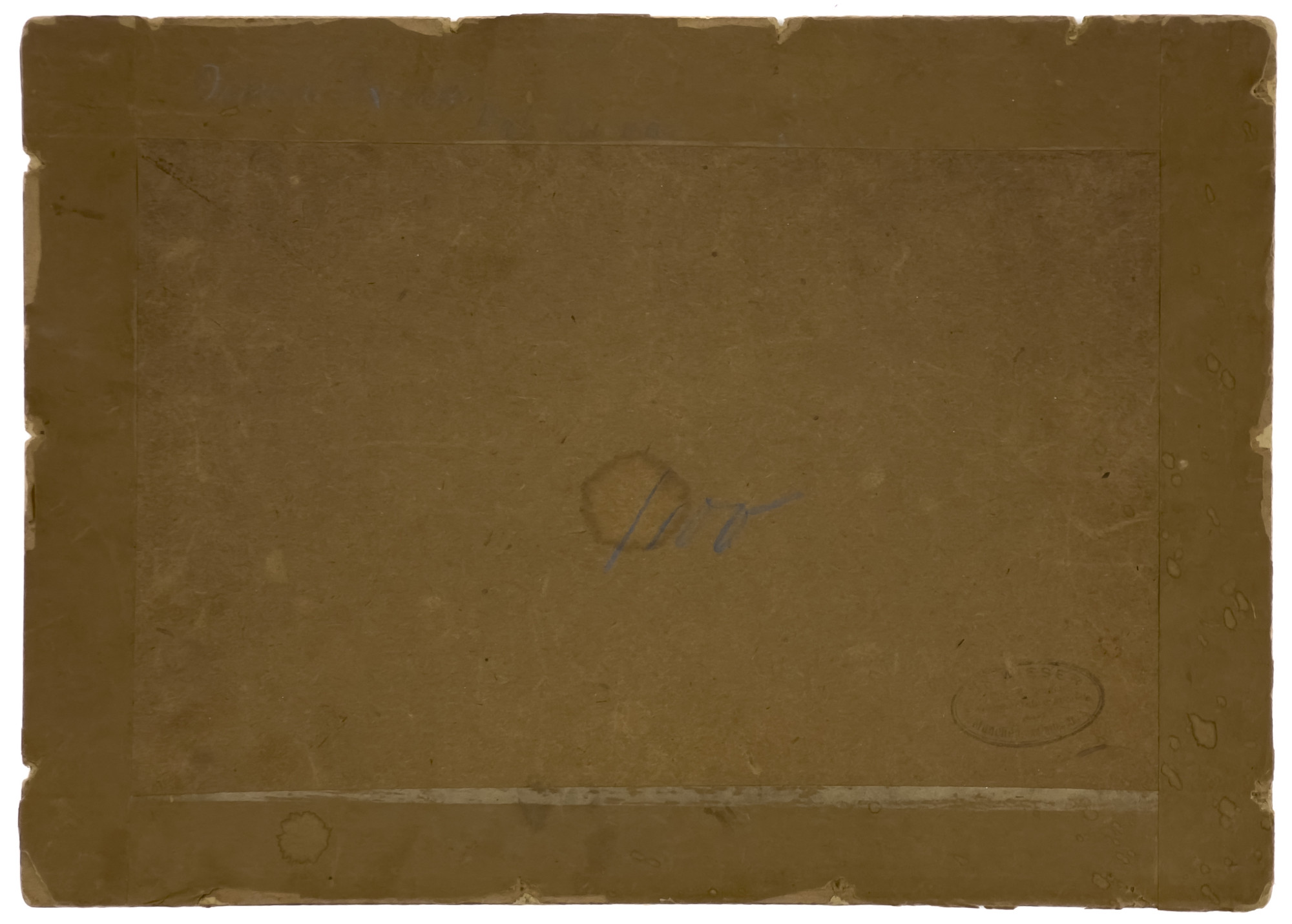 wear to the surface and edges in the form of pin holes and losses, general toning, paper is laid down to board, with apparent drop of latex paint to lower left corner