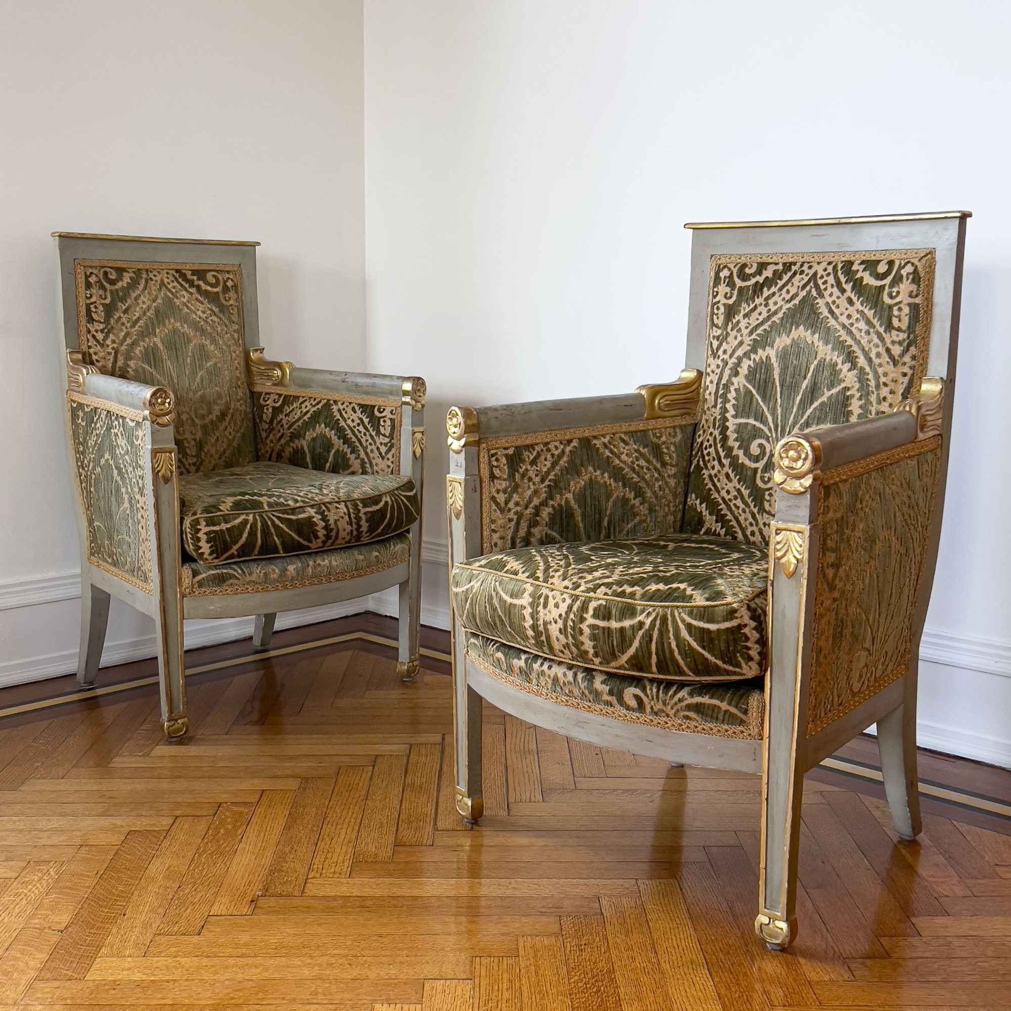 square back with padded arms, rising on tapered square legs terminating in splayed and carved feet, upholstered in Velluto Sforza
