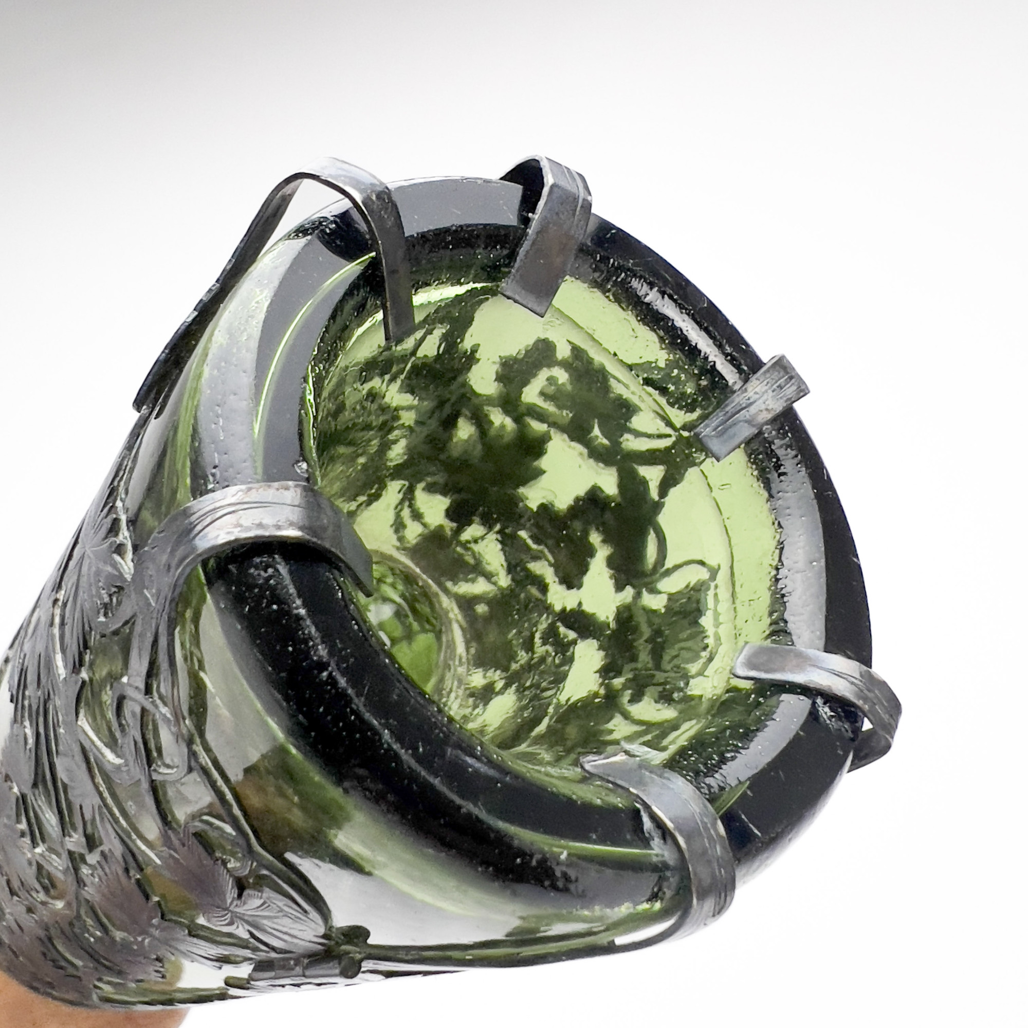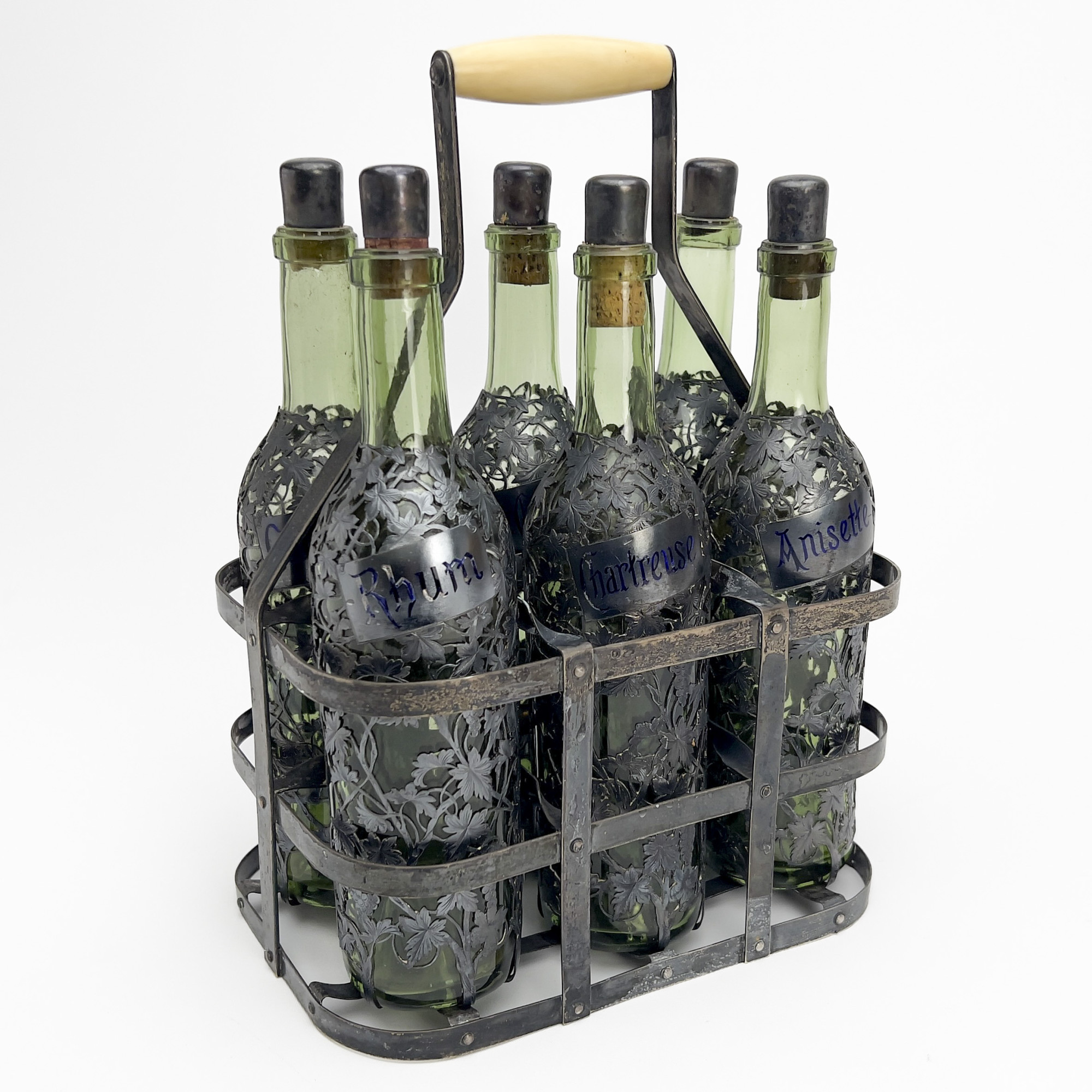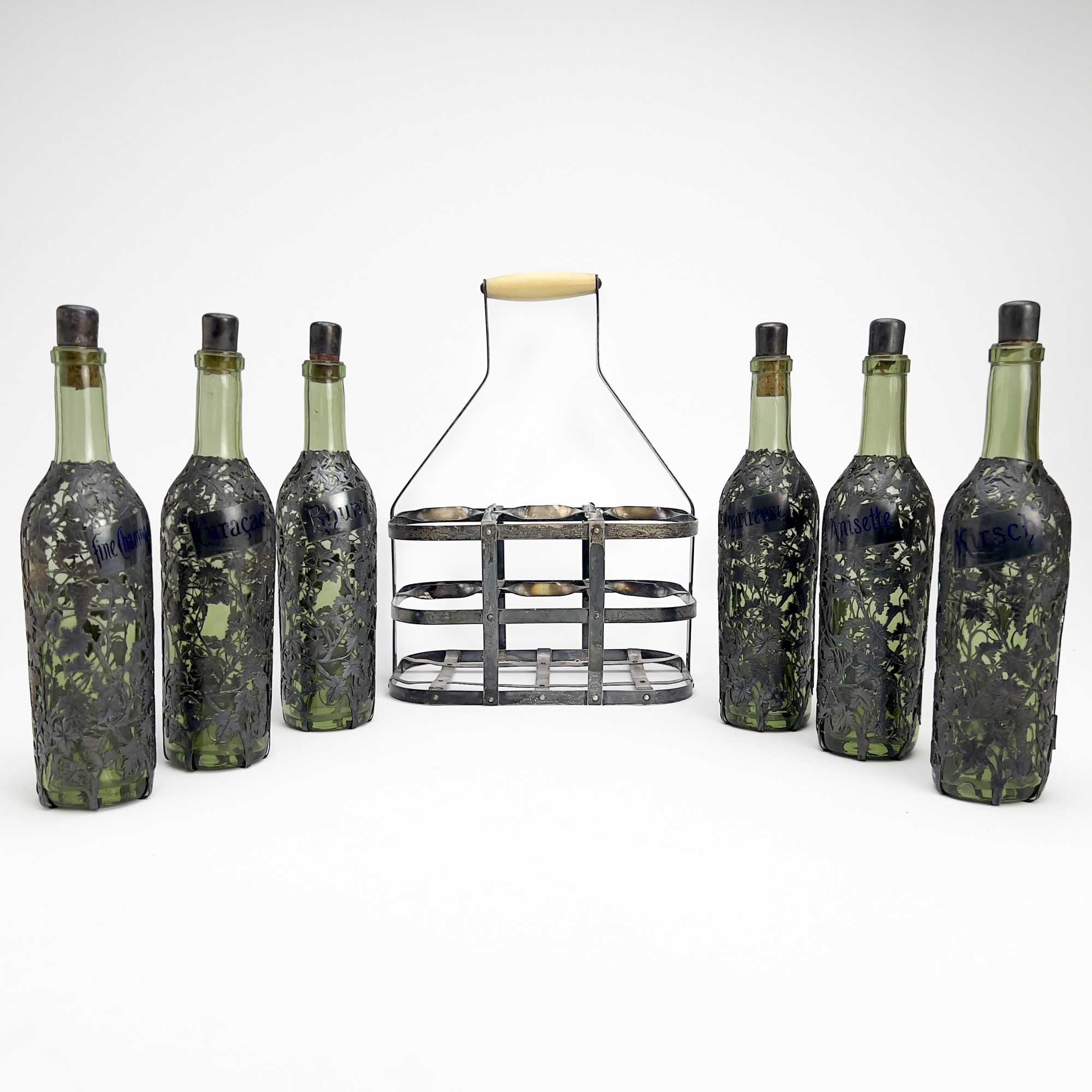 A six bottle Tantalus, 6 green glass bottles with fine engraved and pierced silver covers with grapevine motif and rectangular labels for assorted liquors and decorative silver mounted corks, the group together with a handled carrying case,
