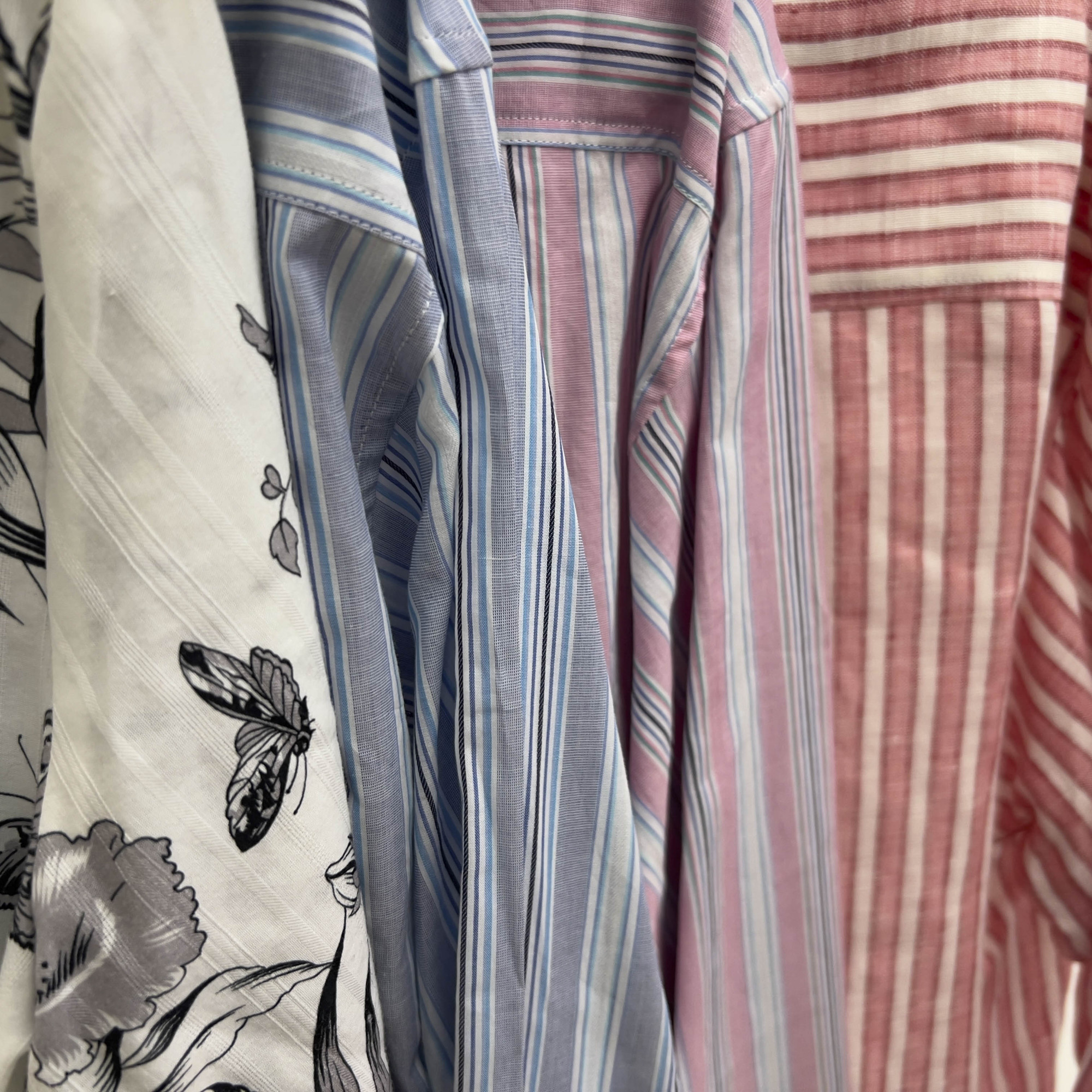 Three 100% cotton button up shirts and one 100% linen shirt in sizes 40, 46, S, and S, all with tags attached