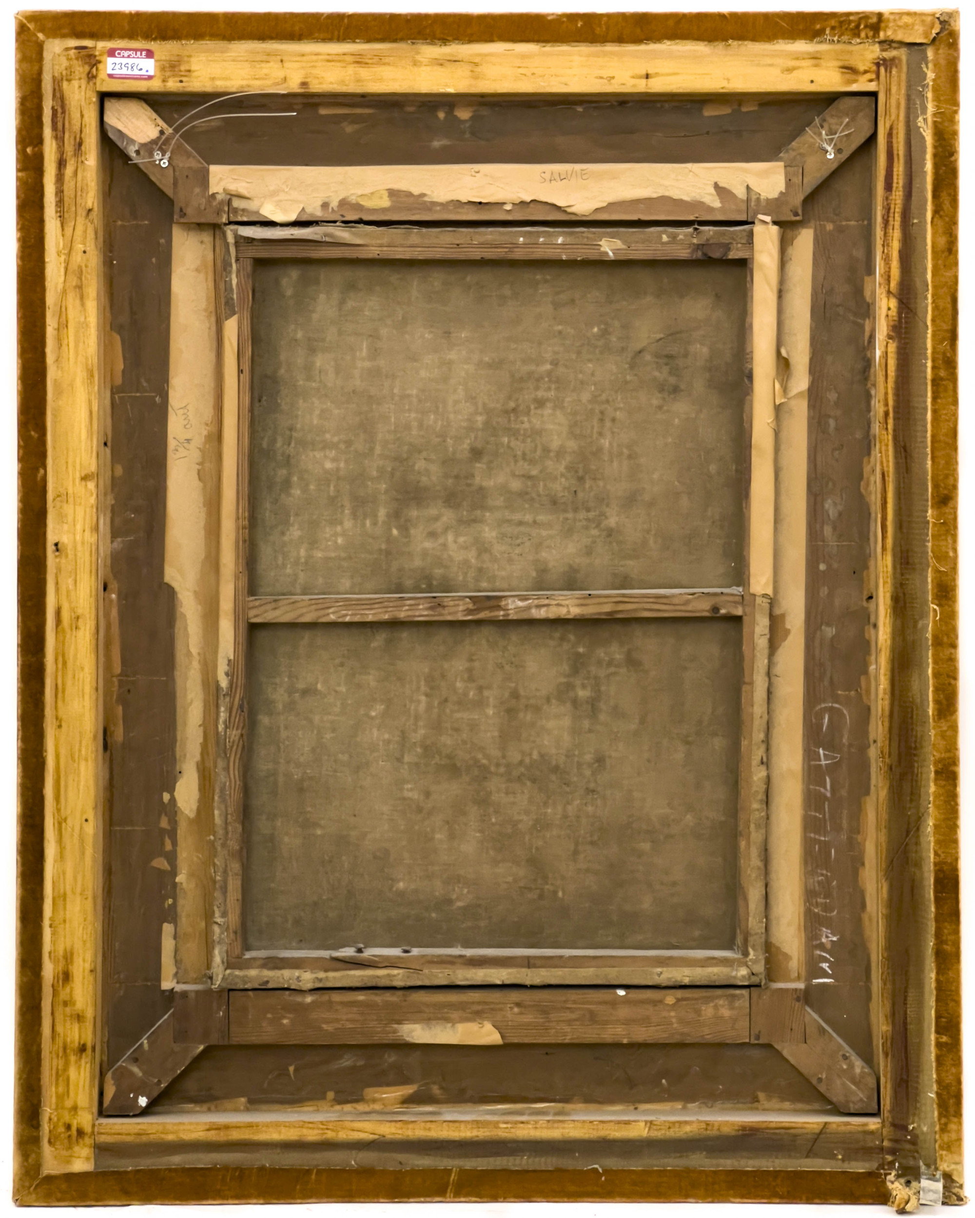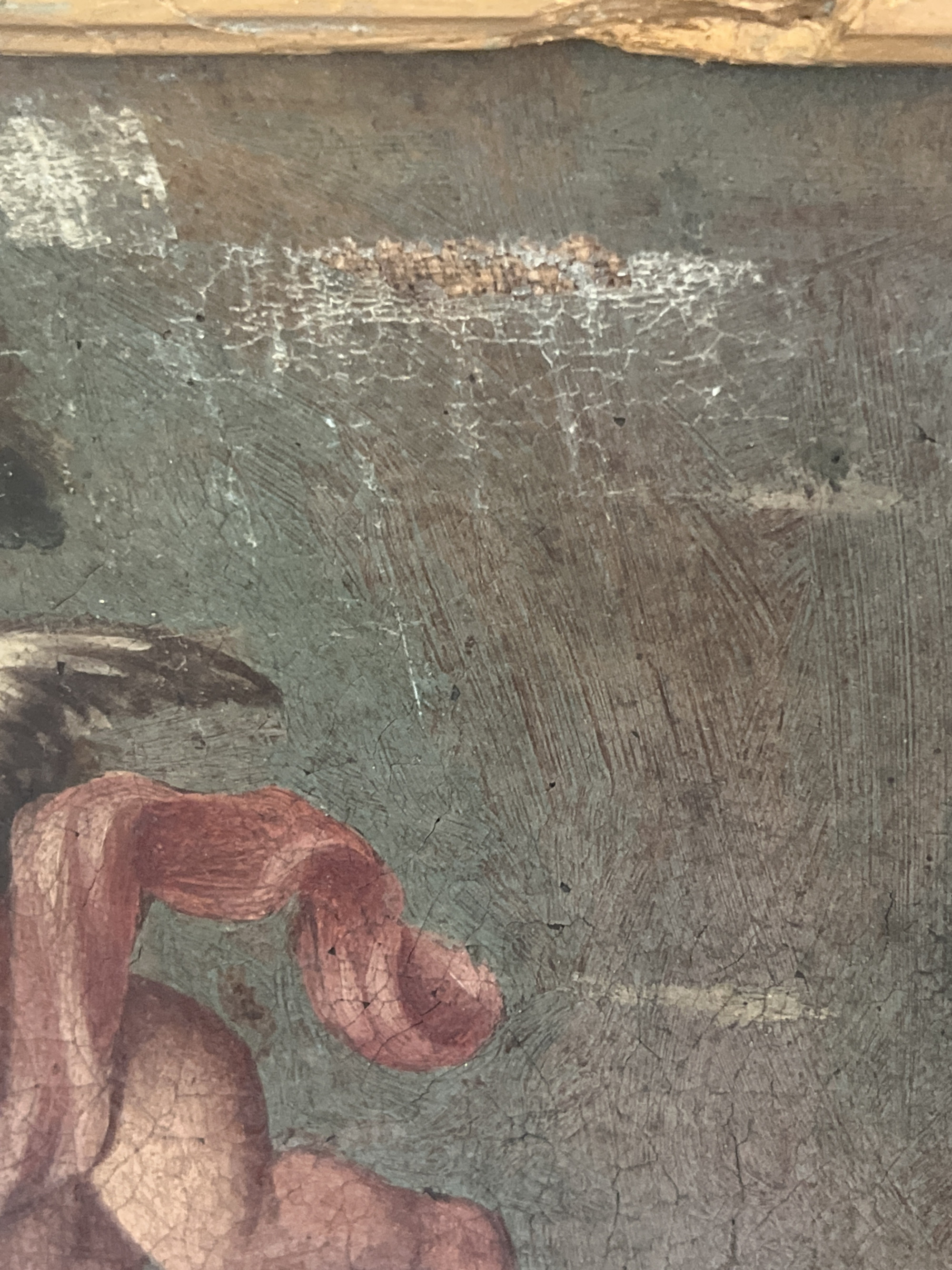 with craquelure throughout, some minor frame abrasion, and some losses, canvas is lined, would benefit from a cleaning