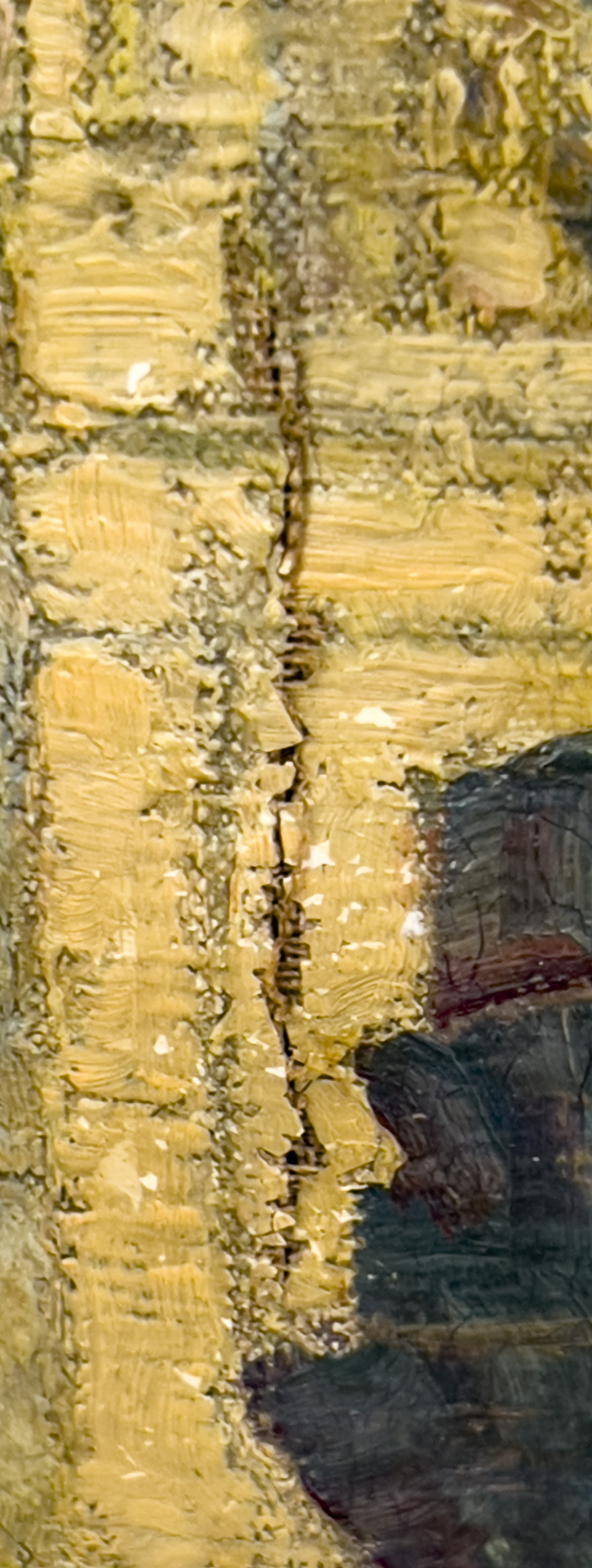 overall good condition, with 2 3/4 inch tear to the right side as well minor puncture near the center, medium is well attached to the support, would benefit from a cleaning