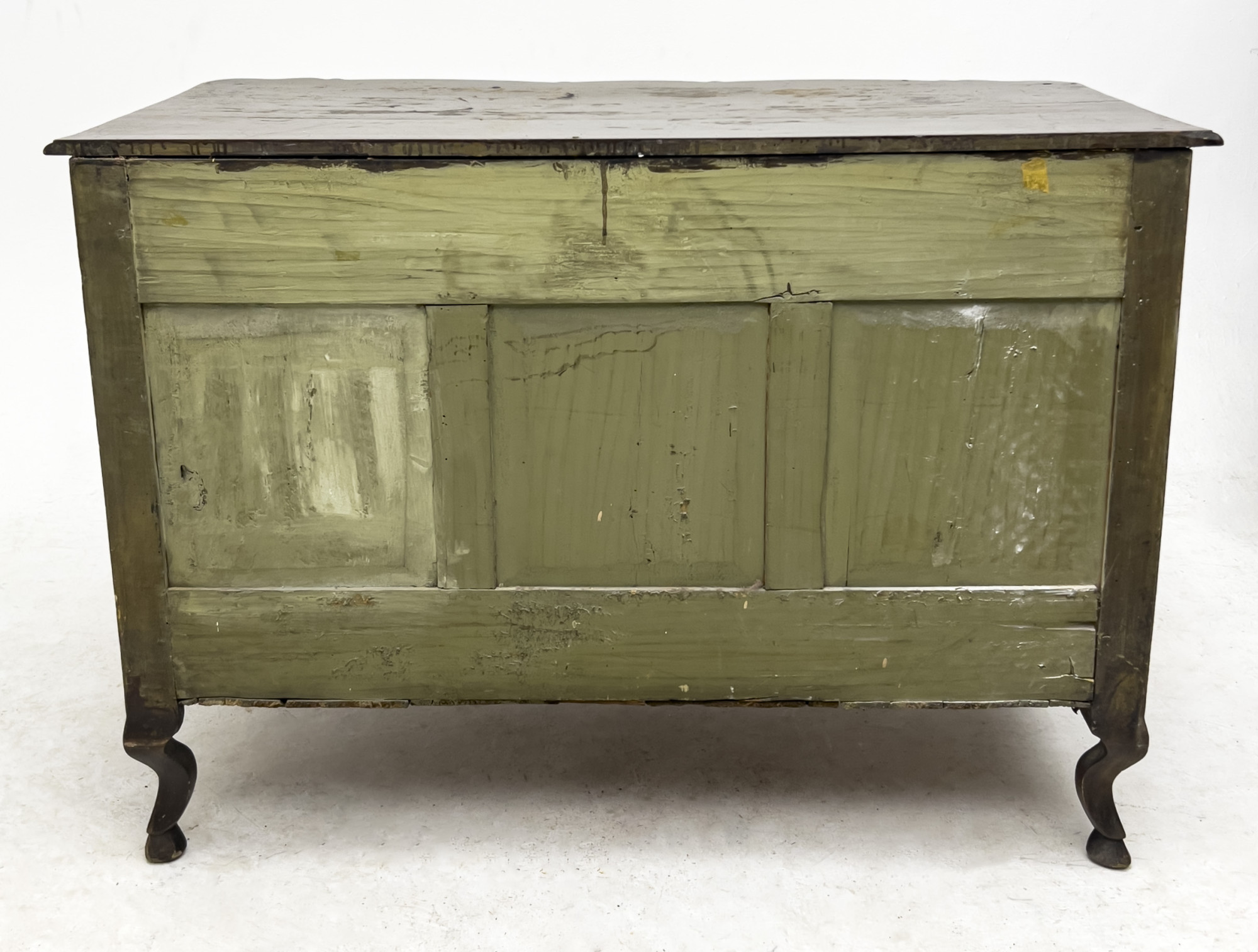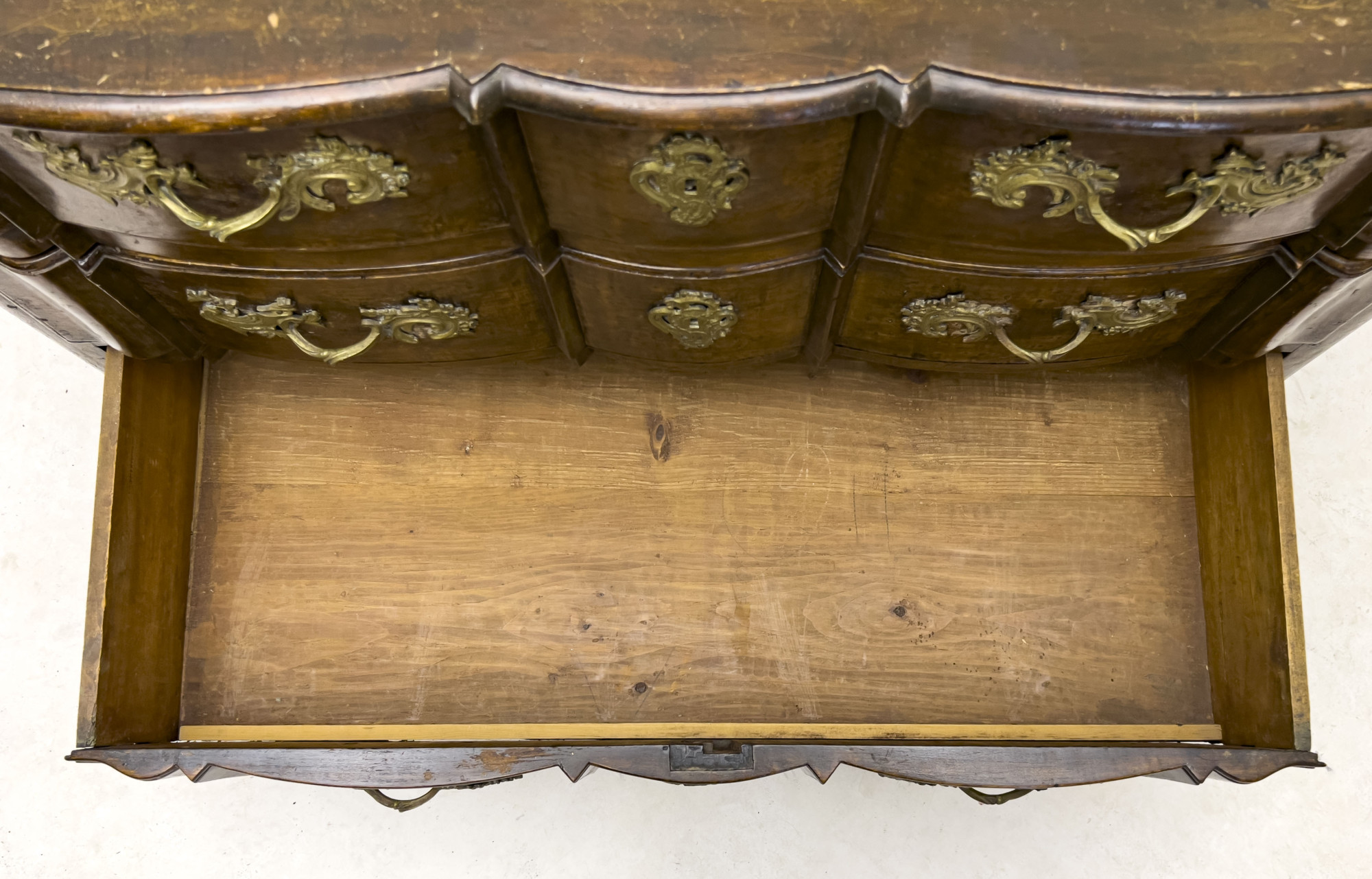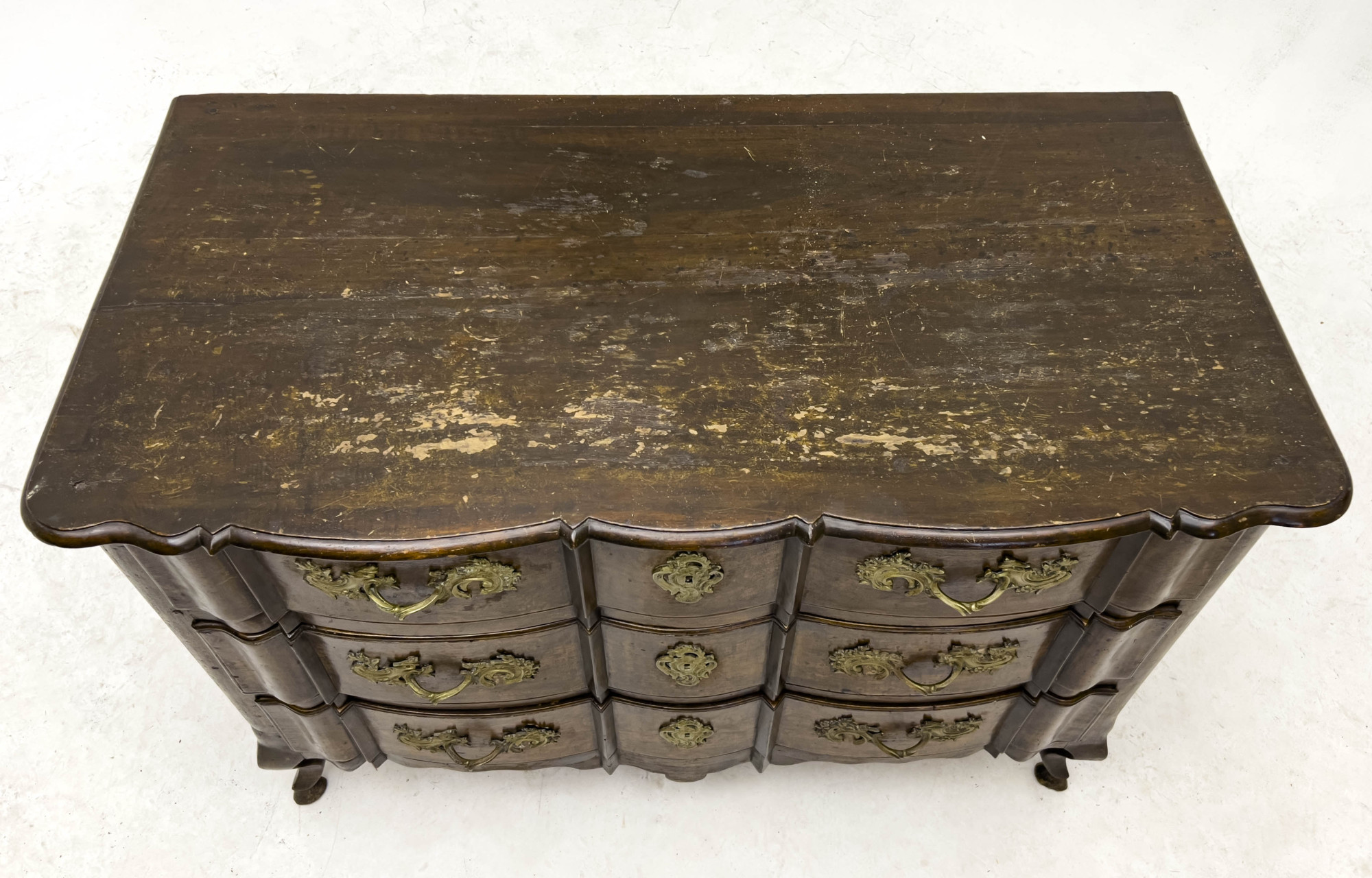 Chest of drawers, with an overhanging single board top with molded front and side edges, below three arbalete shaped drawers with heavy brass pulls and escutcheons, a scalloped apron, resting on cabriole legs