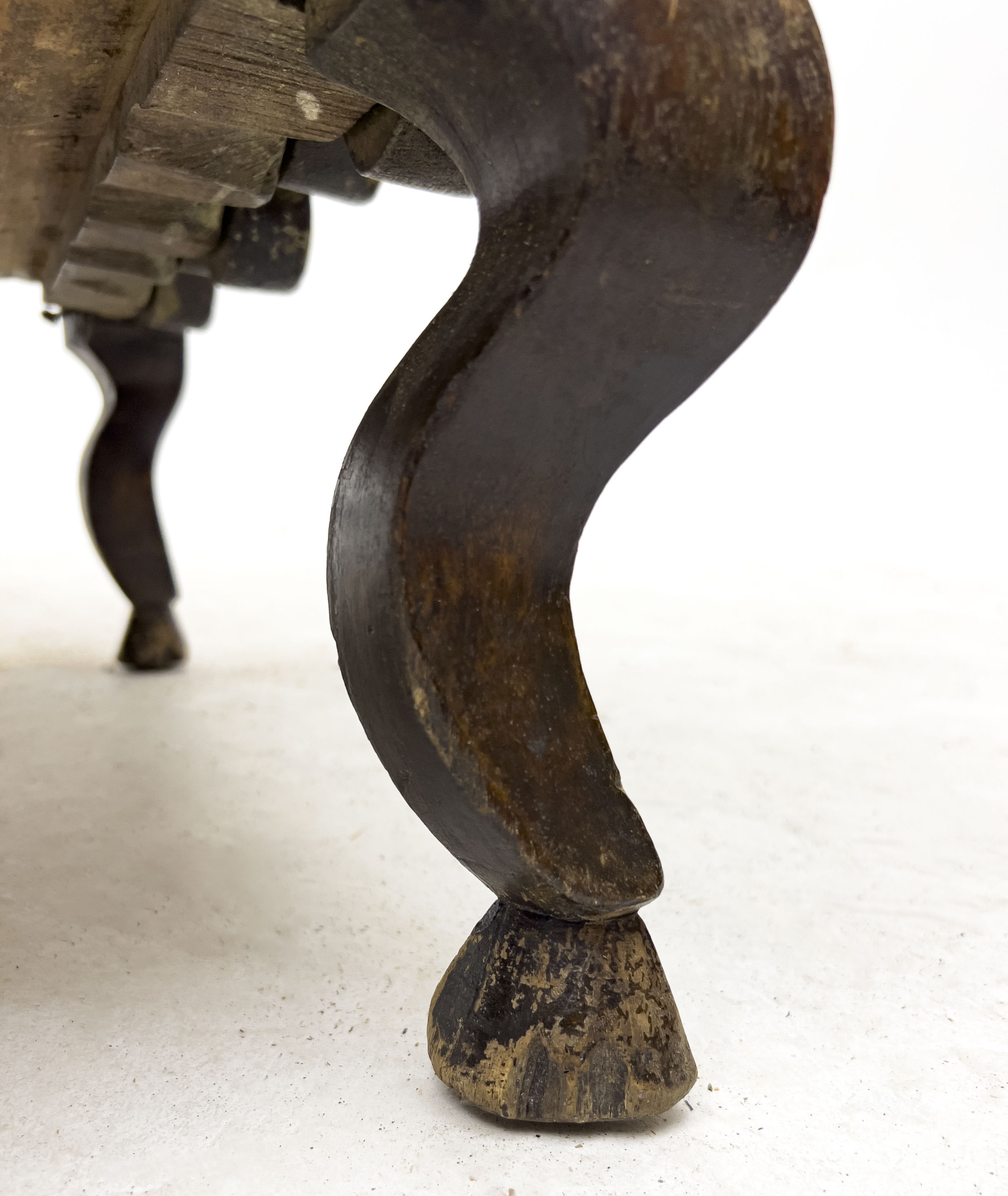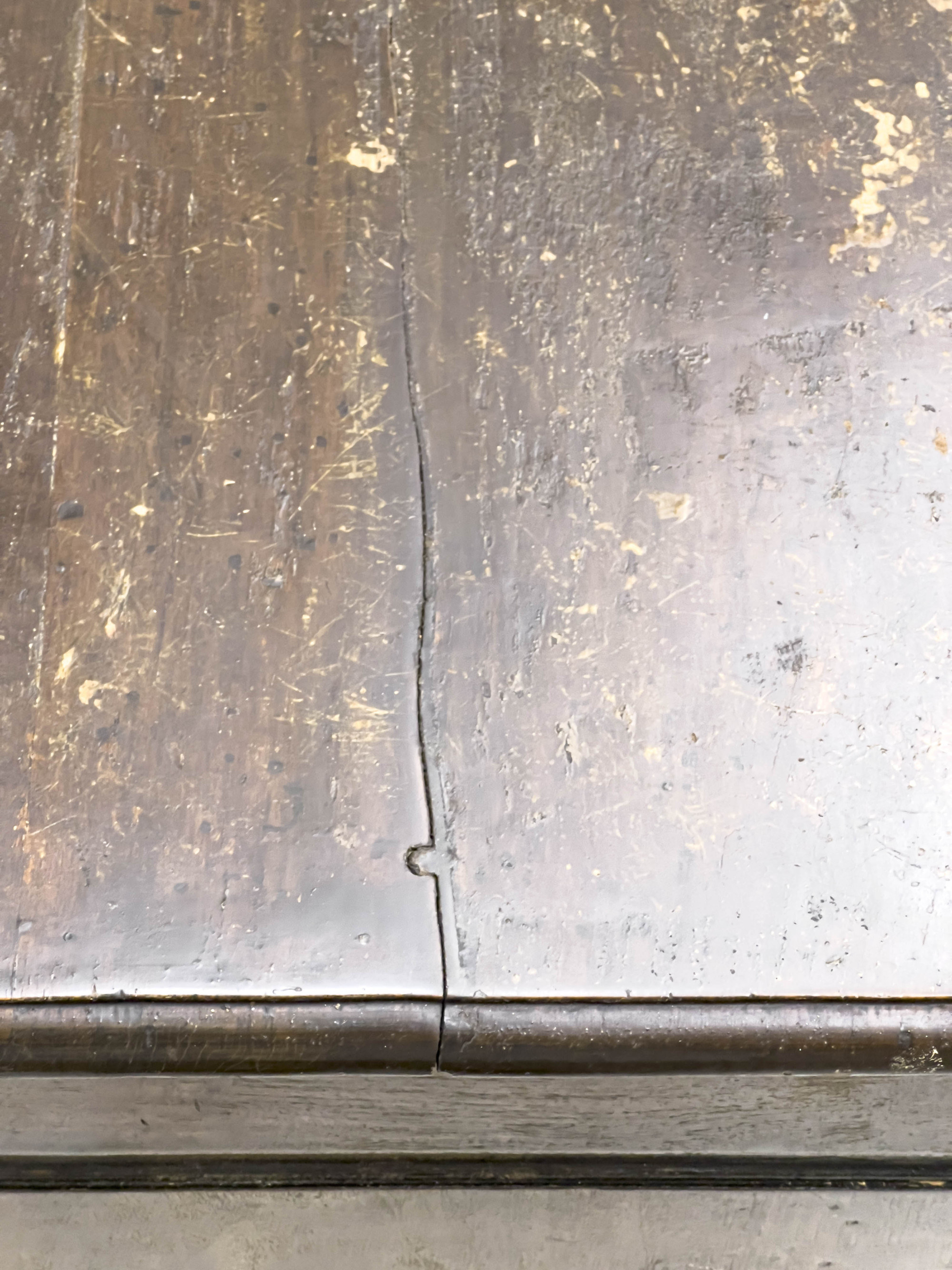 wear commensurate with age, scattered scuffs, scratches, and abrasions, some loose joinery, some areas of wood splitting, with some areas wormage