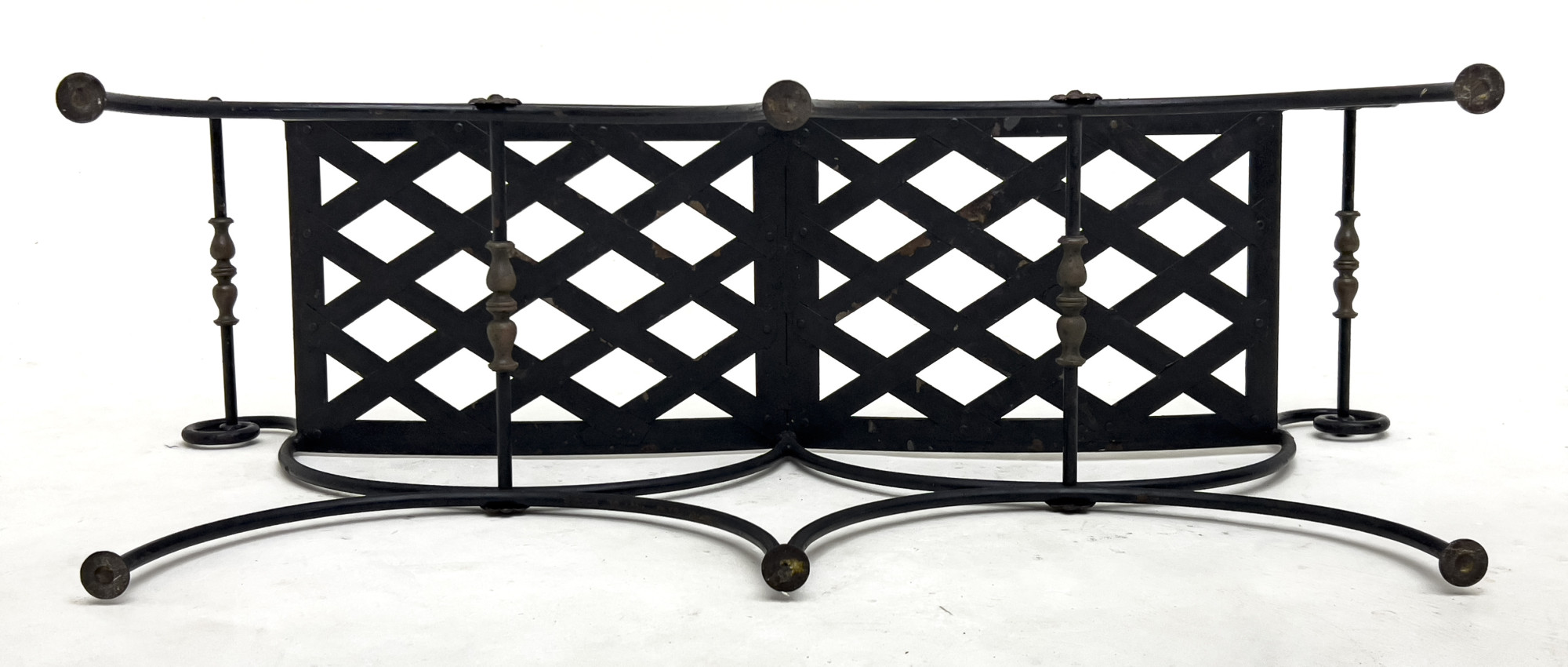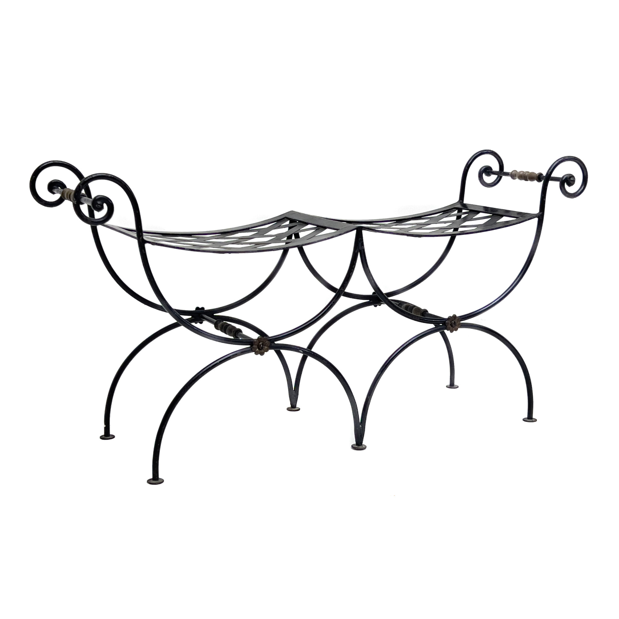 Wrought iron two seat bench with brass handles, gold accent rosettes, and green velvet seat cushion