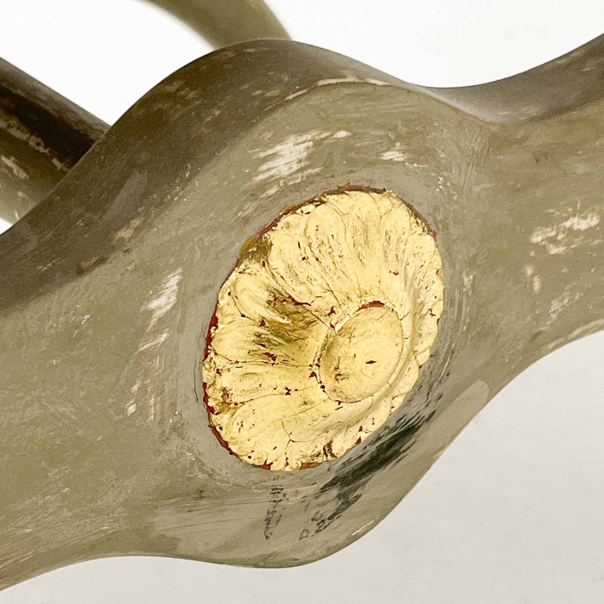 yellow upholstered seat with ball finial corners and gilt rosette mounts, over trestle base