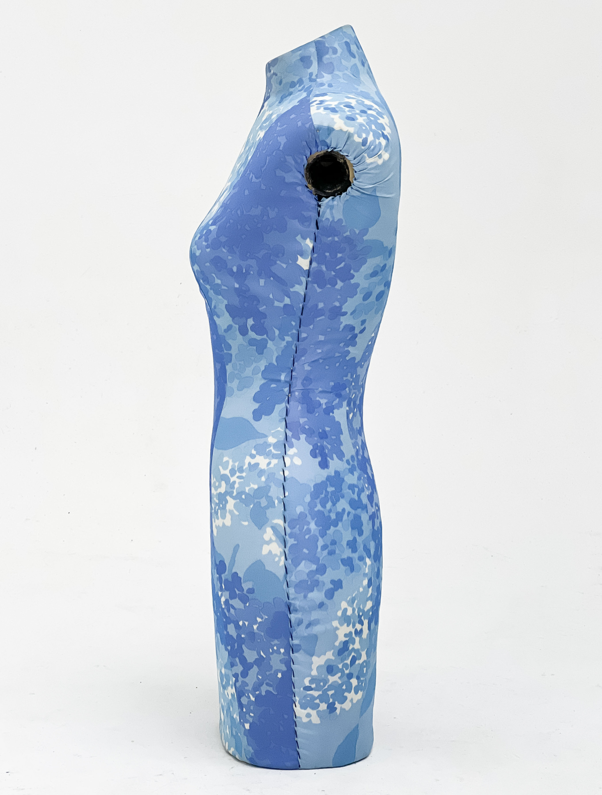 vintage mannequin from the Geoffrey Beene Studio, covered in monochromatic blue floral pattern