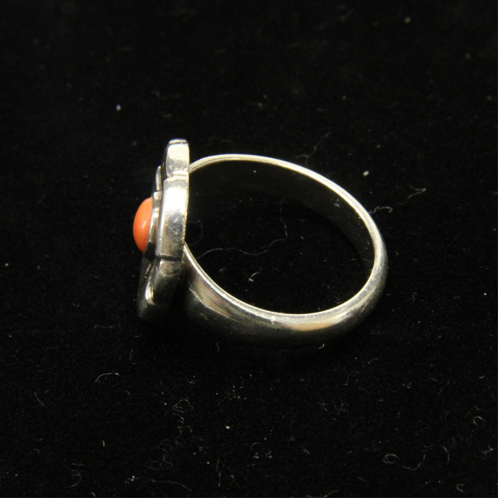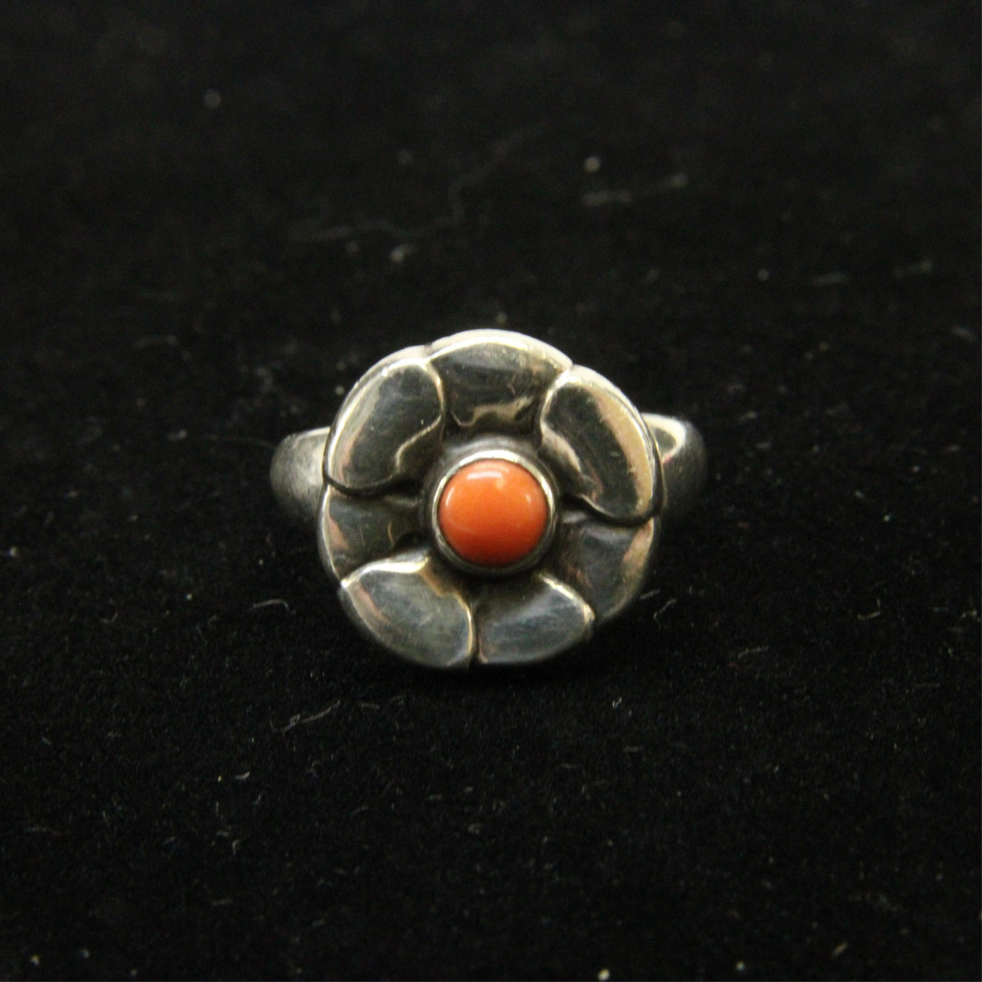 A sterling silver Georg Jensen ring in the form of a flower with central coral cabochon, design number 64. Marks indicative of 1927 - 1930 production. Size 7.5 Property from a private Manhattan collection