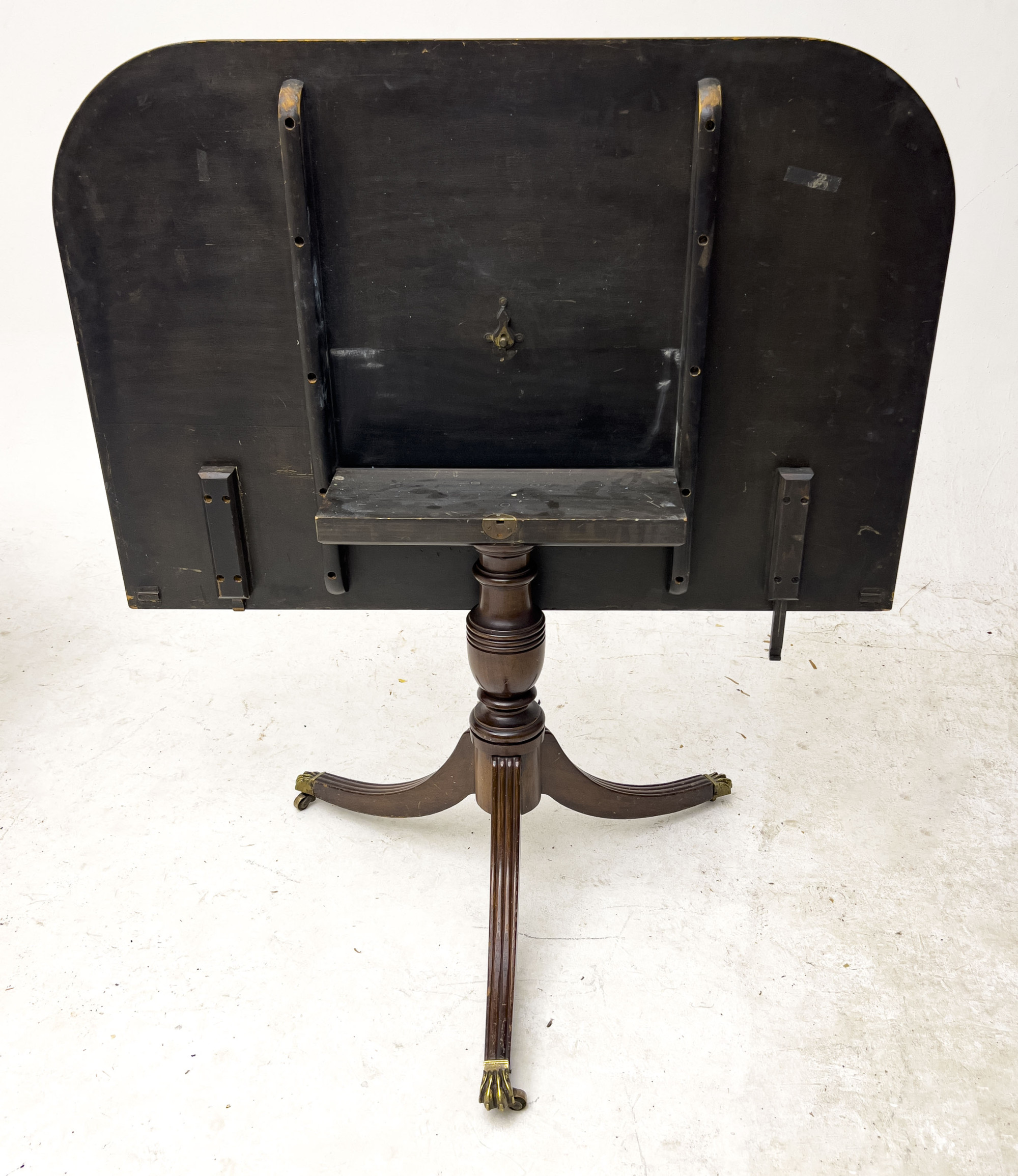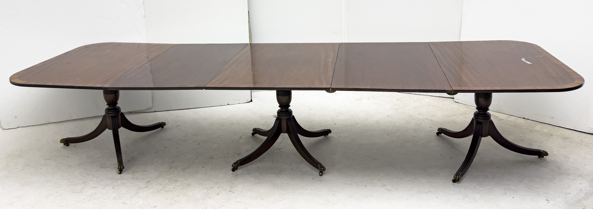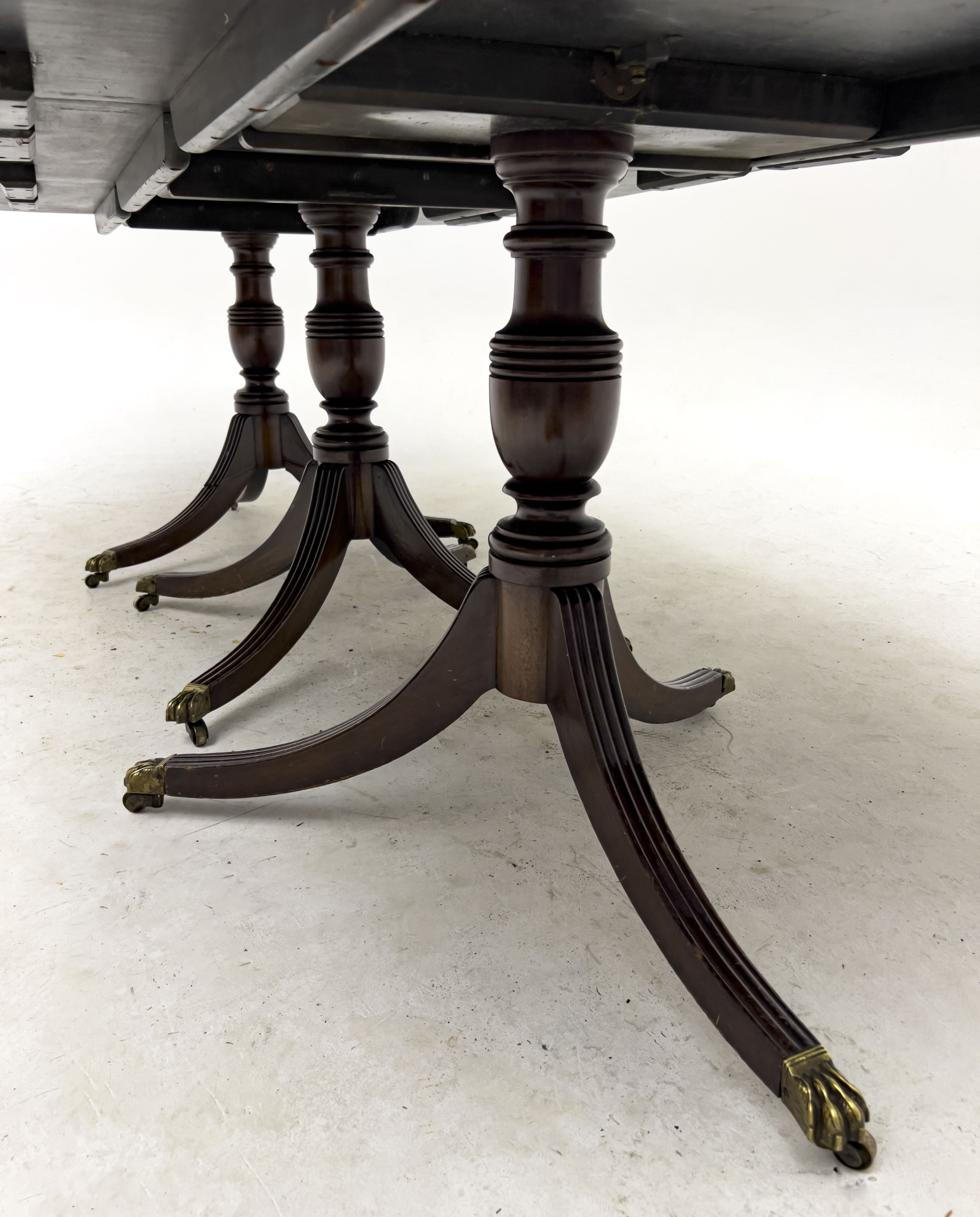 Mahogany triple pedestal base dining table having splayed legs with brass lions paw feet and casters, top of each section hinges for storage, with two additional leaves for additional length, could also be configured as three tilt-top tables