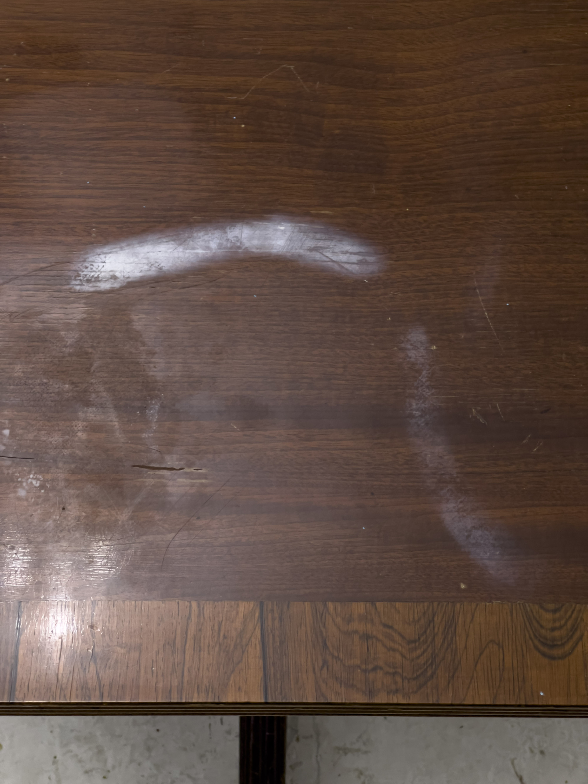 some cracks and wood splitting to table legs, scattered scuffs and scratches, area of white paint to table top