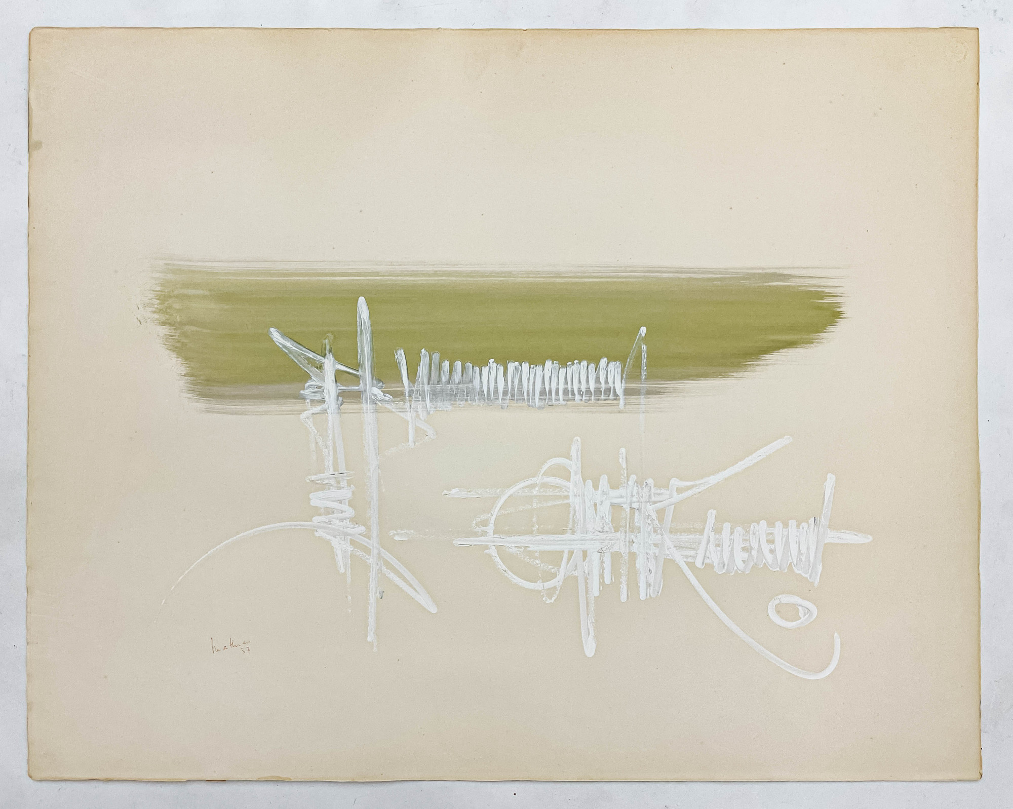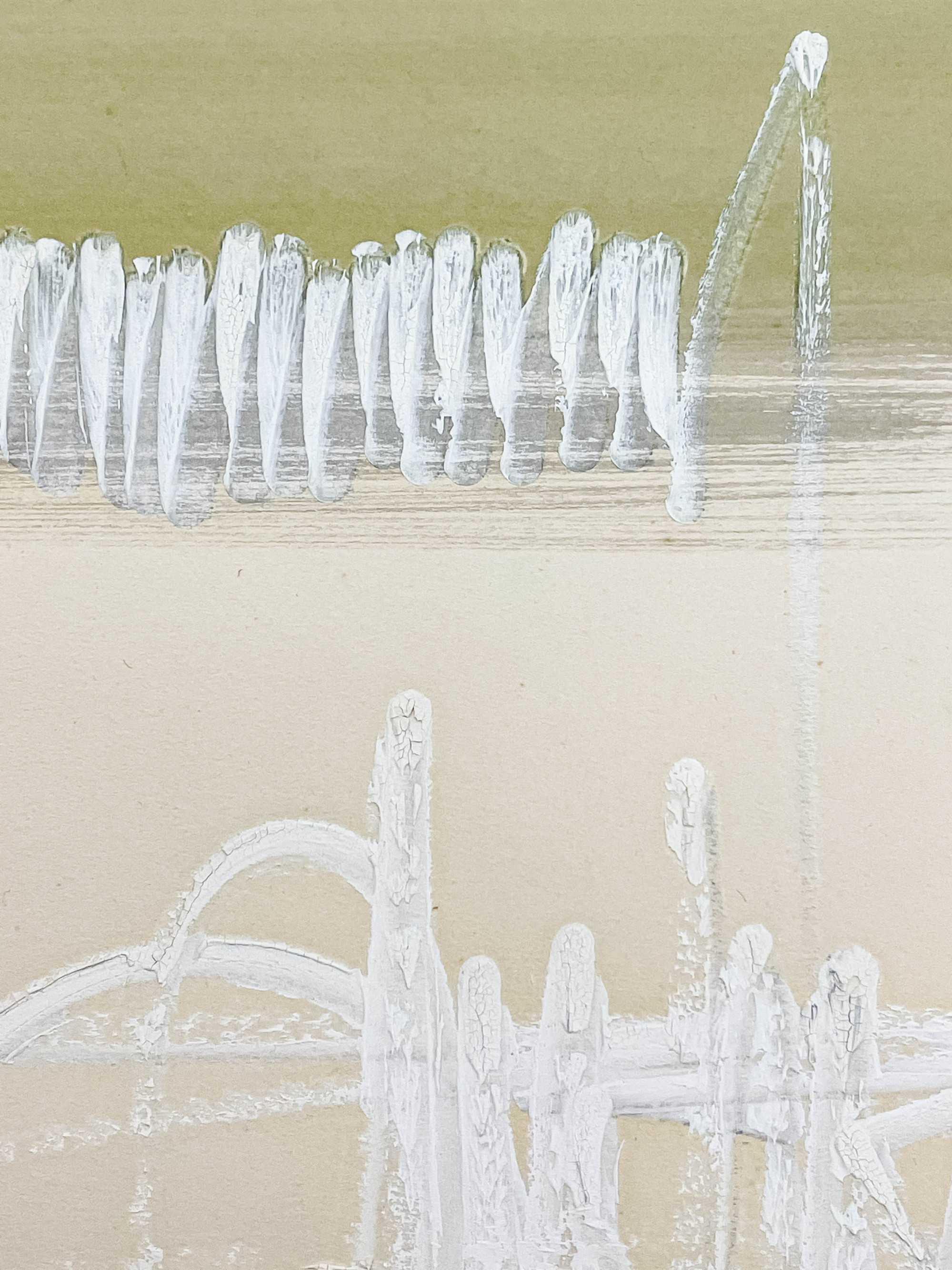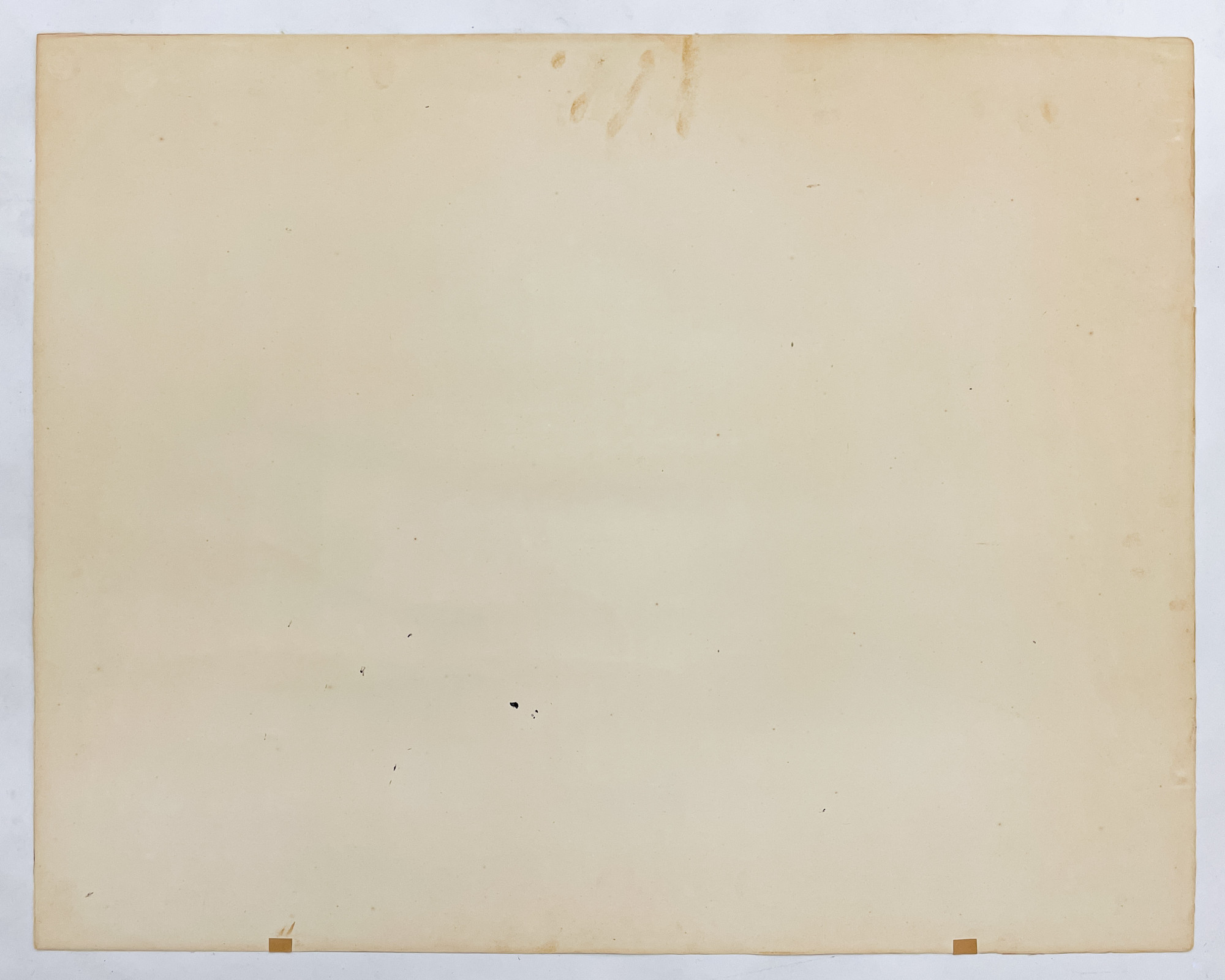overall good condition, there are several faint spots of foxing throughout, minor impressions to the left edge, a faint spot of discoloration to the center top edge, and a few small areas of craquelure to thick applied white gouache