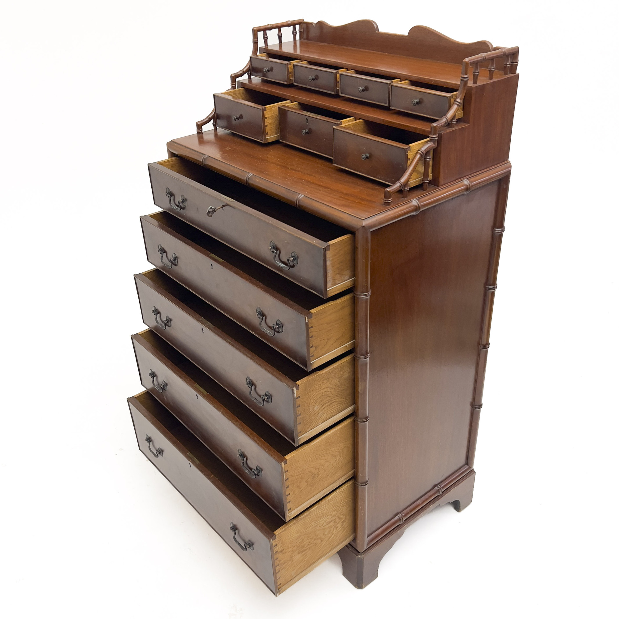 A Georgian style faux bamboo tall bedroom chest, with gallery shelf above seven top drawers and five lower drawers, two drawers with locks.