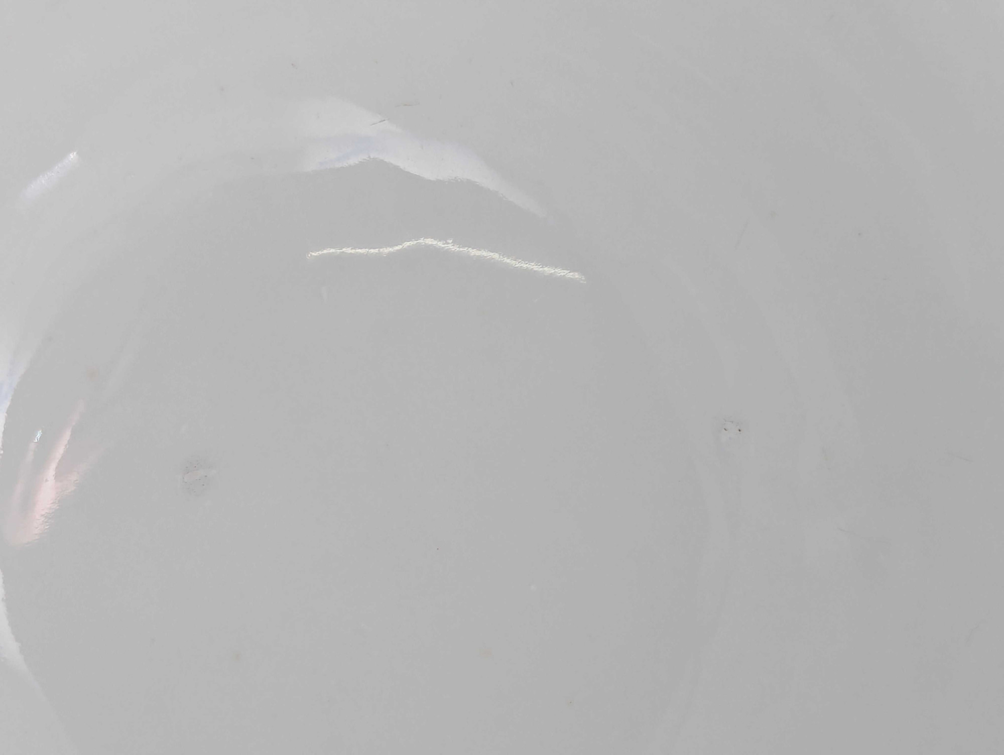 overall very good condition, with two very minor glaze defects and small area of staining to interior