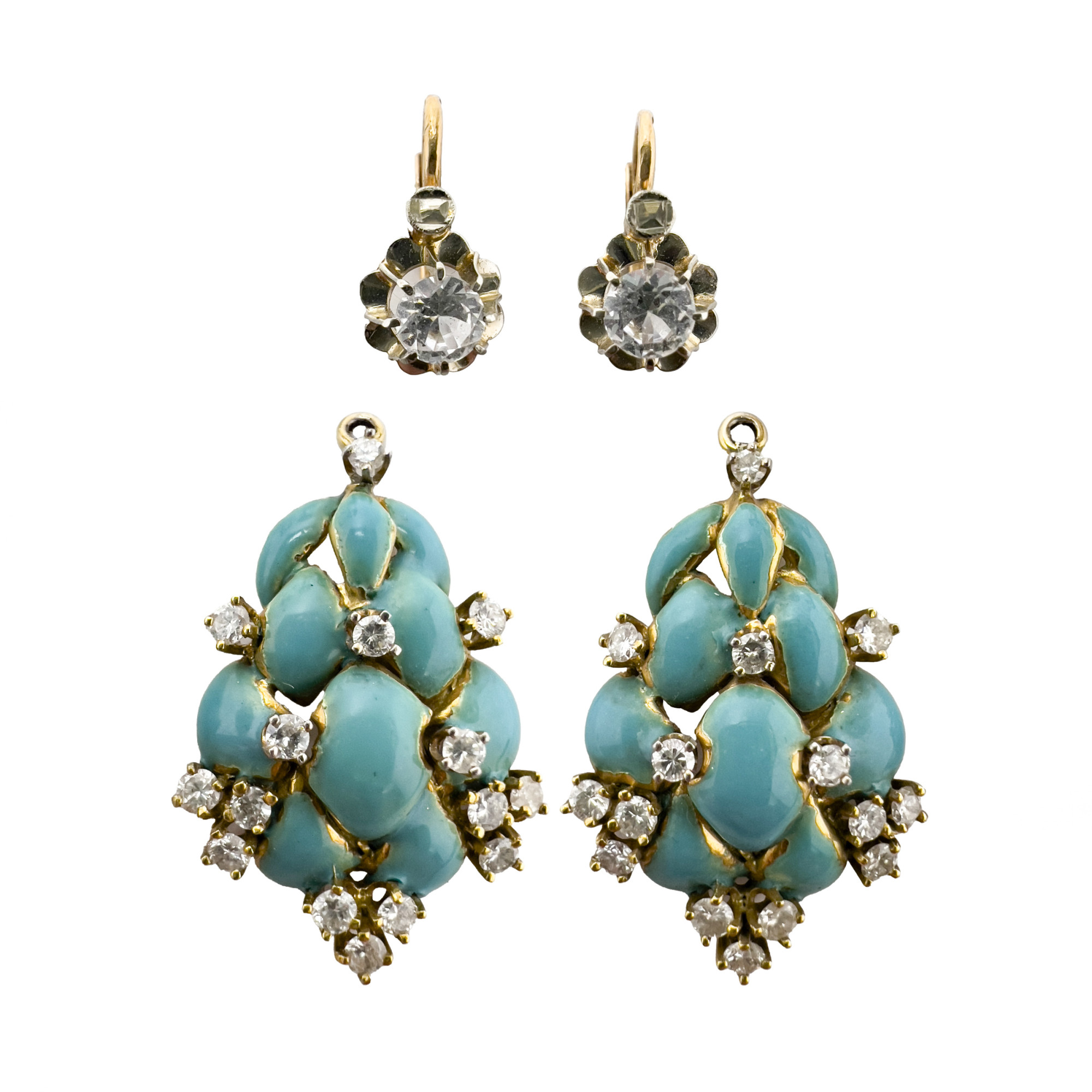 Pair of 18K gold and white topaz earring charms, and 18K gold, diamond, and enamel earrings, with lever backs