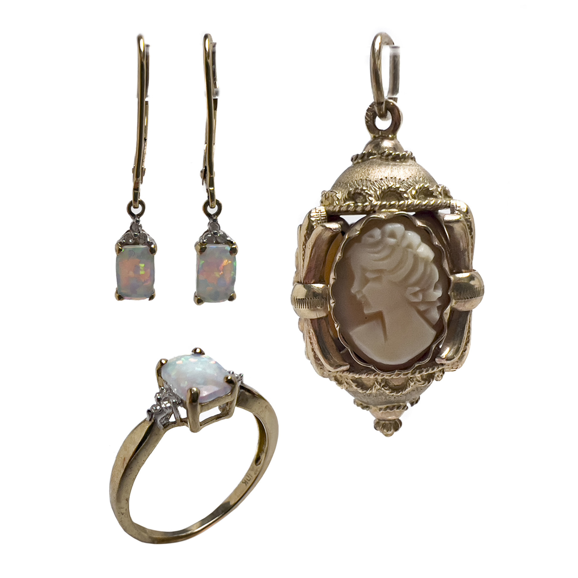 Comprising pair of 14K gold opal earrings with hinge back, 10K gold opal and diamond ring, size 7, and 10K gold cameo pendant, set with three cameos of a woman's profile