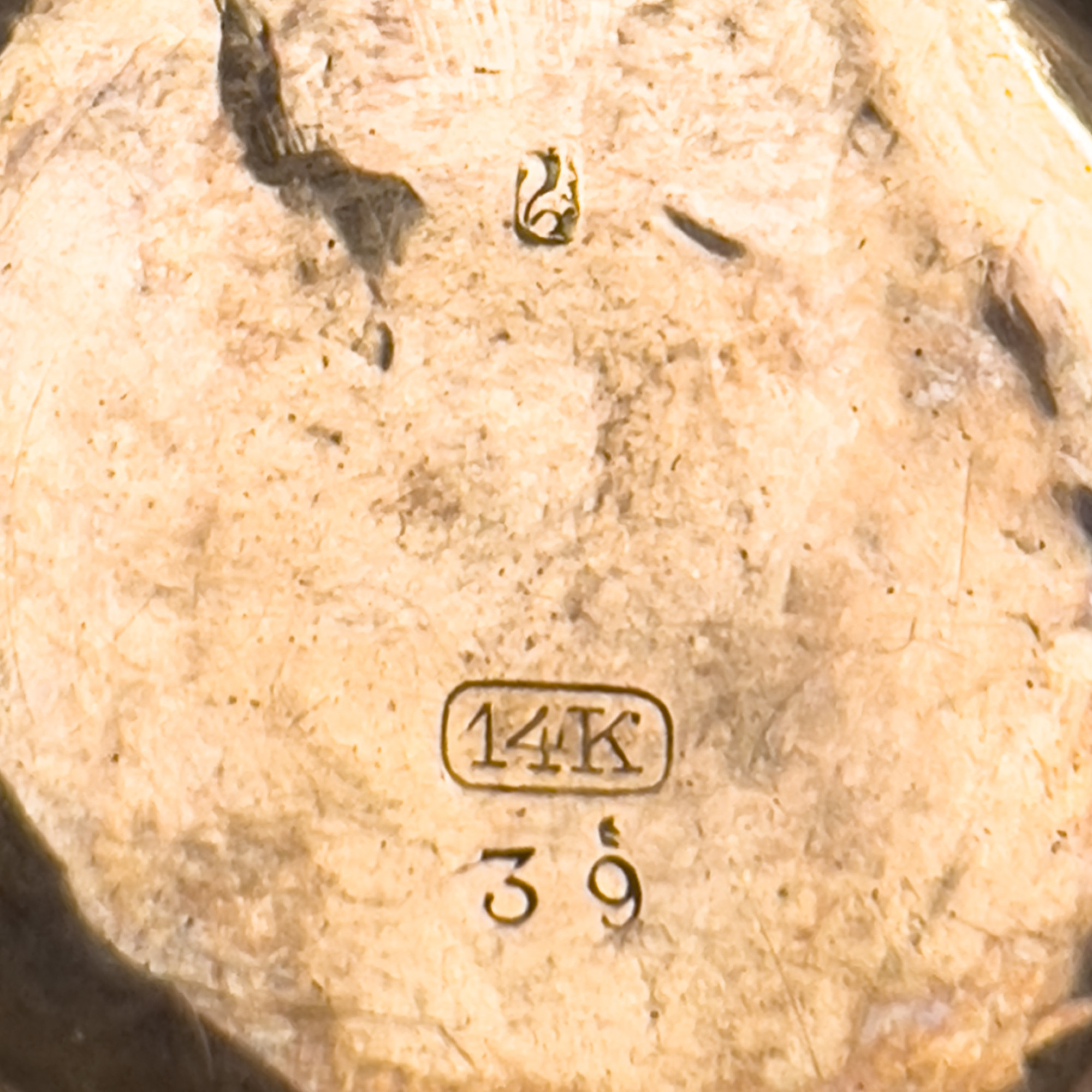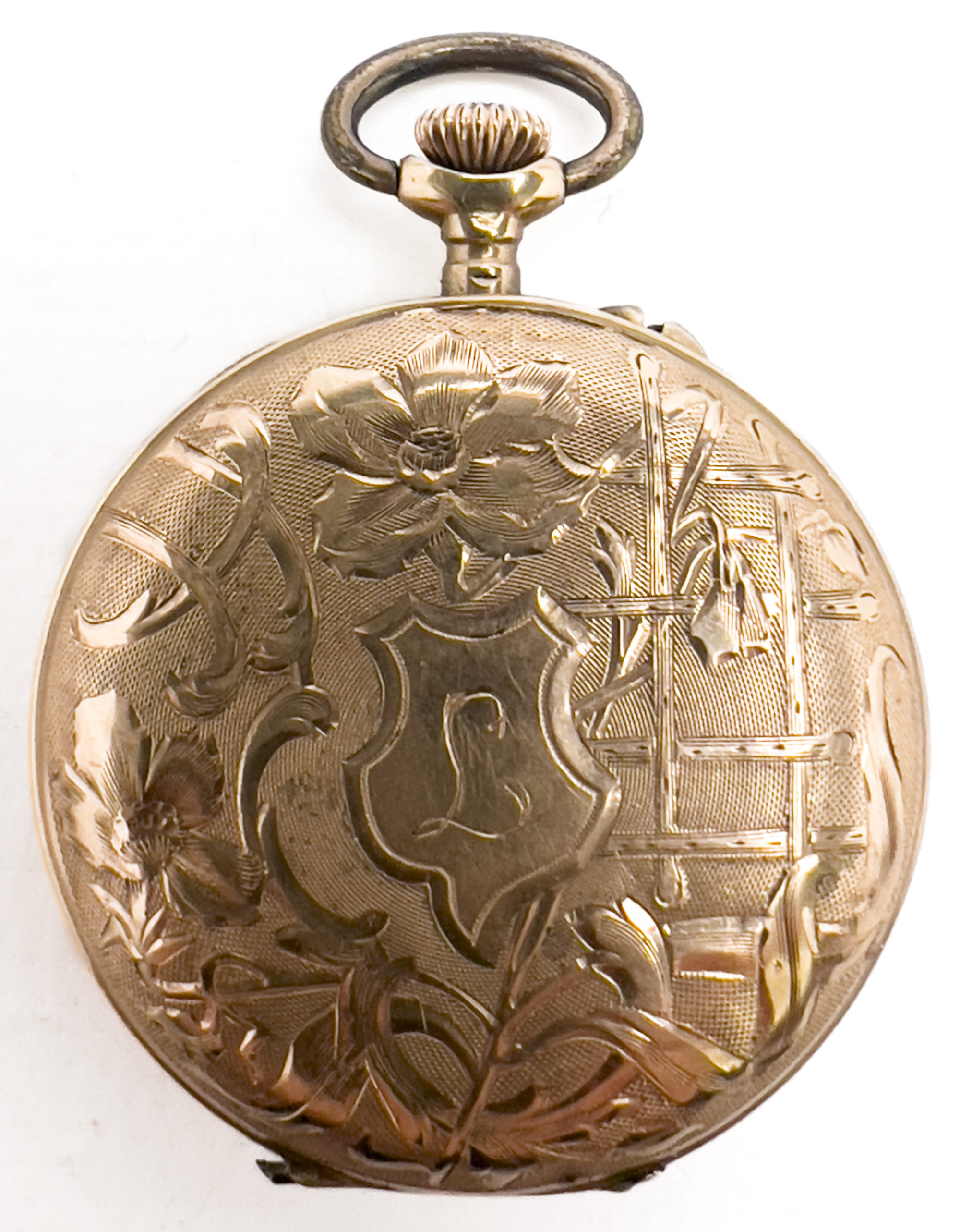 Small pocket watch in 14K gold, marked 14K to case interior, exterior case decorated with flowers, opening onto clock face with Arabic numerals