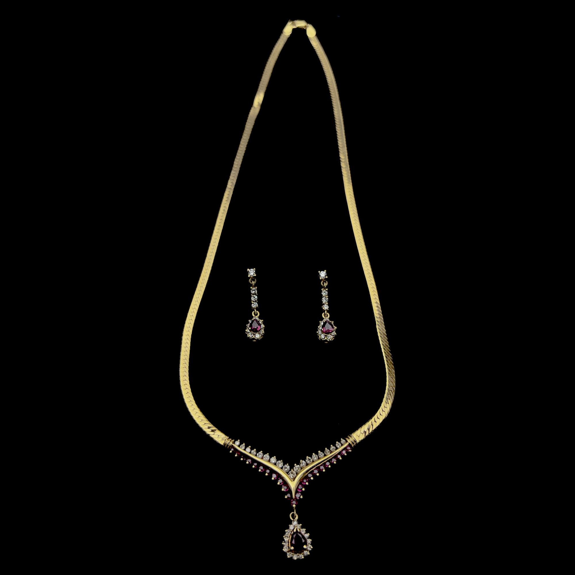 A 14k yellow gold herringbone link necklace set with 19 diamonds and 23 rubies in a V formation with a pear-cut .5 ct ruby pendant surrounded by 15 diamonds, and a matching pair of yellow gold drop earrings each set with 14 diamonds and a .35 ct pear-cut ruby