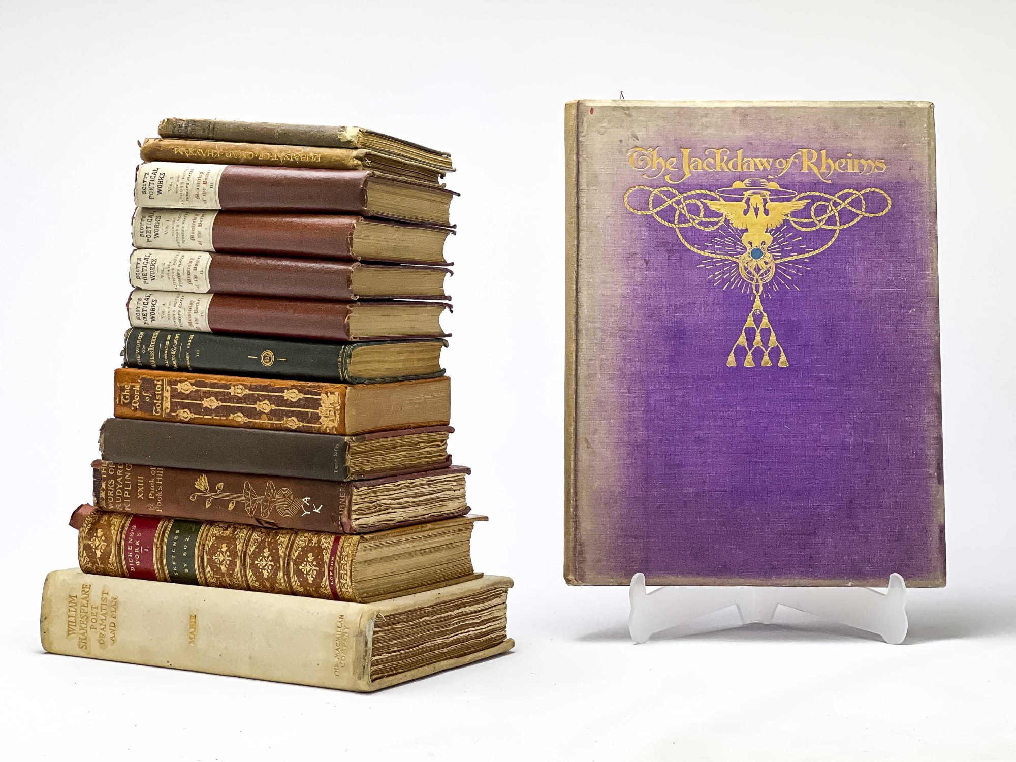 including: Sir Walter Scott, The Poetical Works of Walter Scott, Vol. I-IV, Edinburgh: Adam and Charles Black, 1880, from the library of James Hale Bates, each with bookplate, volume IV signed in ink by Bates and dated 1889, volume I inscribed 'Happy Birthday Feb. 28, 2000 Love You Sayaka Naoko...' The Rubáiyát of Omar Khayyám, London: T.N. Foulis, Boston: Le Roy Phillips, 1916, from the library of James J. and Lillian H. Doyle, with their bookplate Charles Dickens, Sketches by Boz, London: Chapman and Hall, 1874, Works of Charles Dickens Illustrated Library Edition, Vol. I, from the library of Mount Saint Mary Seminary, Hookset Heights, N.H., with their bookplate Charles Dickens, Doctor Marigold, Philadelphia: George W. Jacobs & Co., inscribed in ink 'Mrs JJ Doyle Mrs JJ Doyle' Charles Dickens, Barnaby Rudge: A Tale of the Riots of Eighty, Vol. III, New York: Sheldon and Company, Works of Charles Dickens Household Edition, 1864 Rudyard Kipling, The Works of Rudyard Kipling, Puck of Pook's Hills, Vol. XXIII, New York: Charles Scribner's Sons, 1906 Thomas Ingoldsby, The Jackdaw of Rheims, Philadelphia: John C. Winston, 1914, inscribed in pencil: 'This book belongs to the Davidson Group' and further inscribed and signed in pen: '...I saw it and I loved it-I hope you do / Charlie Durning 12/27/73' Lord Dunsany, A Dreamer's Tales, Boston: John W. Luce & Company, no date, ca. 1910 The Works of Leo Tolstoi, One Volume Edition, New York: Walter J. Black, 1928 Hamilton Wright Mabie, William Shakespeare, Poet, Dramatist, and Man, New York: The Macmillan Company, 1900, number 77 from an edition of 150 and signed by Mabie