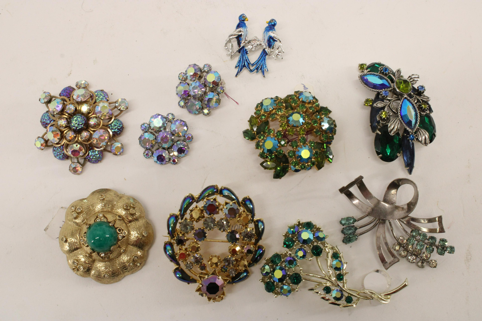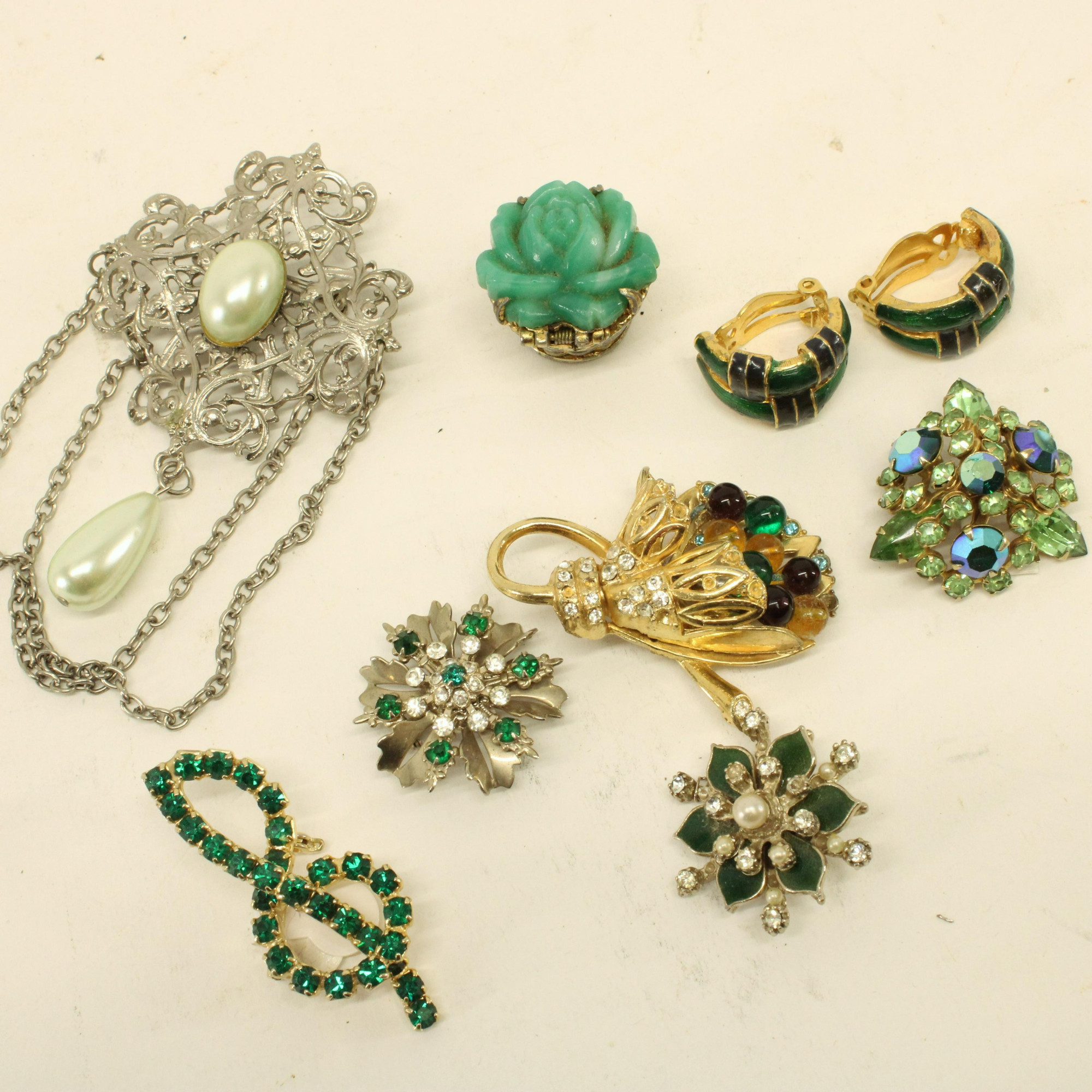 Large group of gold tone costume jewelry with green and teal accents. Some designer including David Hill, Kenneth Jay Lane, Monet, PSK. Dimensions: Various Property from a Roxbury, CT residence (JLOM8231/LOT)(EL)