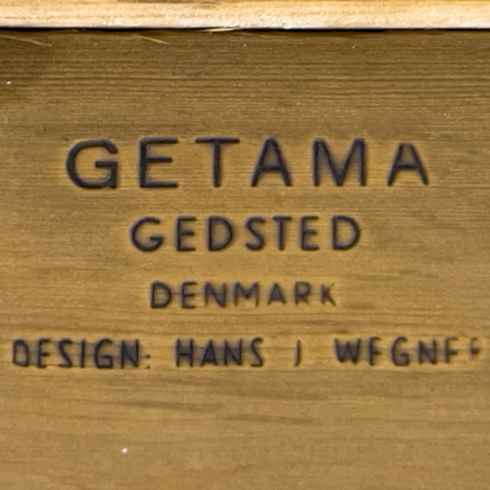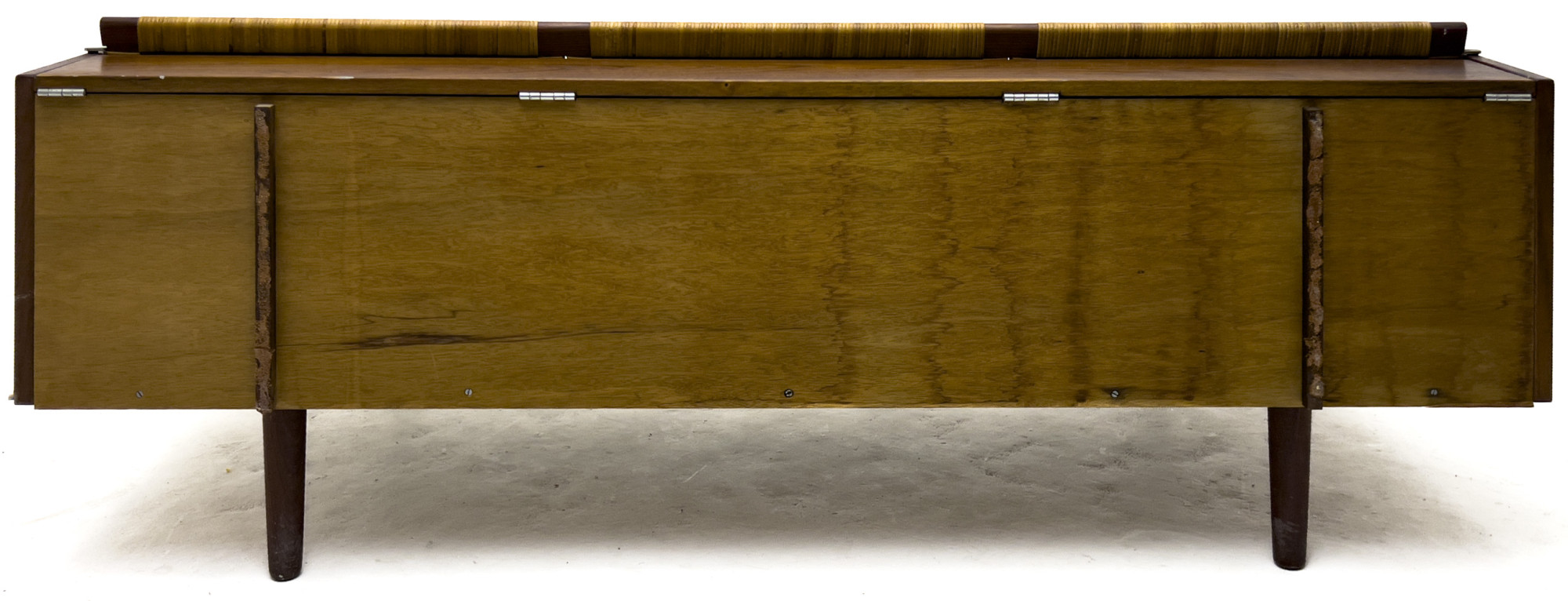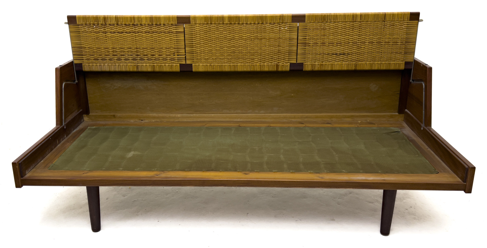 For Getama, model GE 7, teak frame resting on four turned and tapered legs, woven cane seat, with back opening to reveal space for storage, transforming into a single bed, with blue upholstered mattress