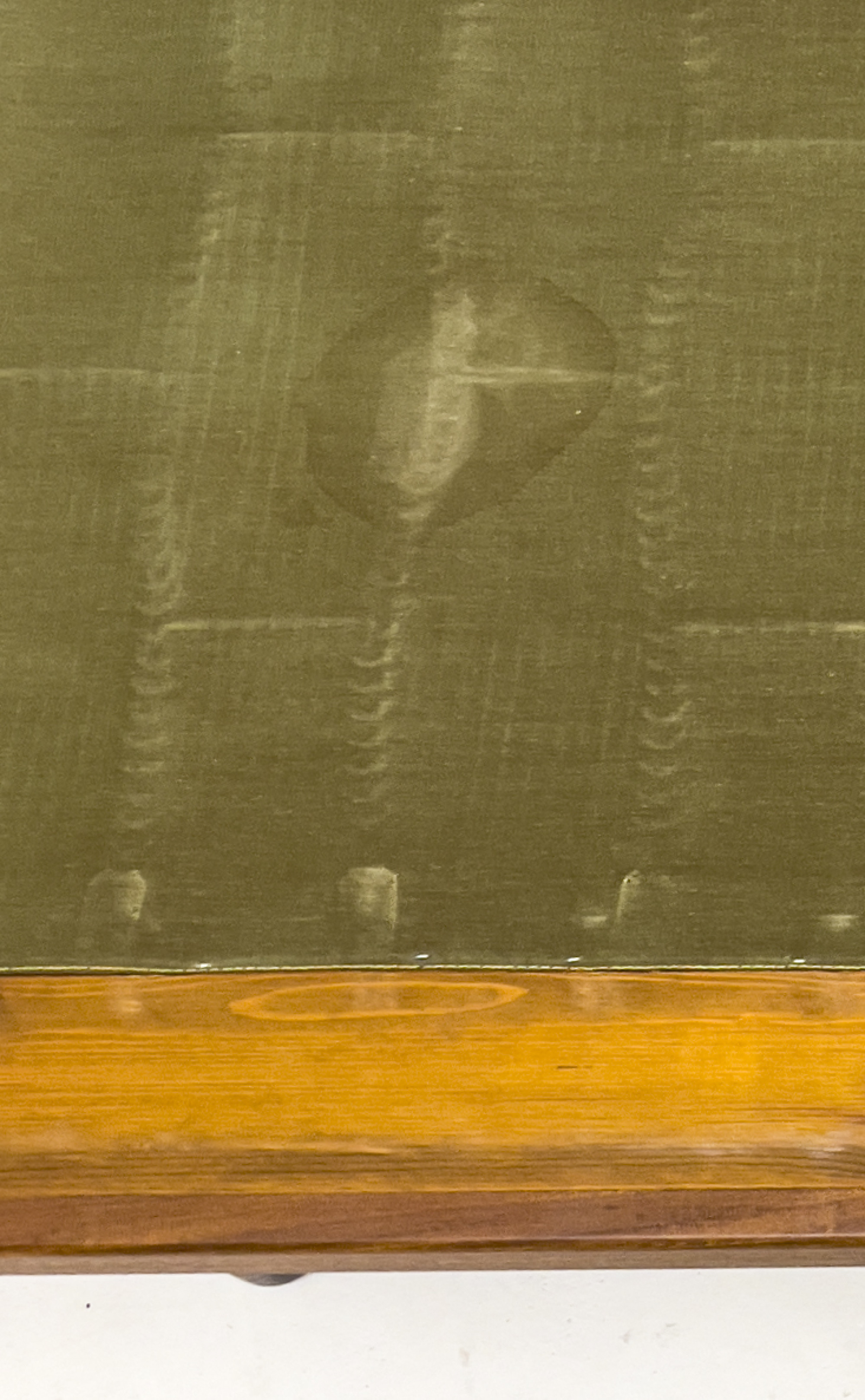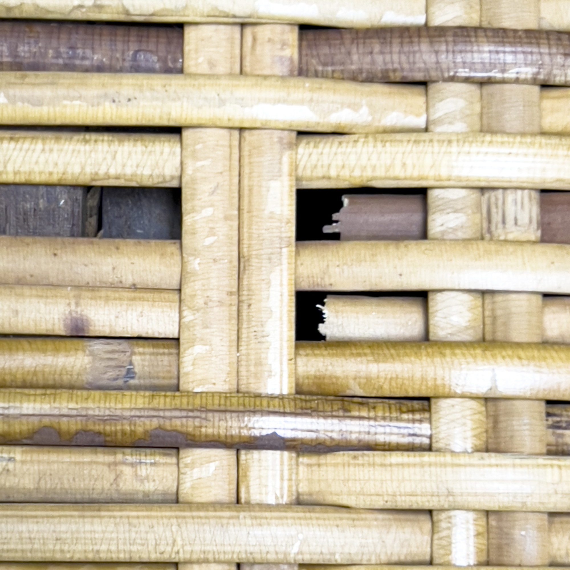 overall good condition, with some areas of minor water stains to upholstery and wood, some other scattered abrasions and scuffs, with some breaks and minor losses to caning