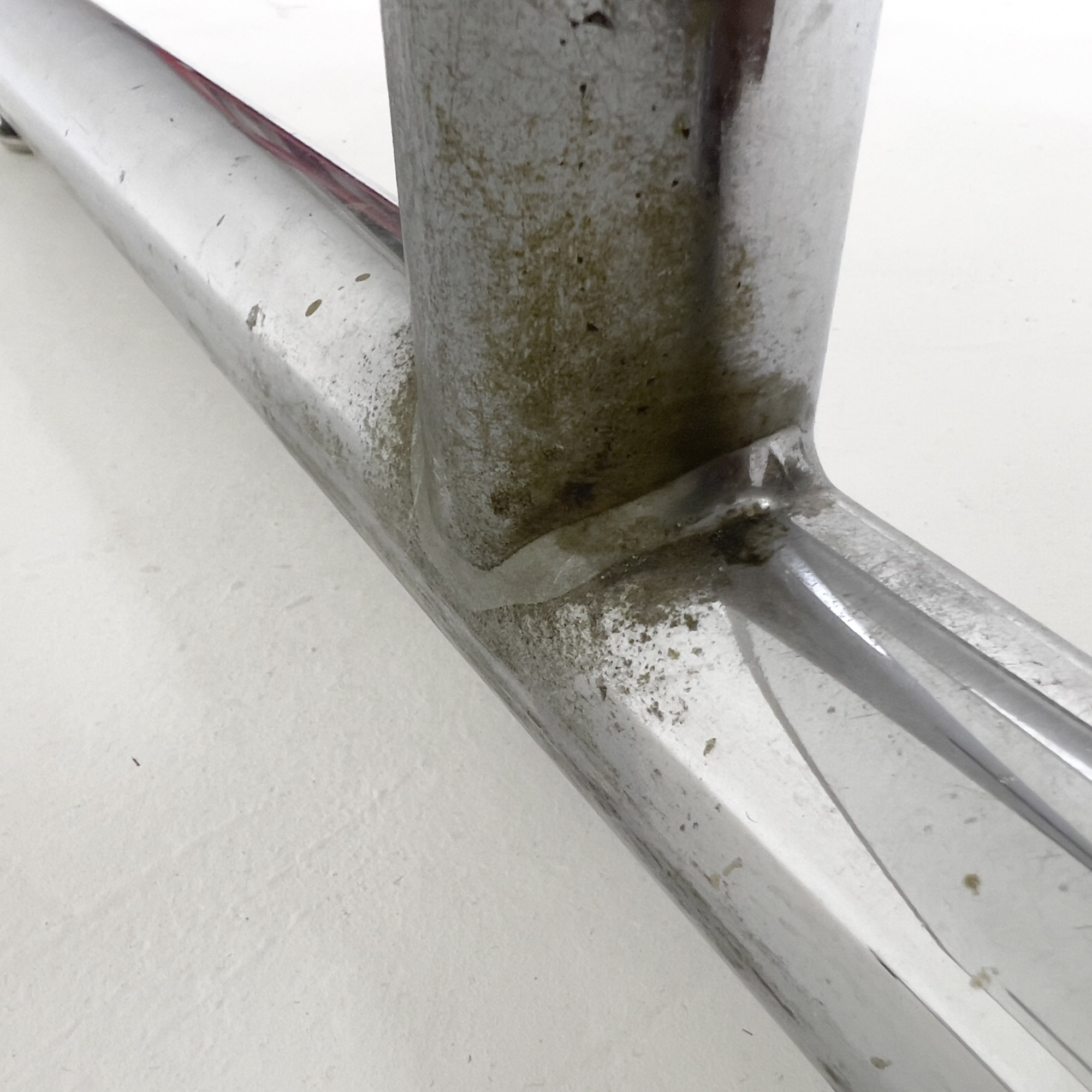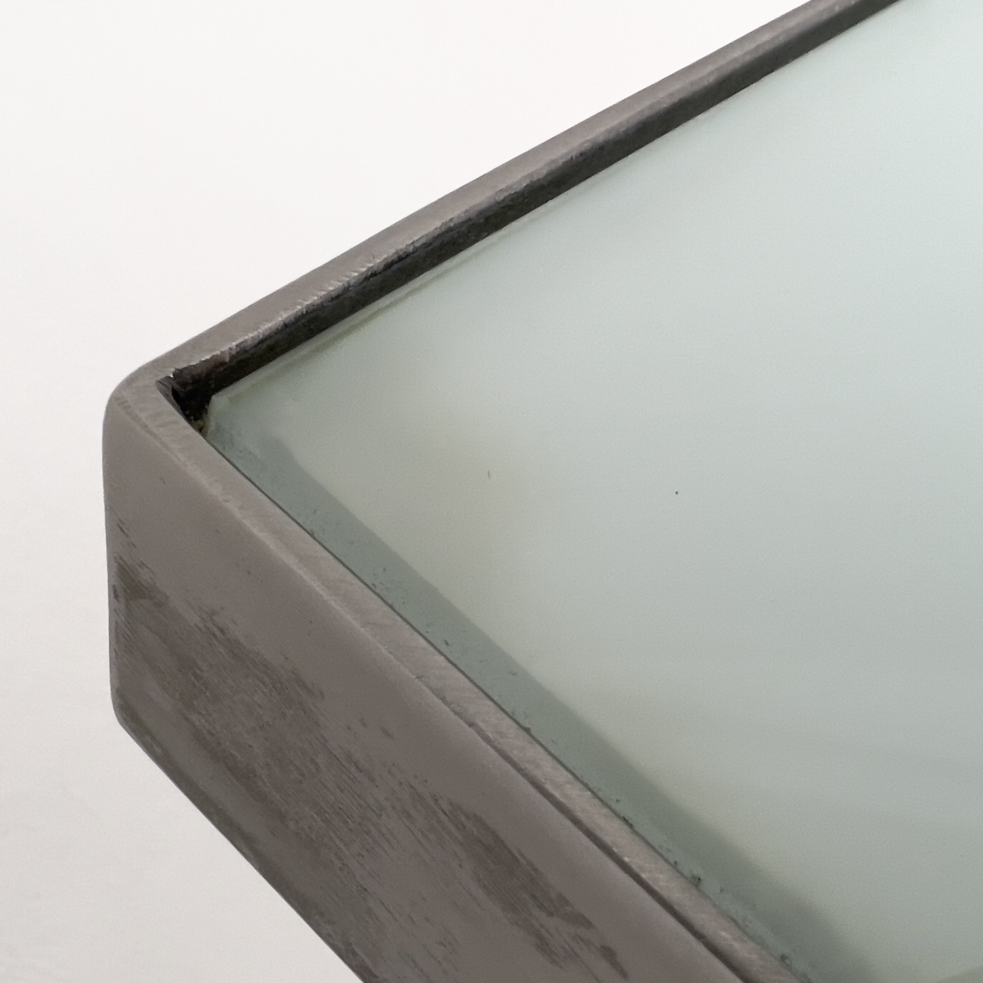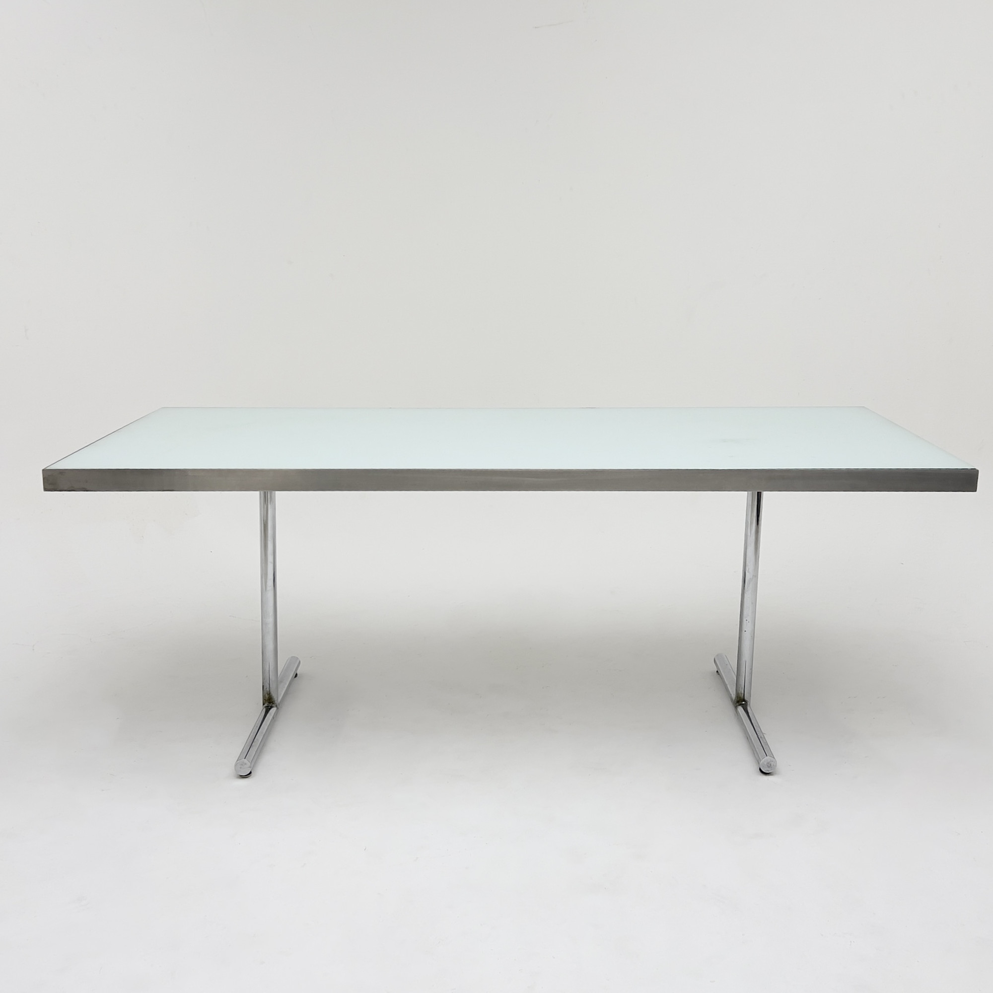 Large Table/Desk with a chrome steel frame and a glass top reinforced by a layer of white painted plywood