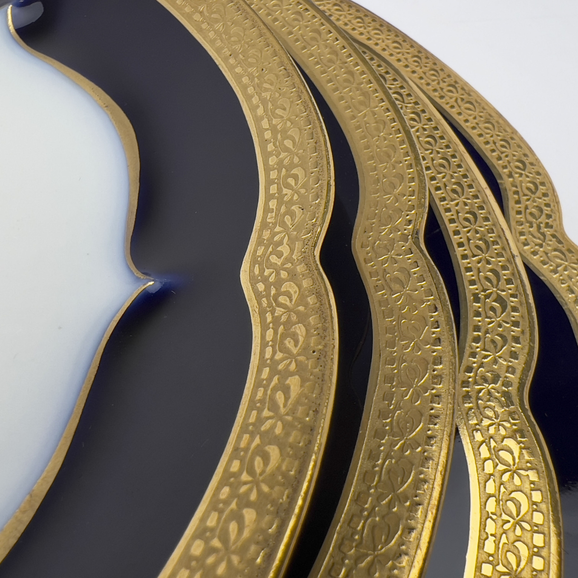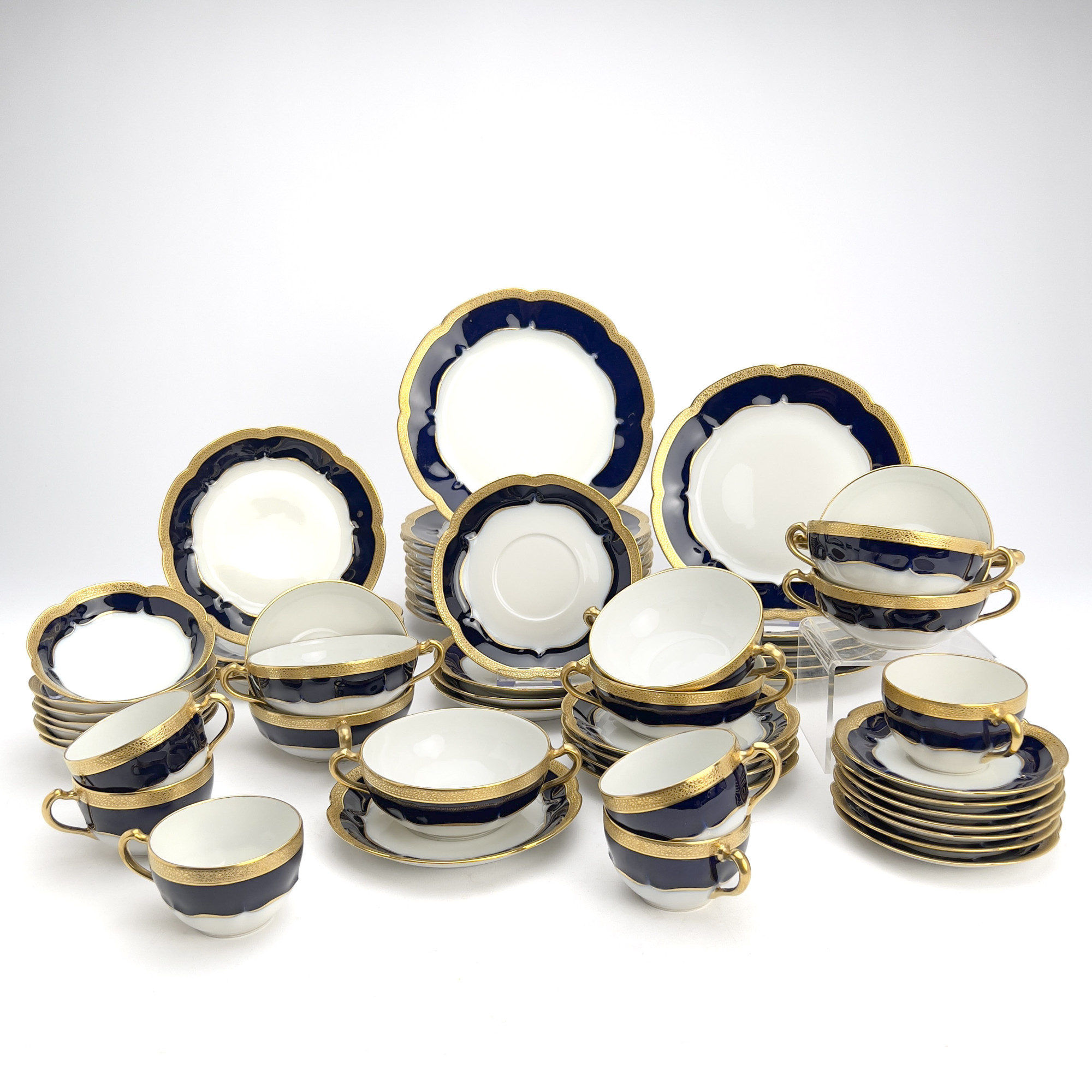 Haviland and Co. Limoges china, Queen pattern, 58 pieces with an ornate and scalloped gold encrusted edge and a cobalt blue band. Partial service includes 9 dinner plates, 6 salad plates (1 repaired), 4 bread plates, 7 berry bowls, 9 boullion bowls, 9 boullion bowl saucers, 6 tea cups, 7 saucers