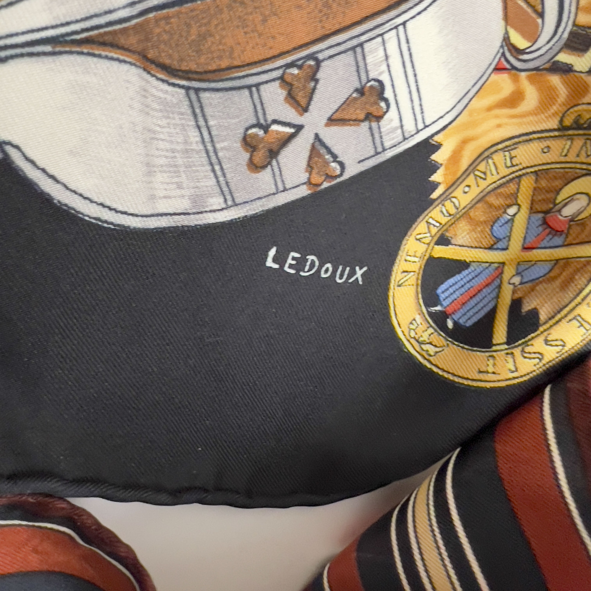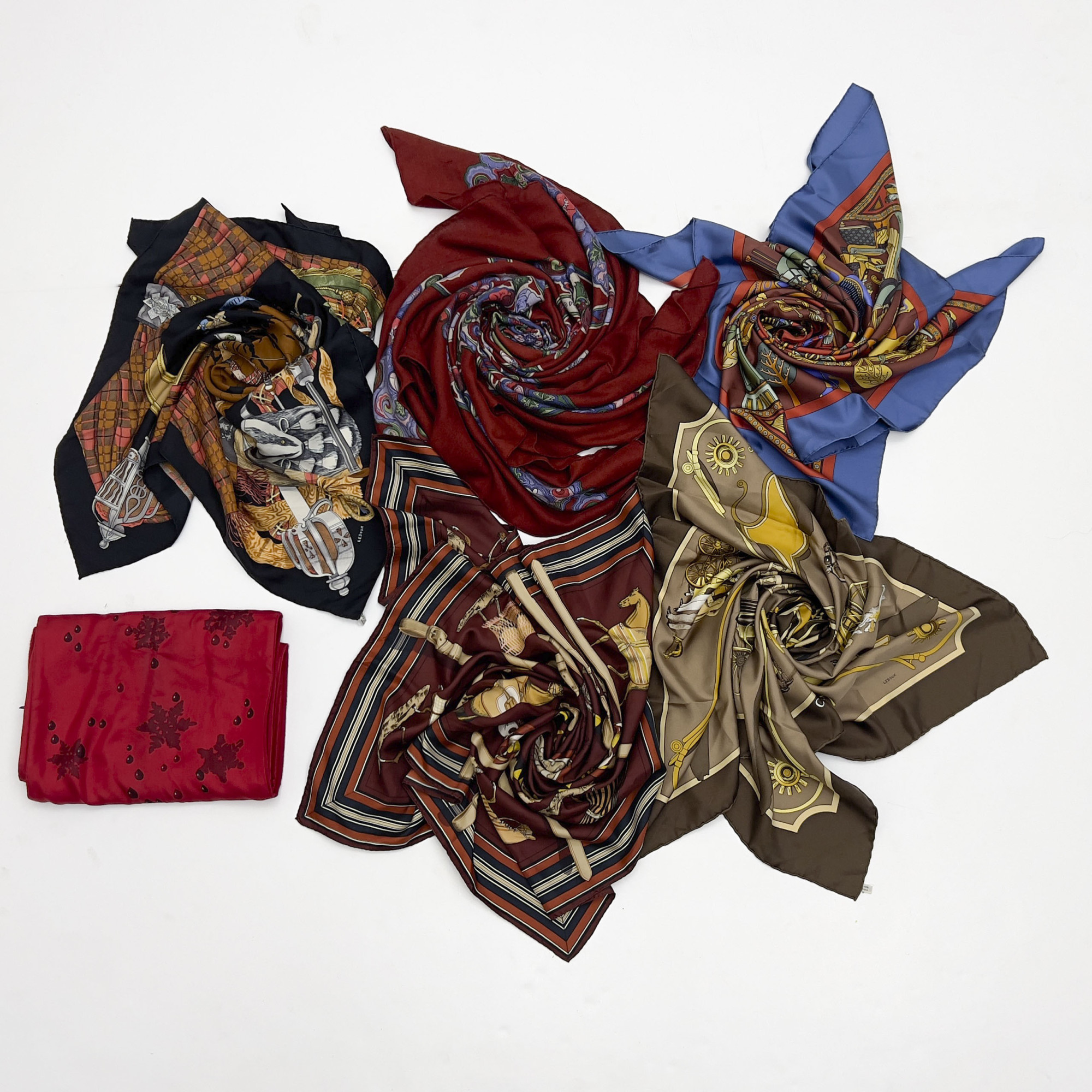 Hemès scarf group, comprising of Couvertures et Tenues de Jour by Jacques Eudel, Scotland by Phillippe Ledoux, Carrossier by Phillippe Ledoux, Persepolis by Sophie Koechlin, and two unknown designs one featuring snowflakes on a red background and the other featuring anemones