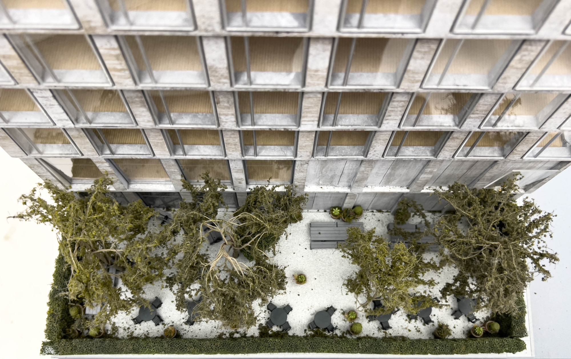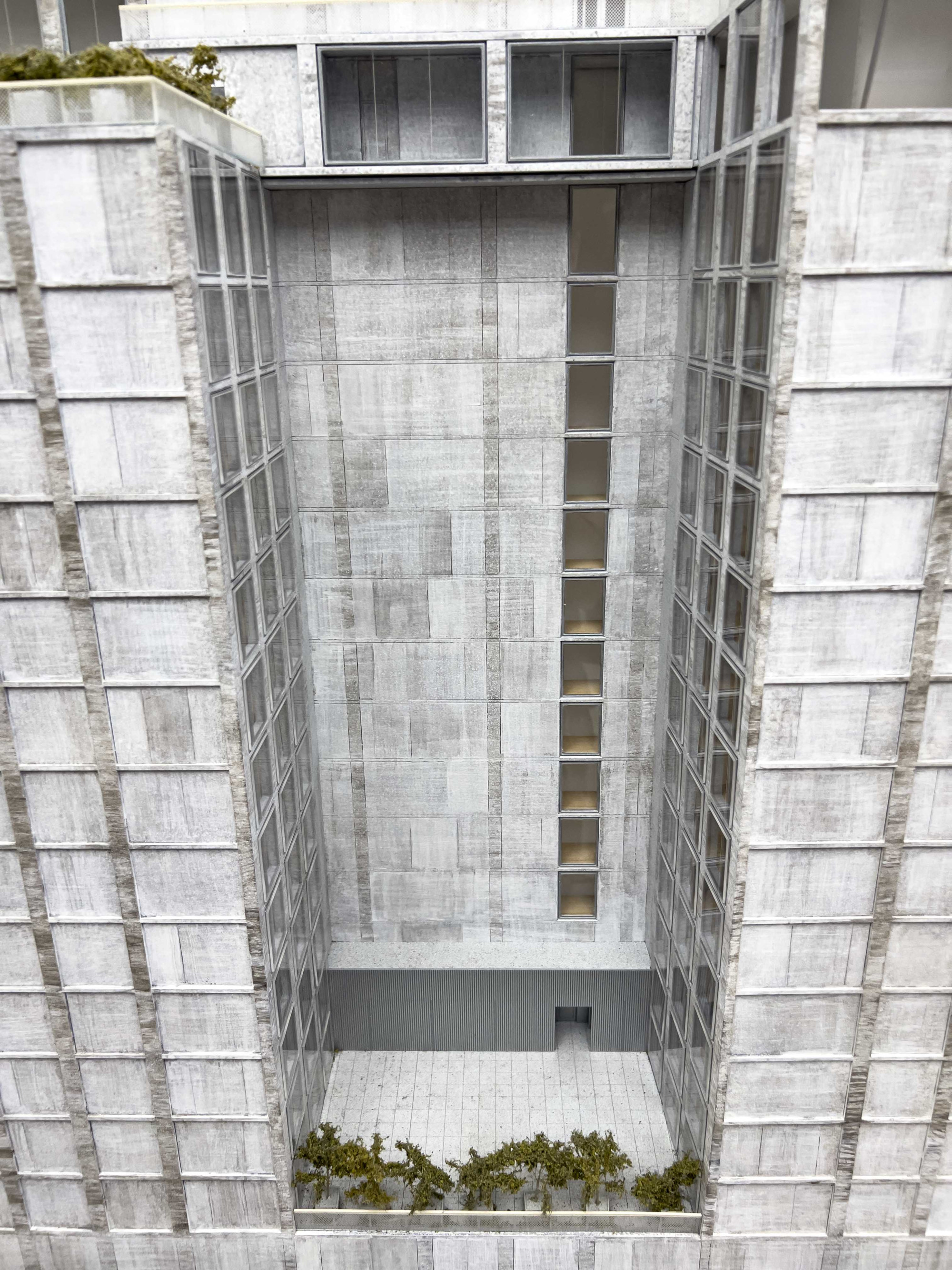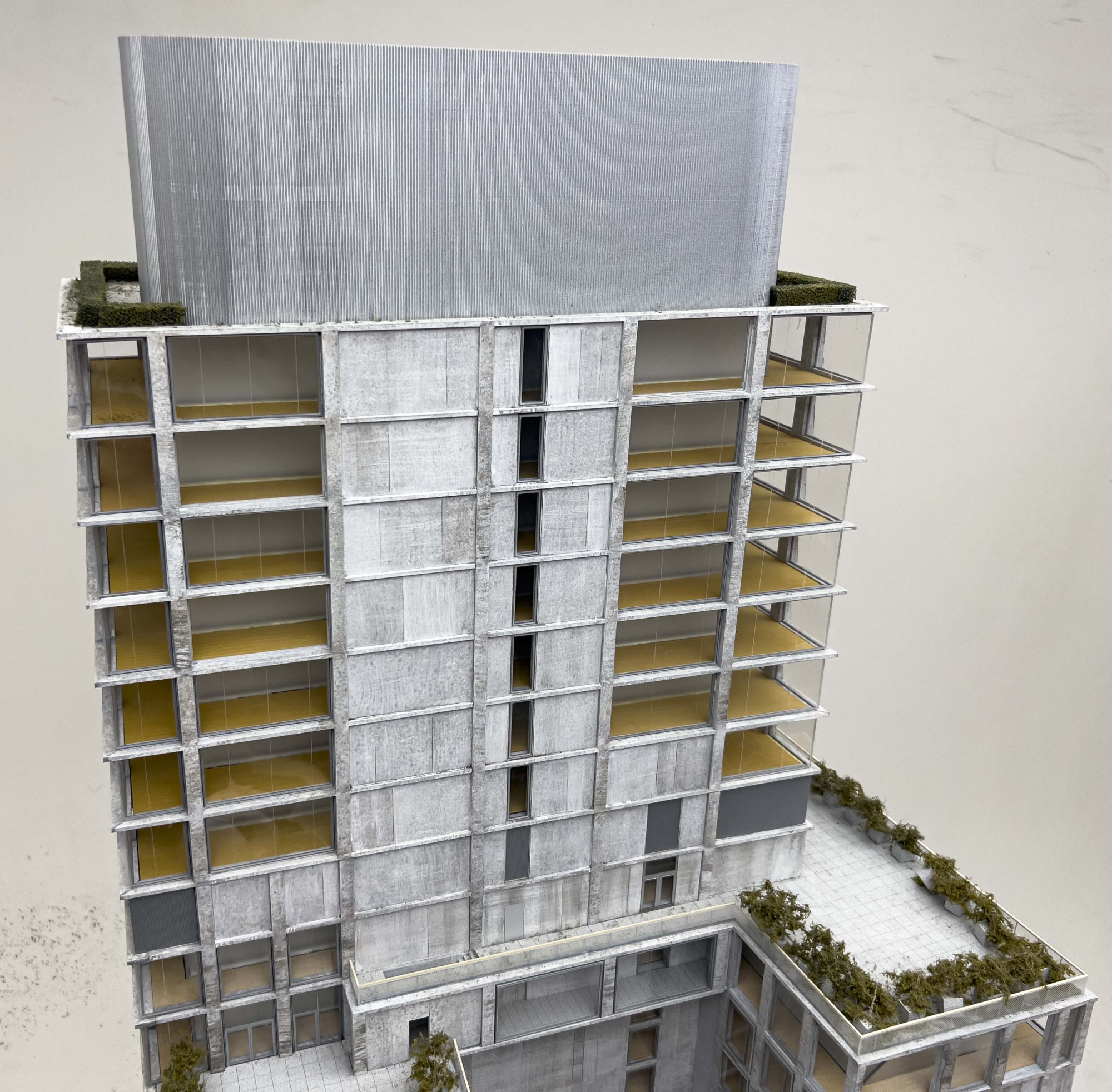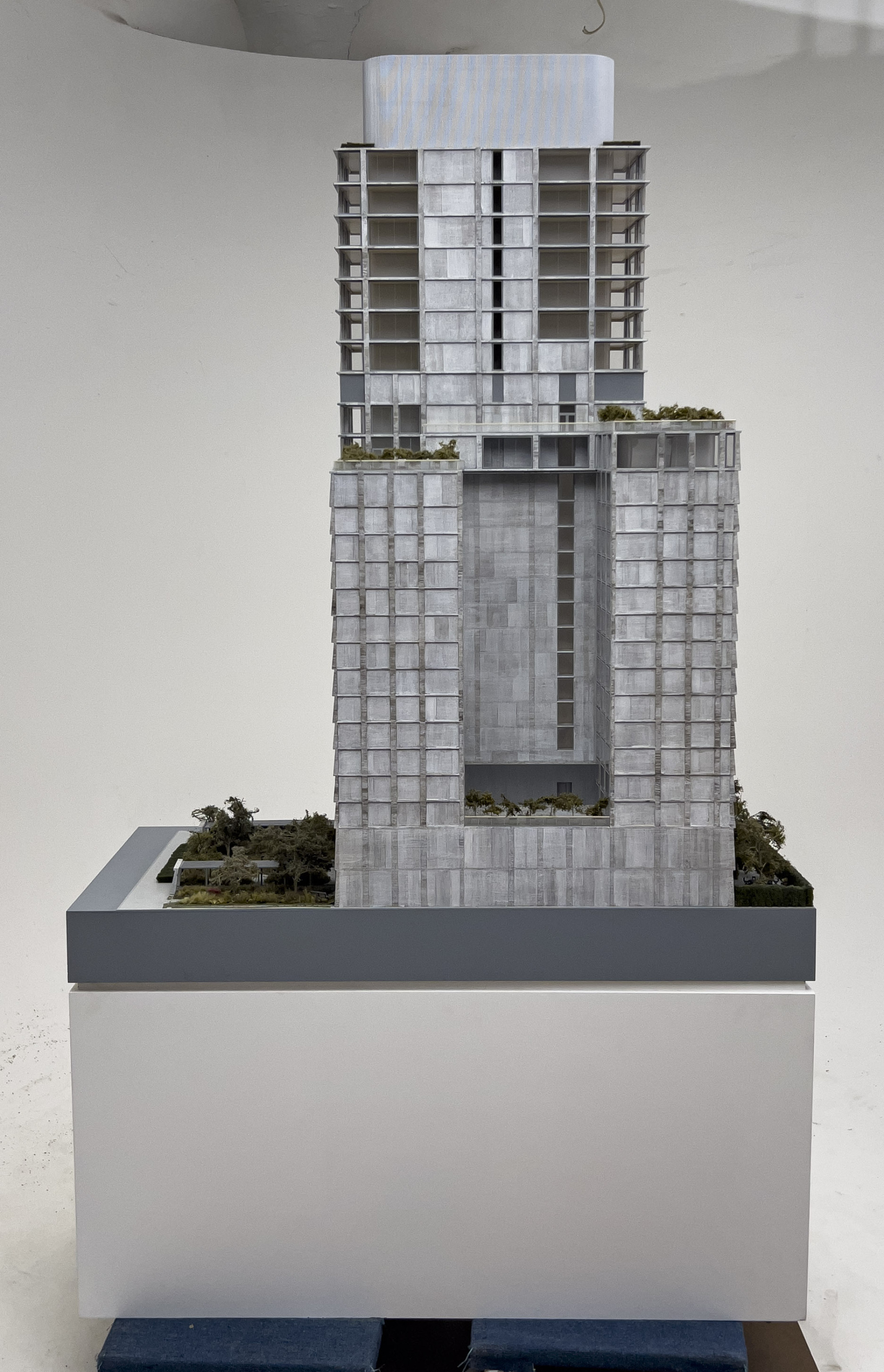 Architectural model of 409 215 Chrystie Street, NYC building, resting on laminated wood base, with LED lights and wiring system to underside