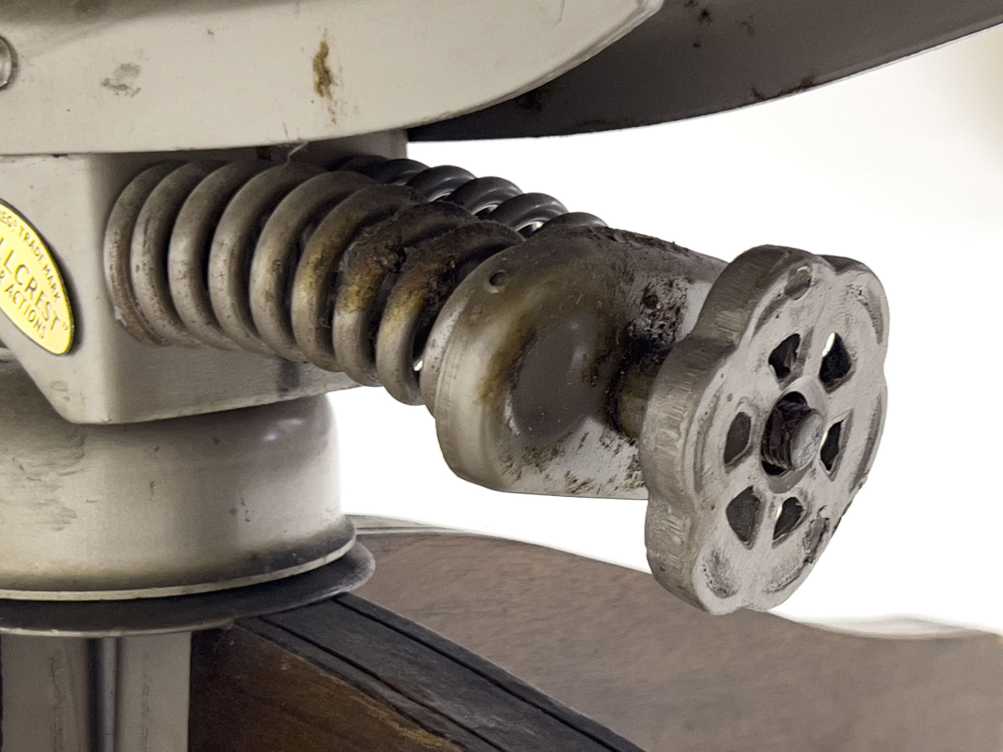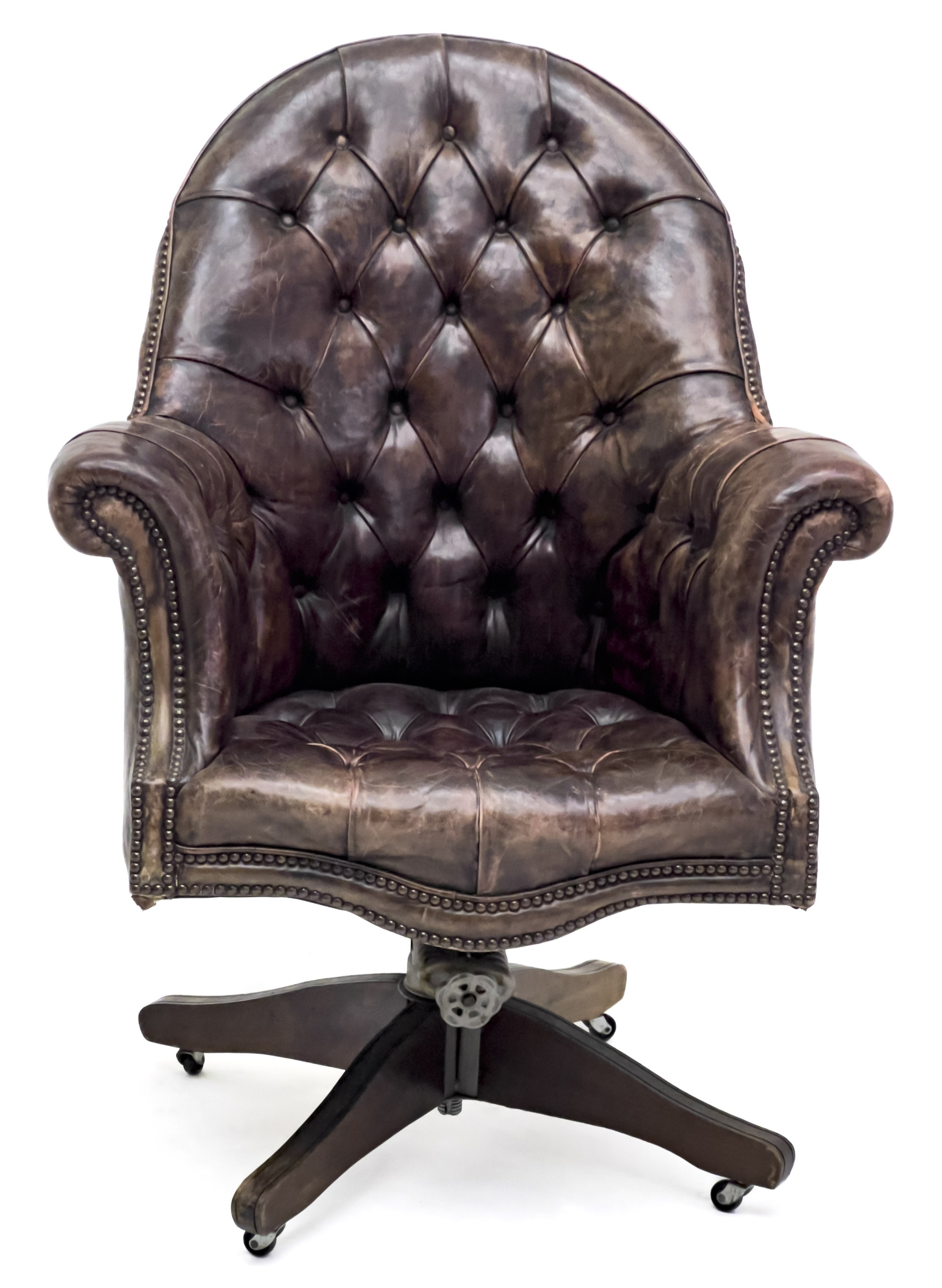 Tufted seat and high back, with scrolled arms and studded finish, raised on its original double spring, Hillcrest base with swiveling casters
