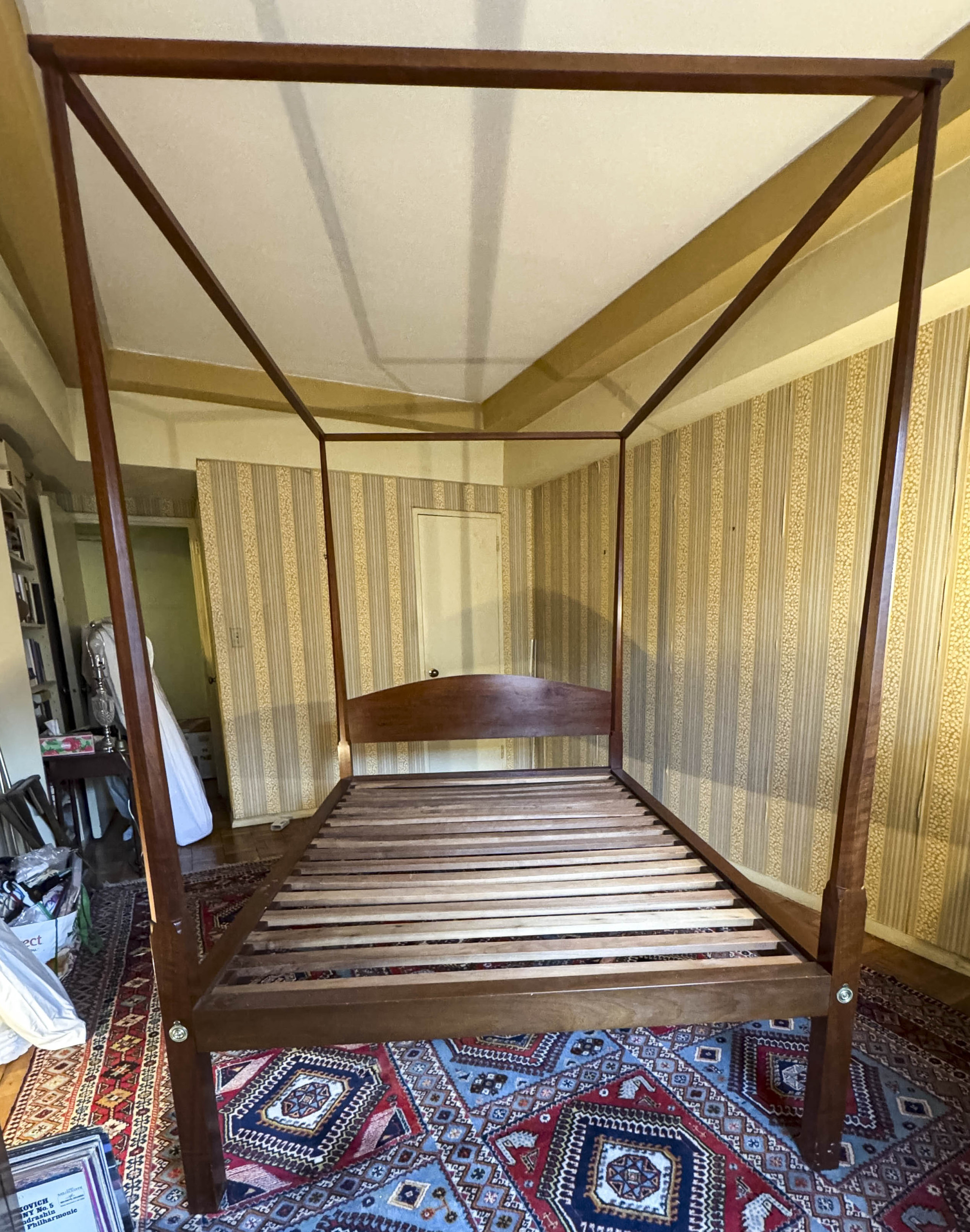 Full sized four post bed frame, tapered posts and rectangular canopy, platform raised on 4 square legs, approximately 20 inches high