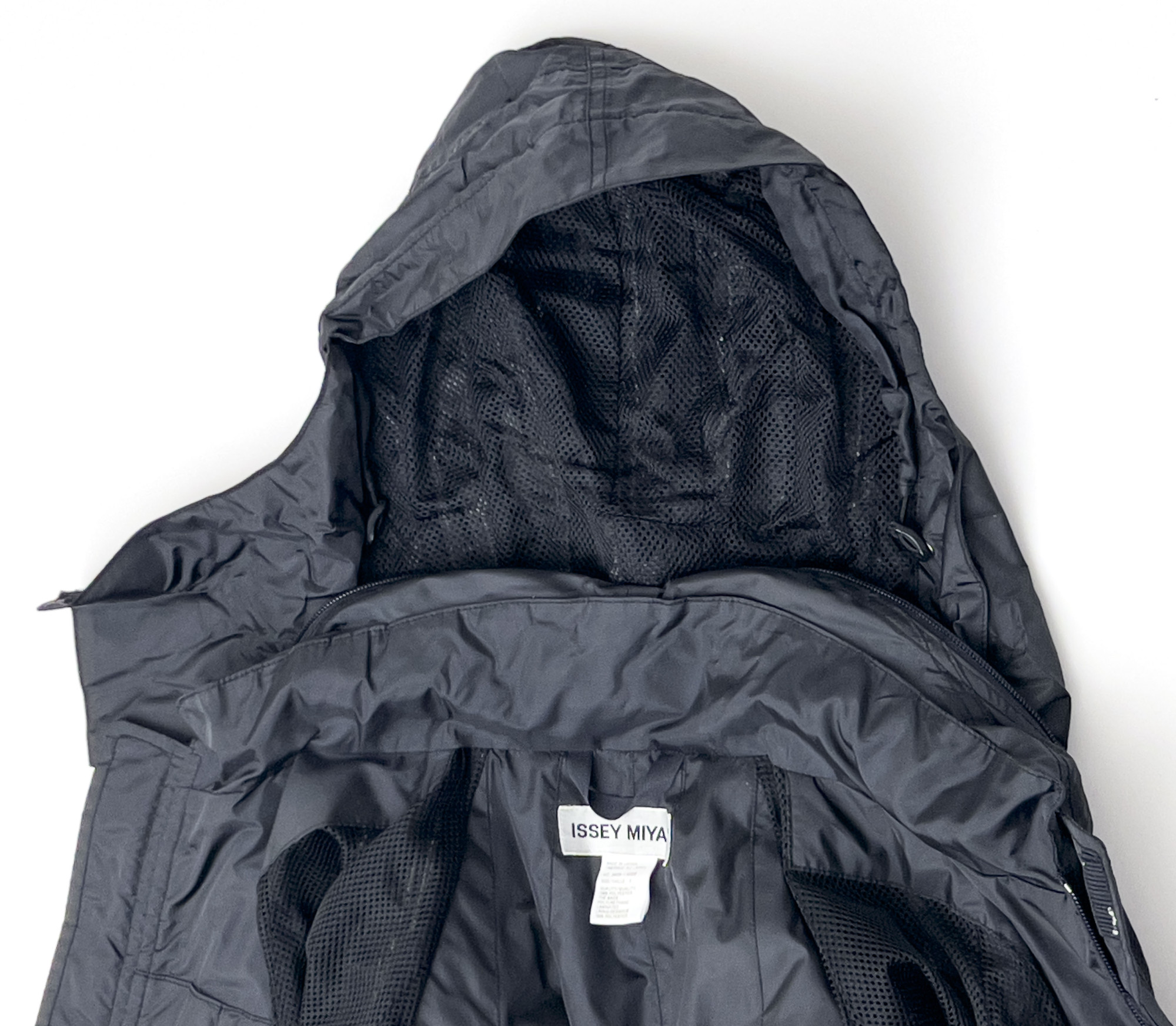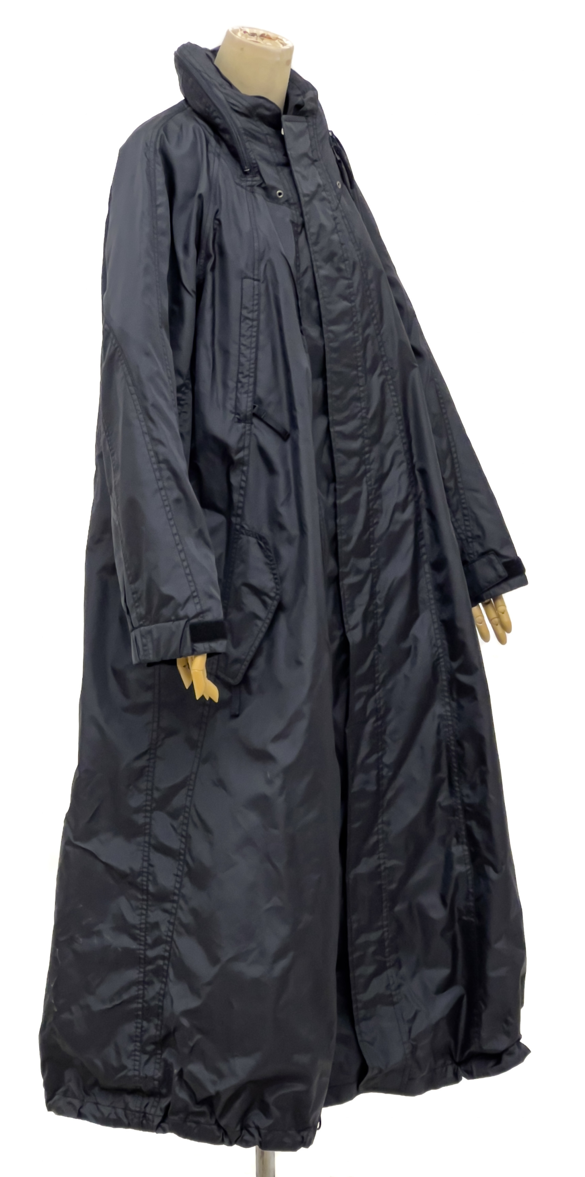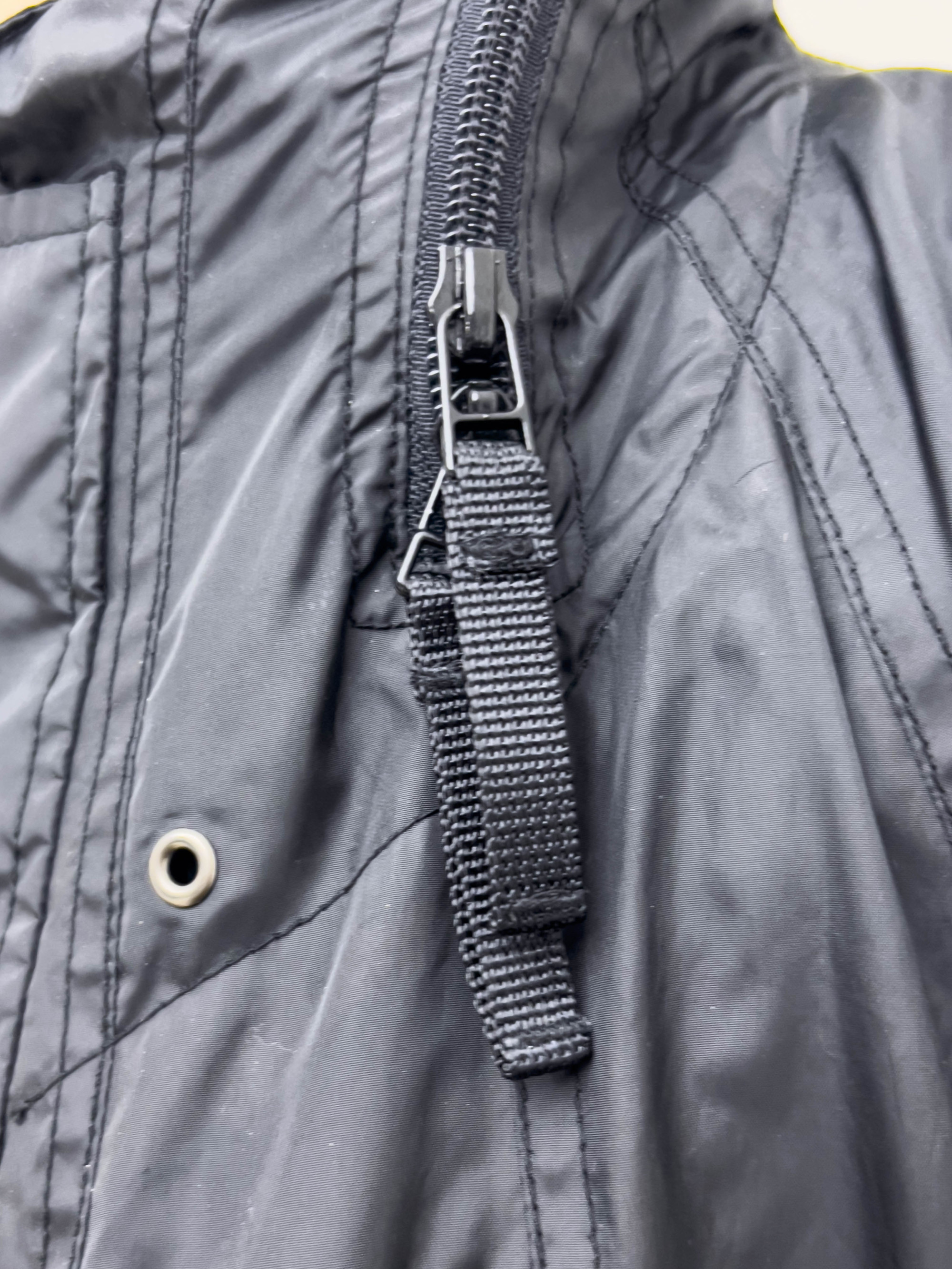 Black parachute coat, with long zipper closure and hood, size 3, 100% polyester
