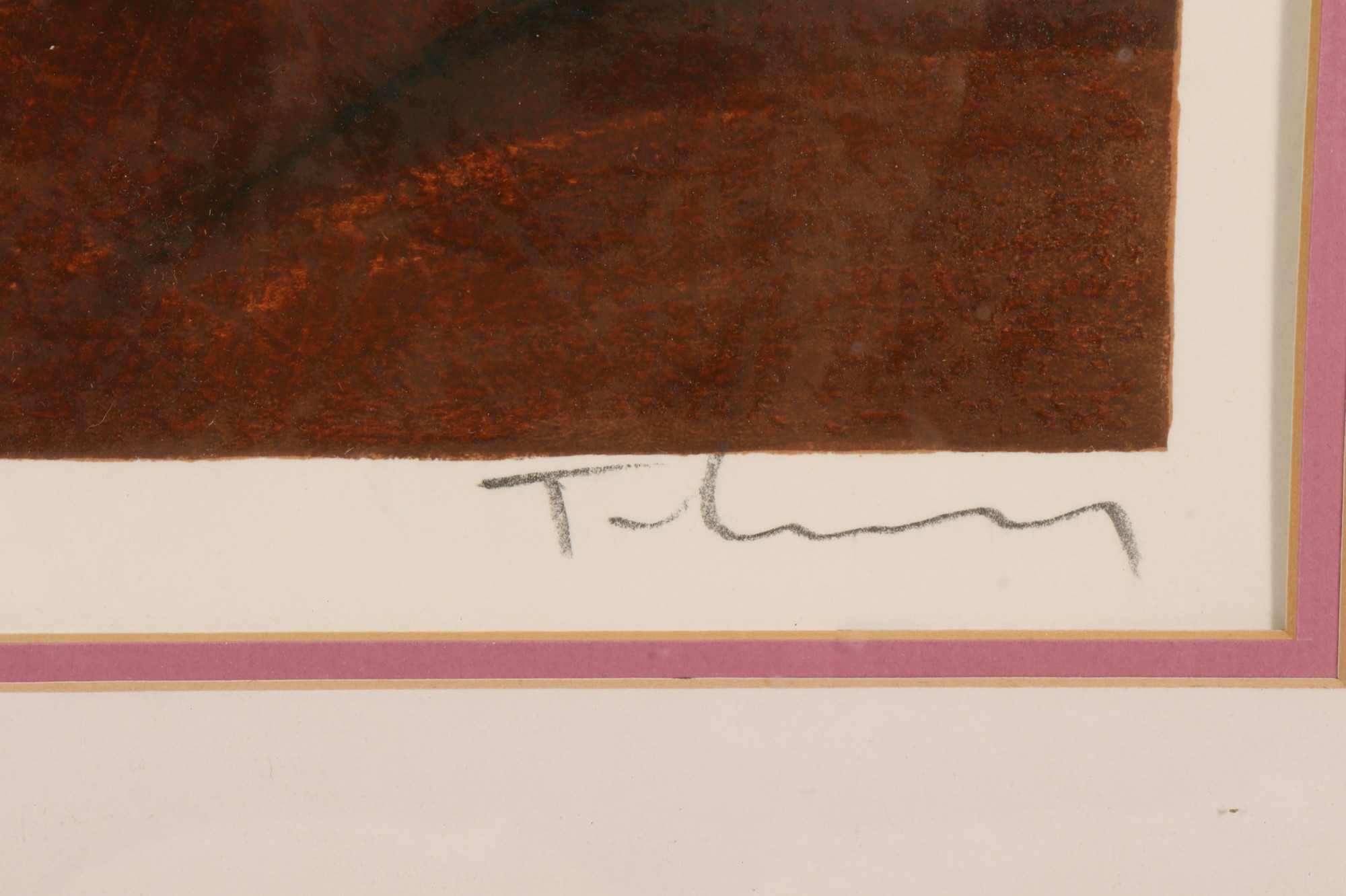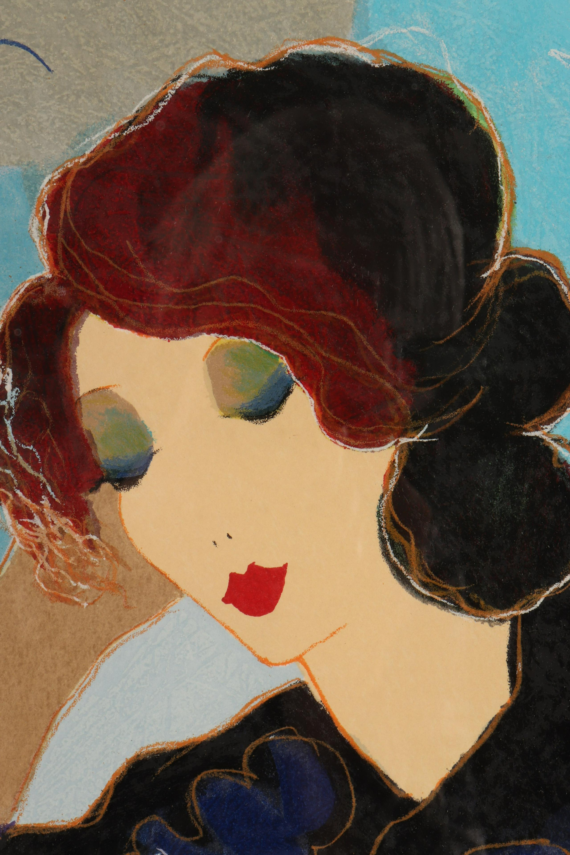 Woman in floral themed dress and interior decoration. Thermographic sheen highlights to print surface. Signed LR and edition numbered 211/350 LL, both in pencil. LL with partially visible embossed stamp Givon Prints. Clean, near new frame, double matted. Ready to hang.