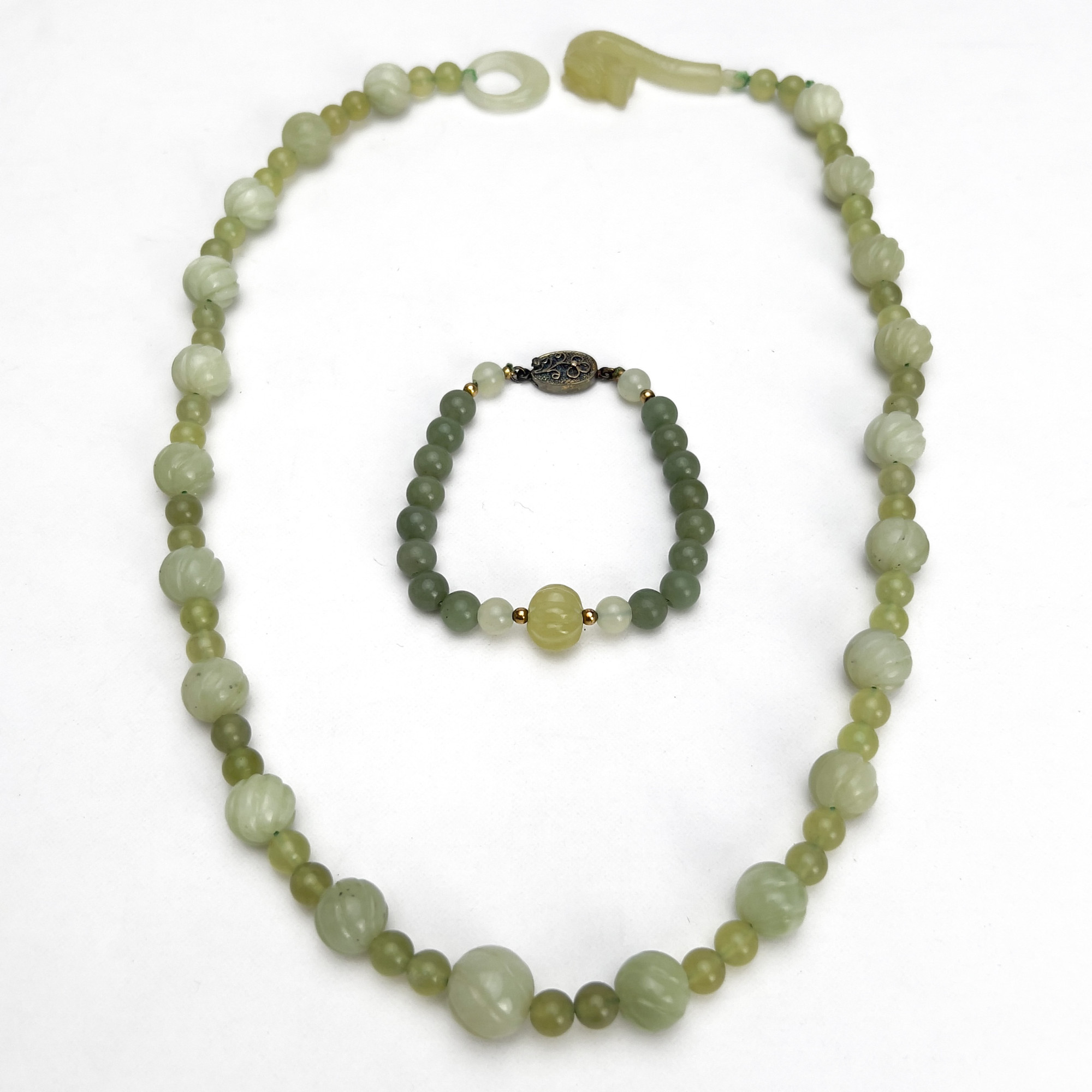 A two tone jade necklace and bracelet, bracelet with clasp stamped "Silver", necklace with a carved jade clasp.