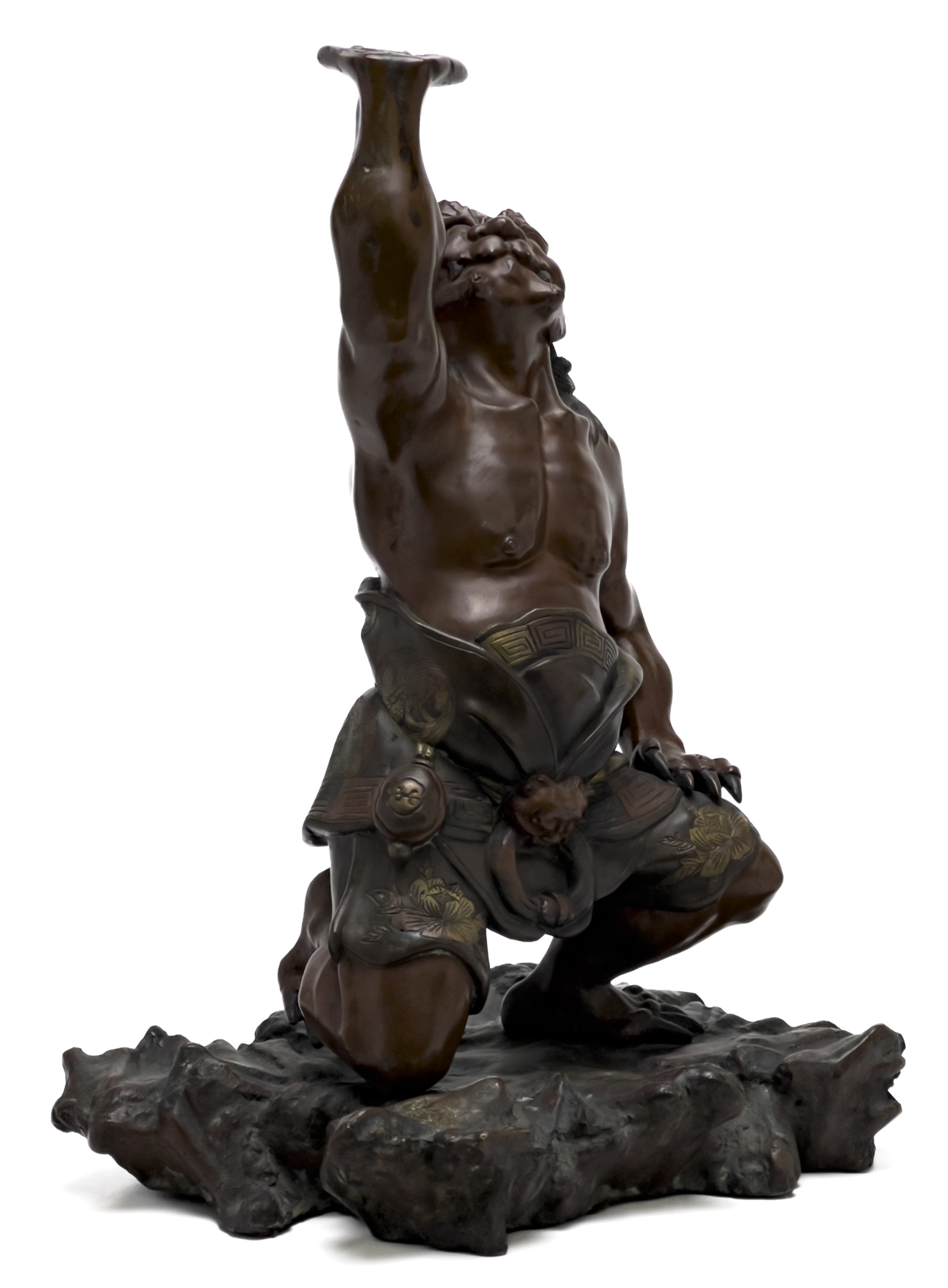 Japanese bronze figure of an oni (demon), copper and gilt patination on the horned figure with tightly curled hair and fierce visage, decorated brocade-patterned robes standing on a naturalistic base