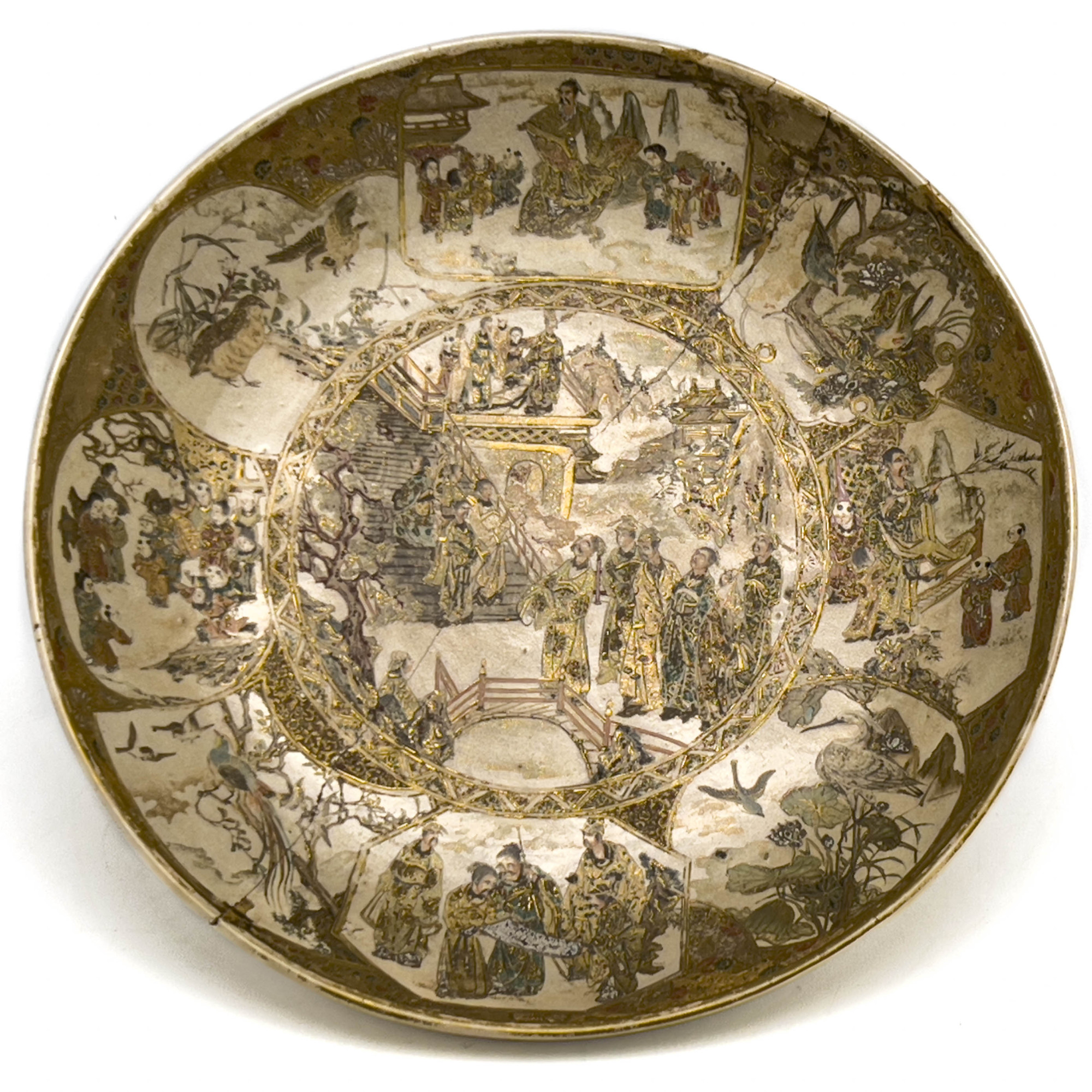 Japanese Satsuma charger with court and garden scenes in shaped gilt panels to face of charger