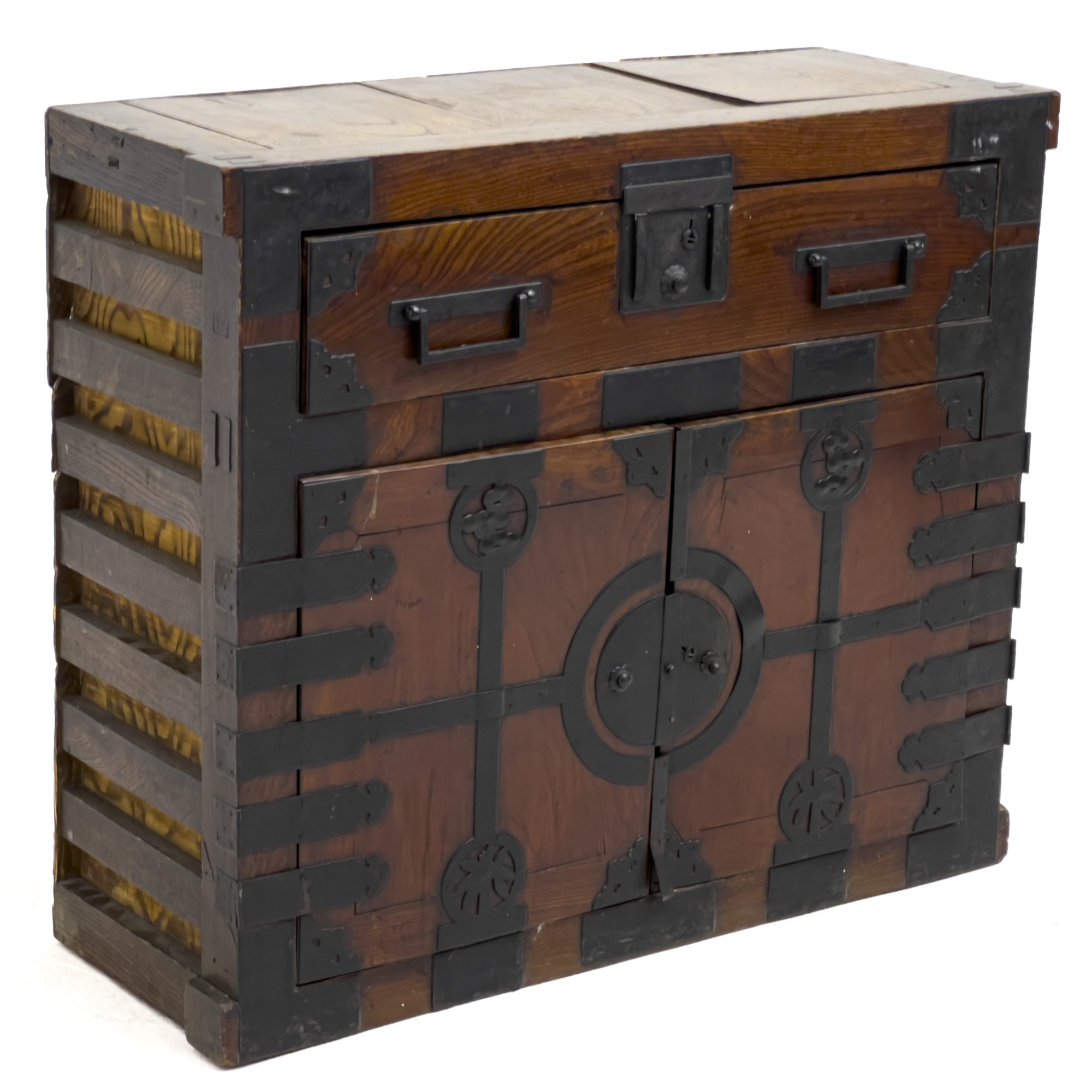 Tansu chest fitted with drawer above two doors, opening onto various shelves and three small drawers