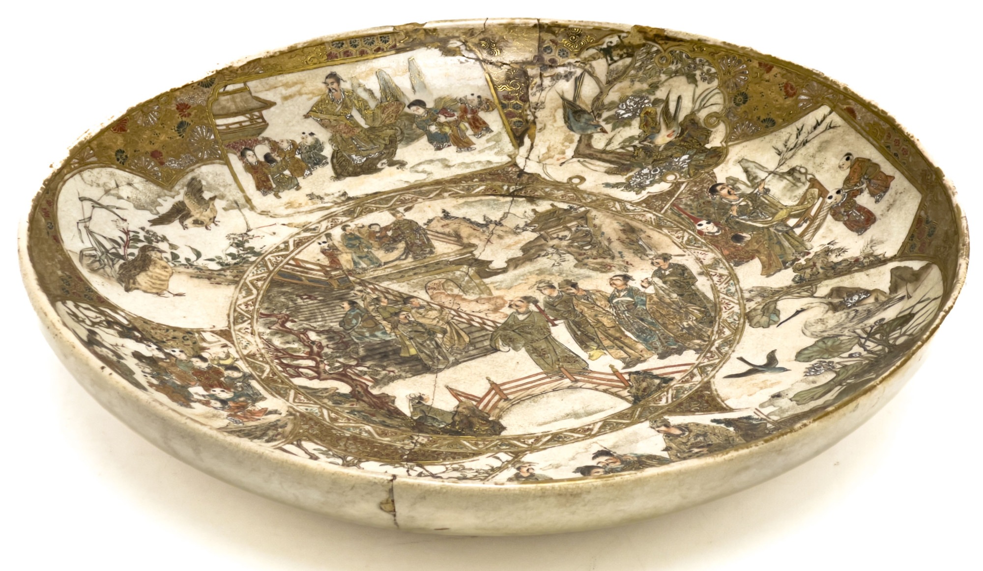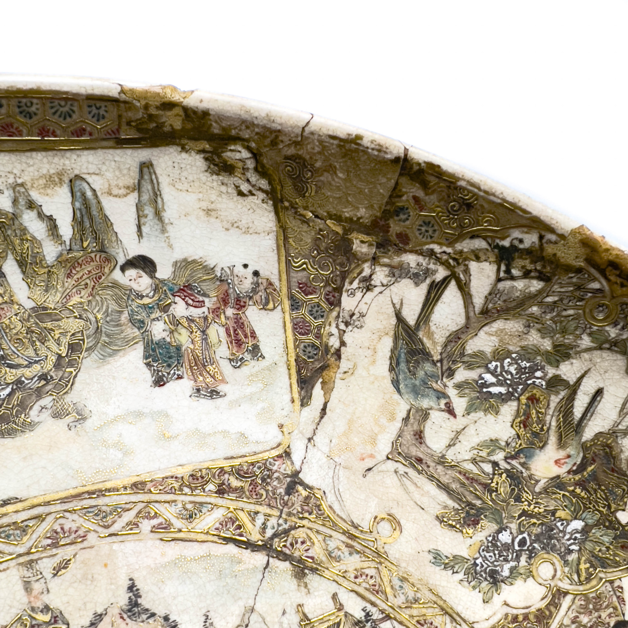 Japanese Satsuma charger with court and garden scenes in shaped gilt panels to face of charger
