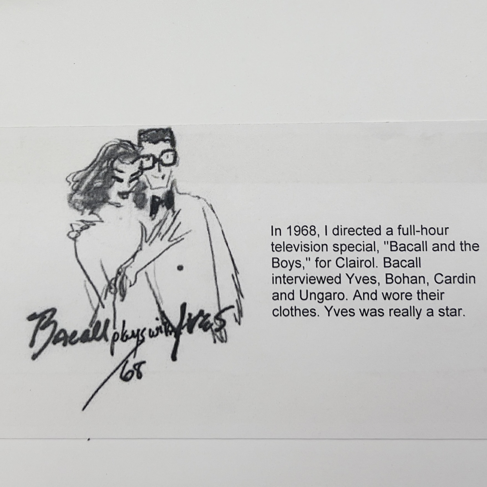 with sticker on the back in Yves' words that say 'In 1968, I directed a full-hour television special, "Bacall and the Boys", for Clairol. Bacall interviewed Yves, Bohan, Cardin and Ungaro. And wore their clothes. Yves was really a star."