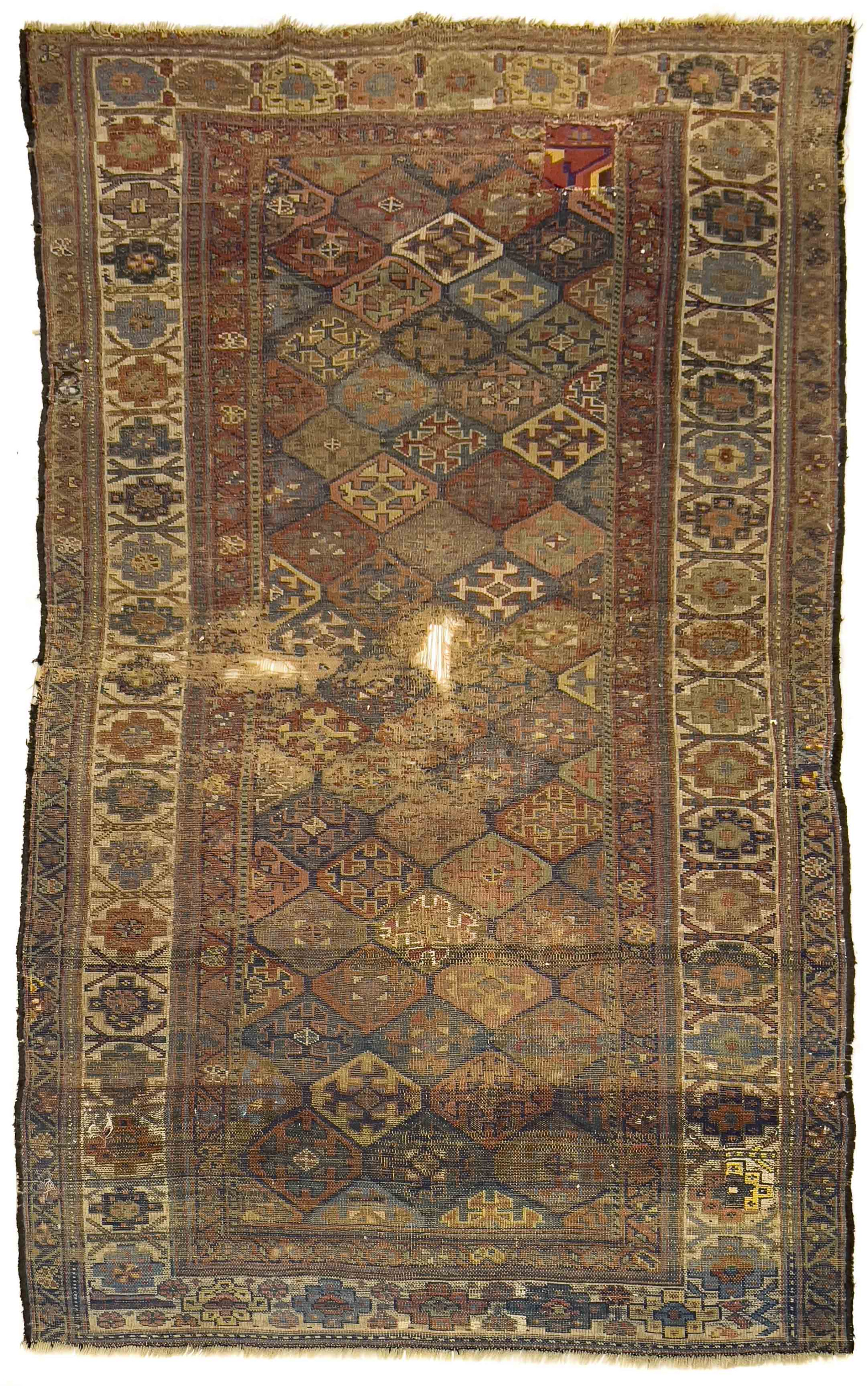 Hand knotted Karabagh rug with repeating patterned diamond motifs, repeated in border