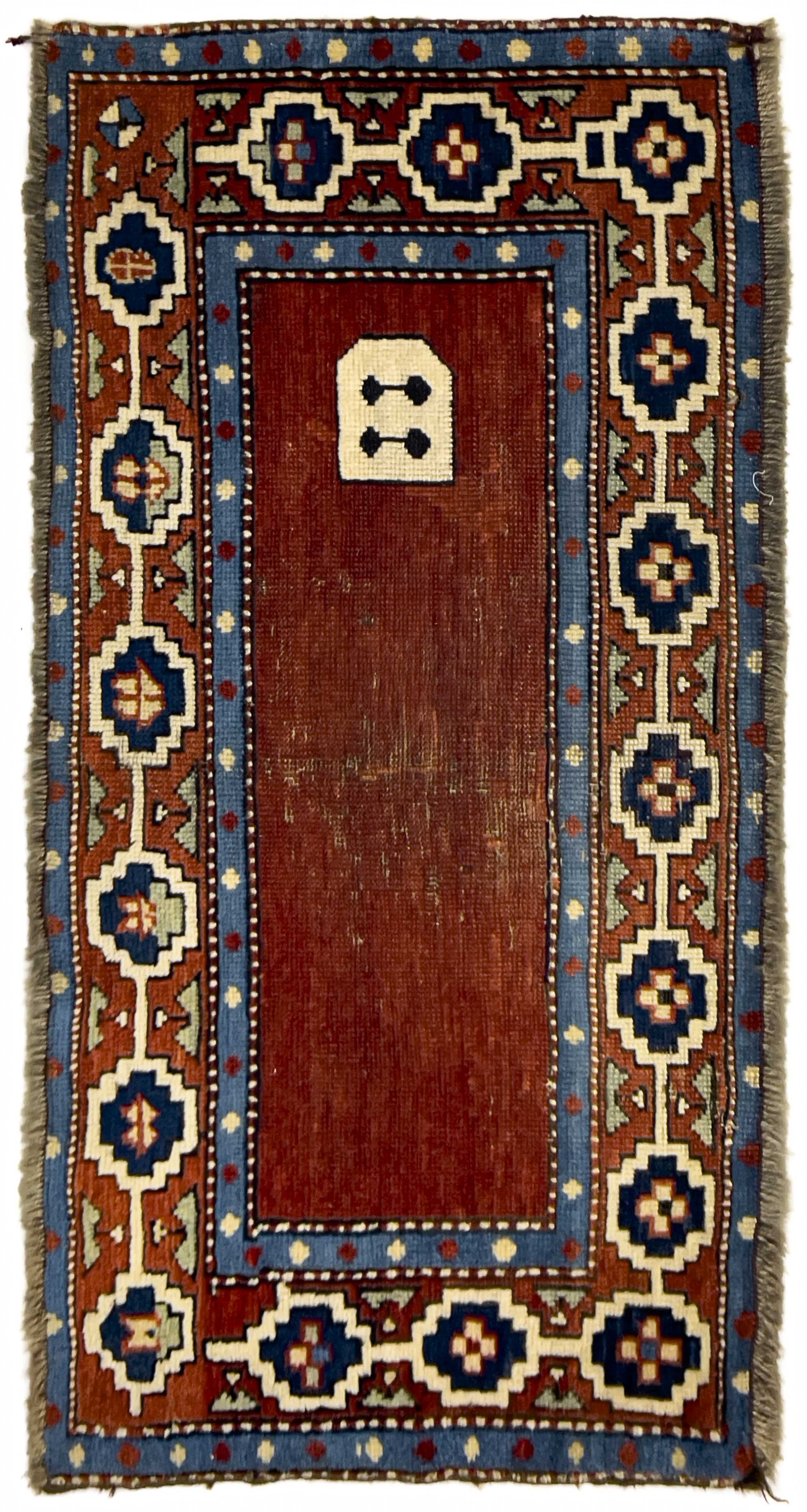 Hand knotted Kazak prayer rug with red ground with blue geometric border