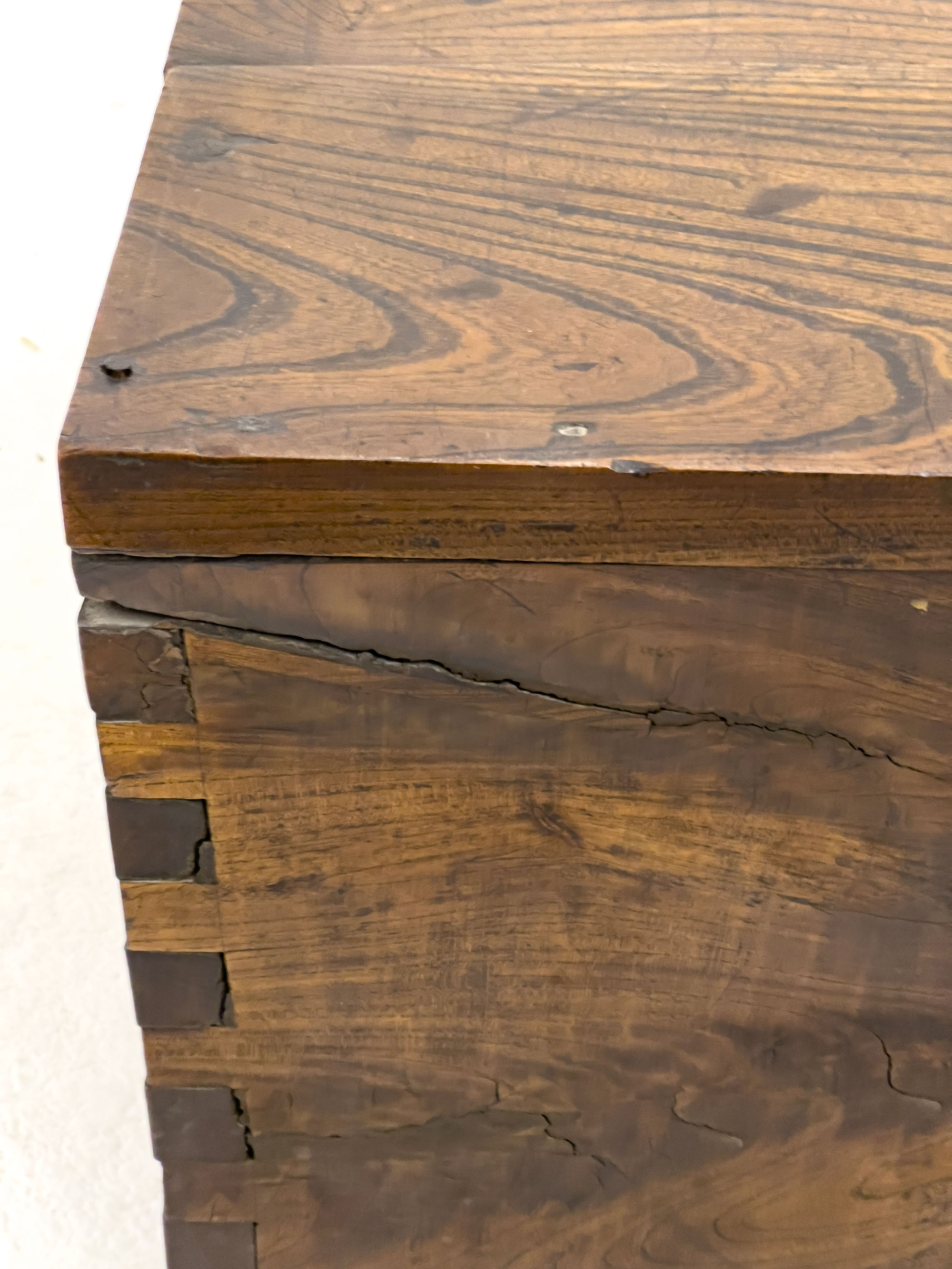 Korean teak lift-top chest, with wrought iron lock, raised on two supports