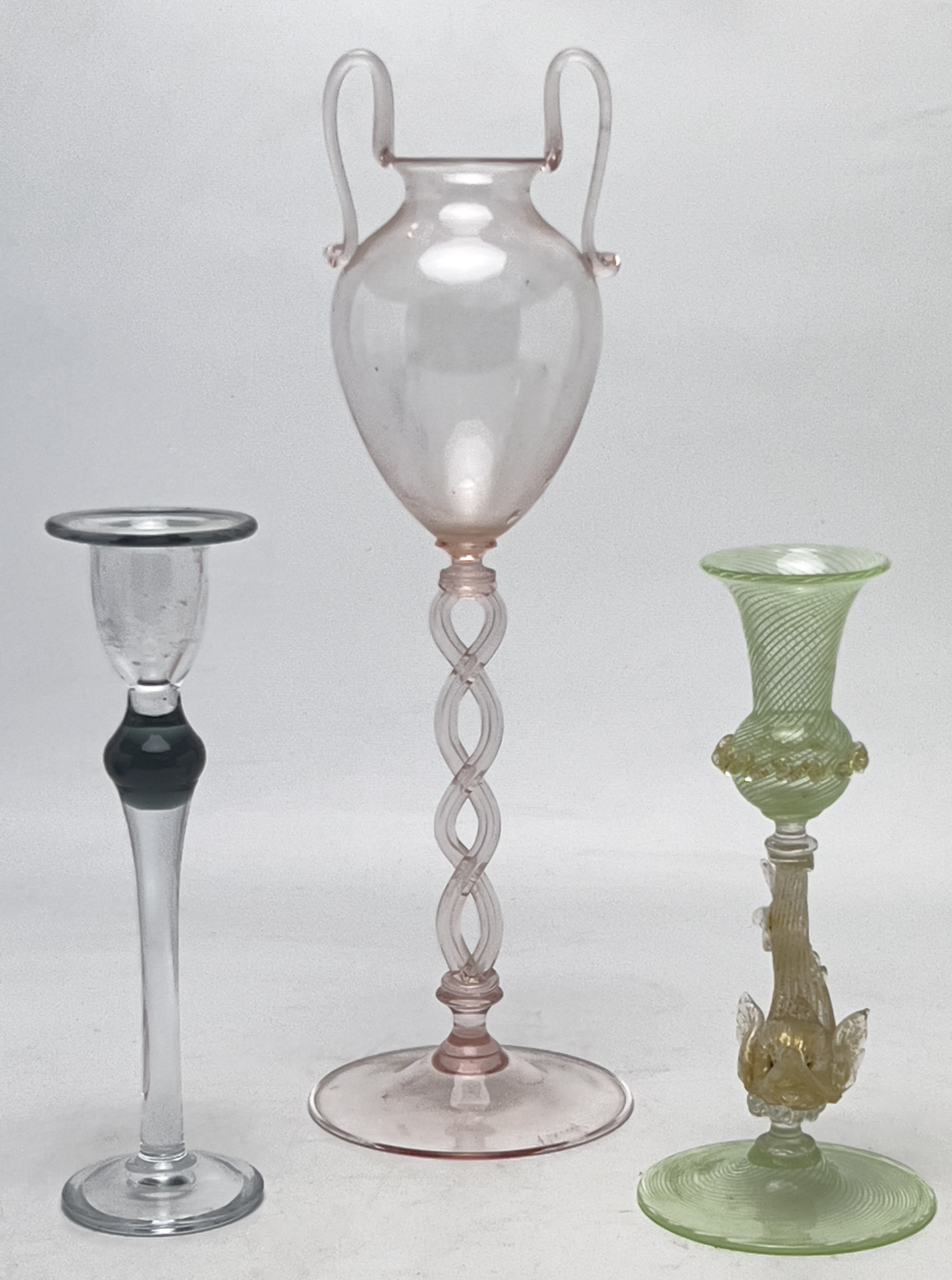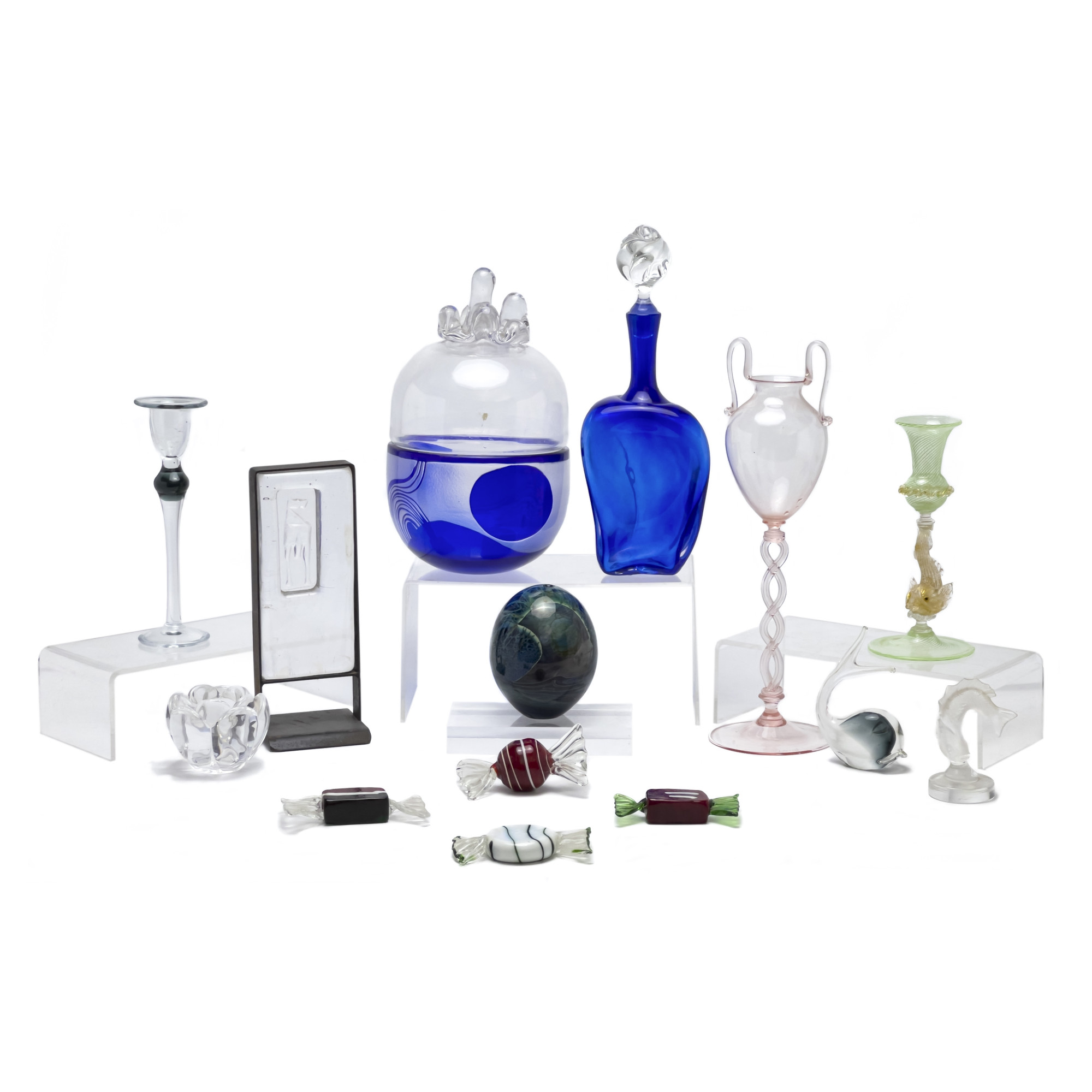Comprising, Lalique fish, Pauly & C. Murano tall pink glass vessel, two different candle holders, blue bottle with stopper, large blue lidded vessel, Royal Coppenhangan small crystal votive candle holder, small whale, Erik Hoglund for Kosta Boda dog sculpture, and four glass candies