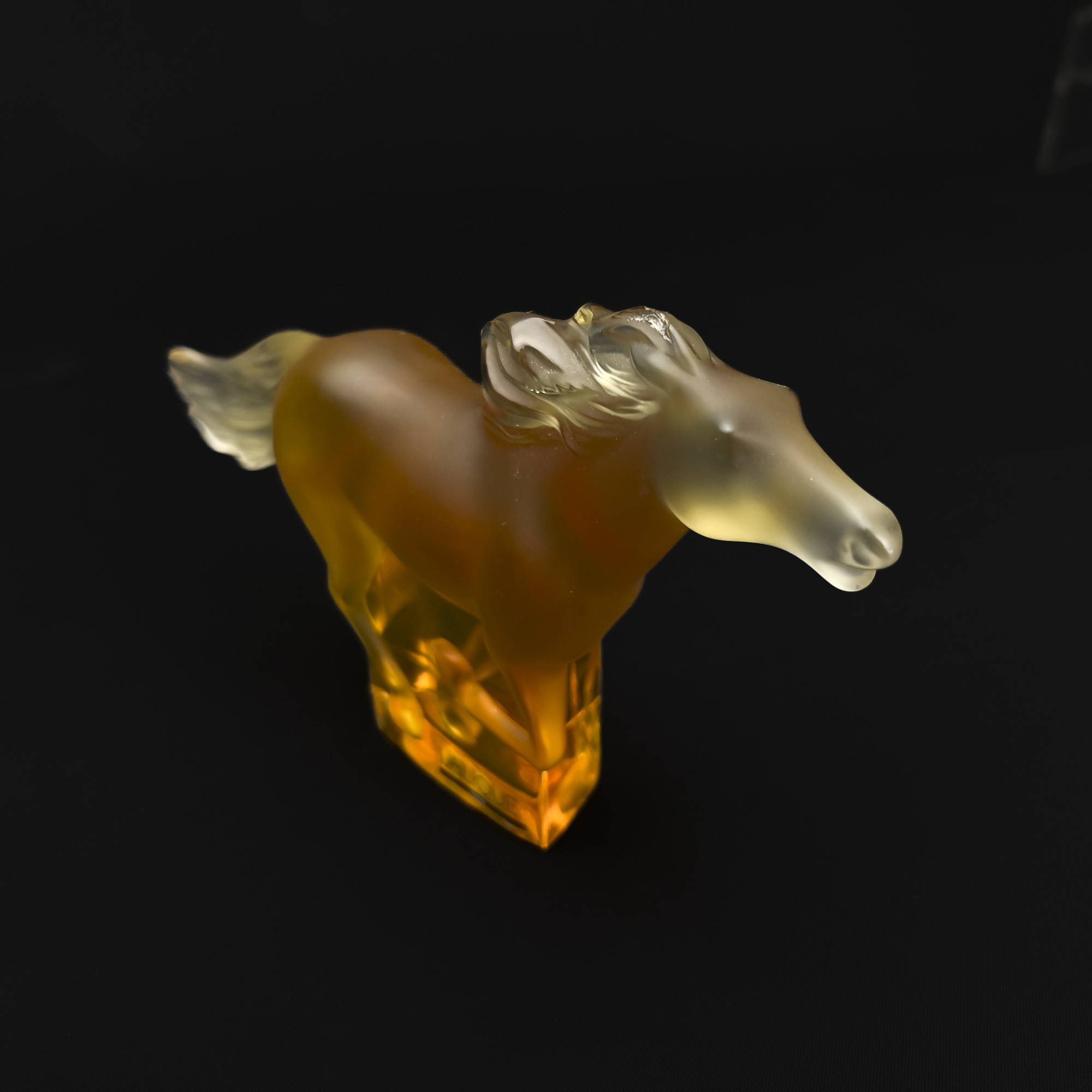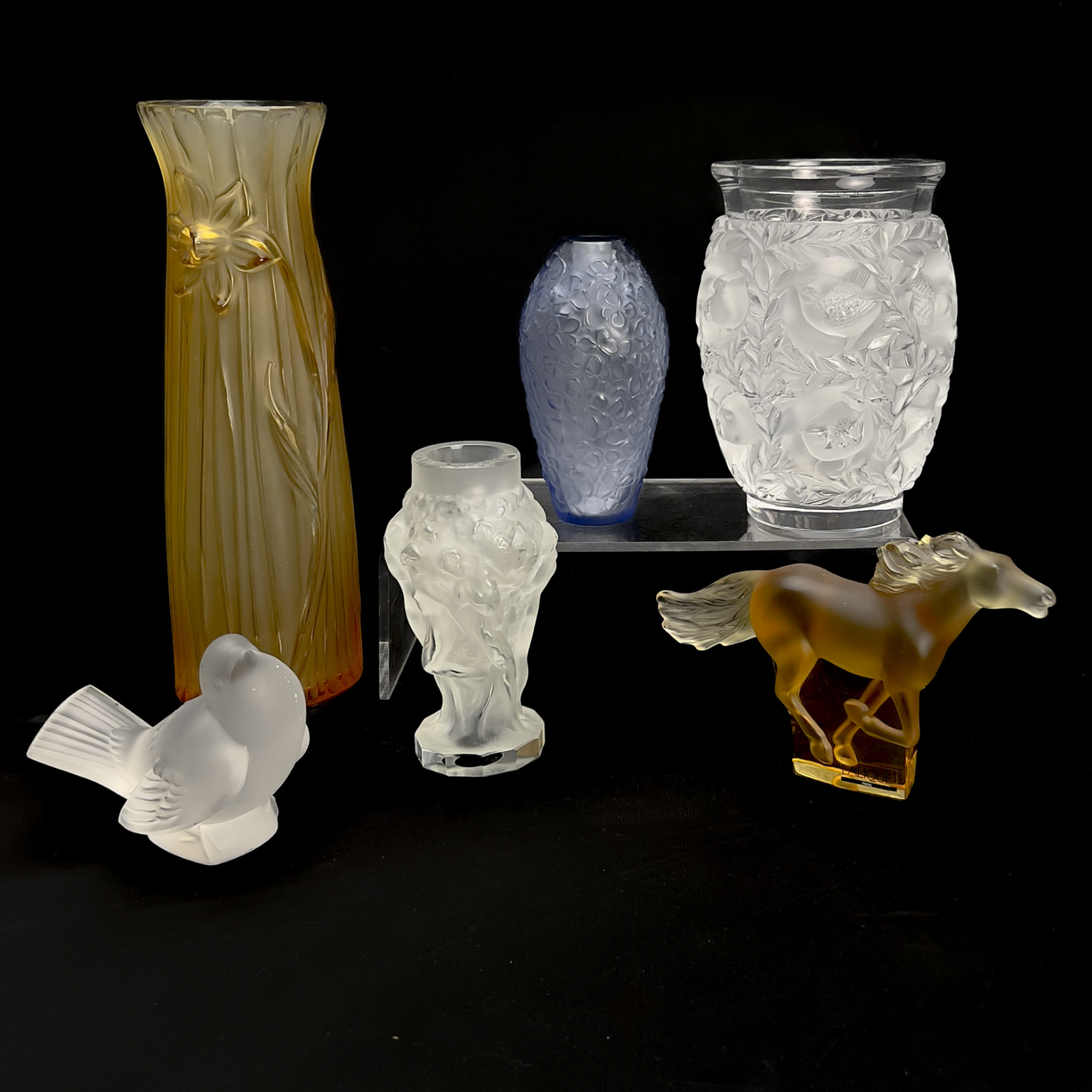 Comprising the Lalique Violeta vase, Kazak horse galloping figurine in amber, Bagatelle vase, frosted sparrow figurine, Jonquille Daffodil vase in amber, and a bohemian style frosted vase that is unmarked