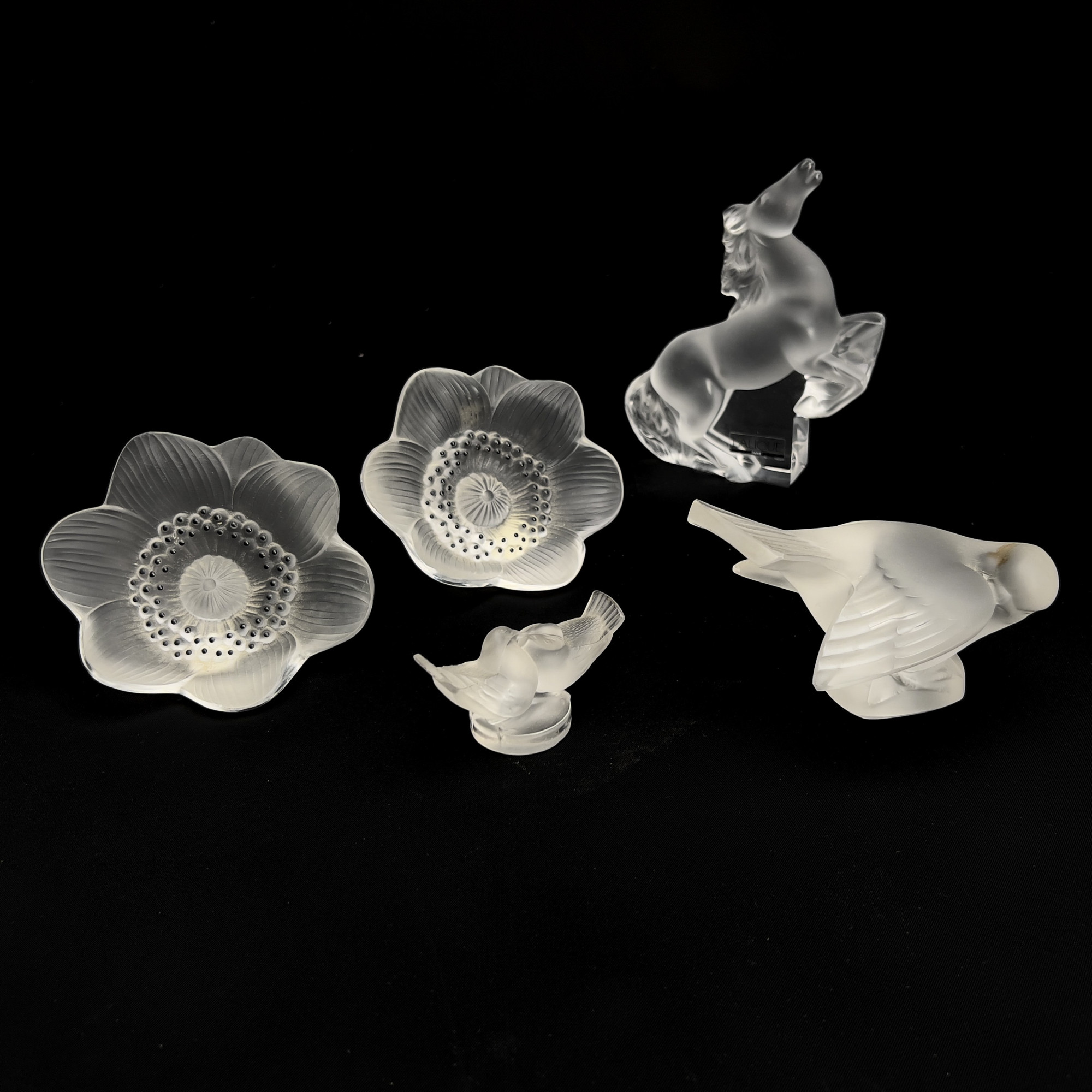 Comprising two anemone, a sparrow, a horse, and a small lovebirds figurine