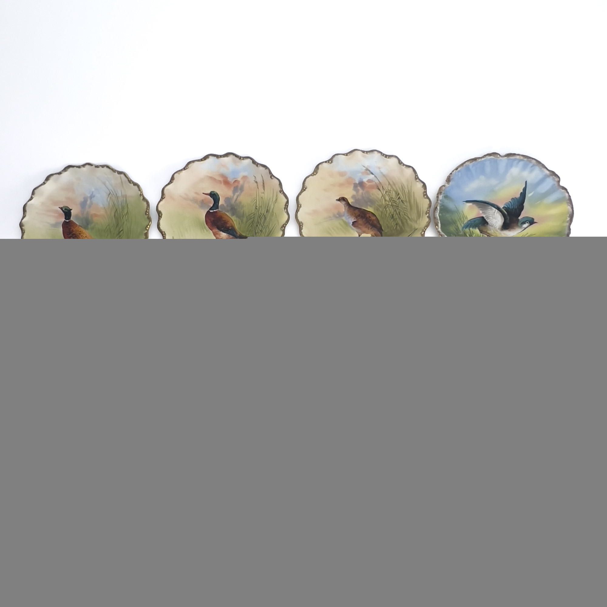 Comprising of twelve hand-painted porcelain plates and two large platters with gilt rims and scenes of various birds in nature including pheasants, quails, and partridges. Each signed by artist