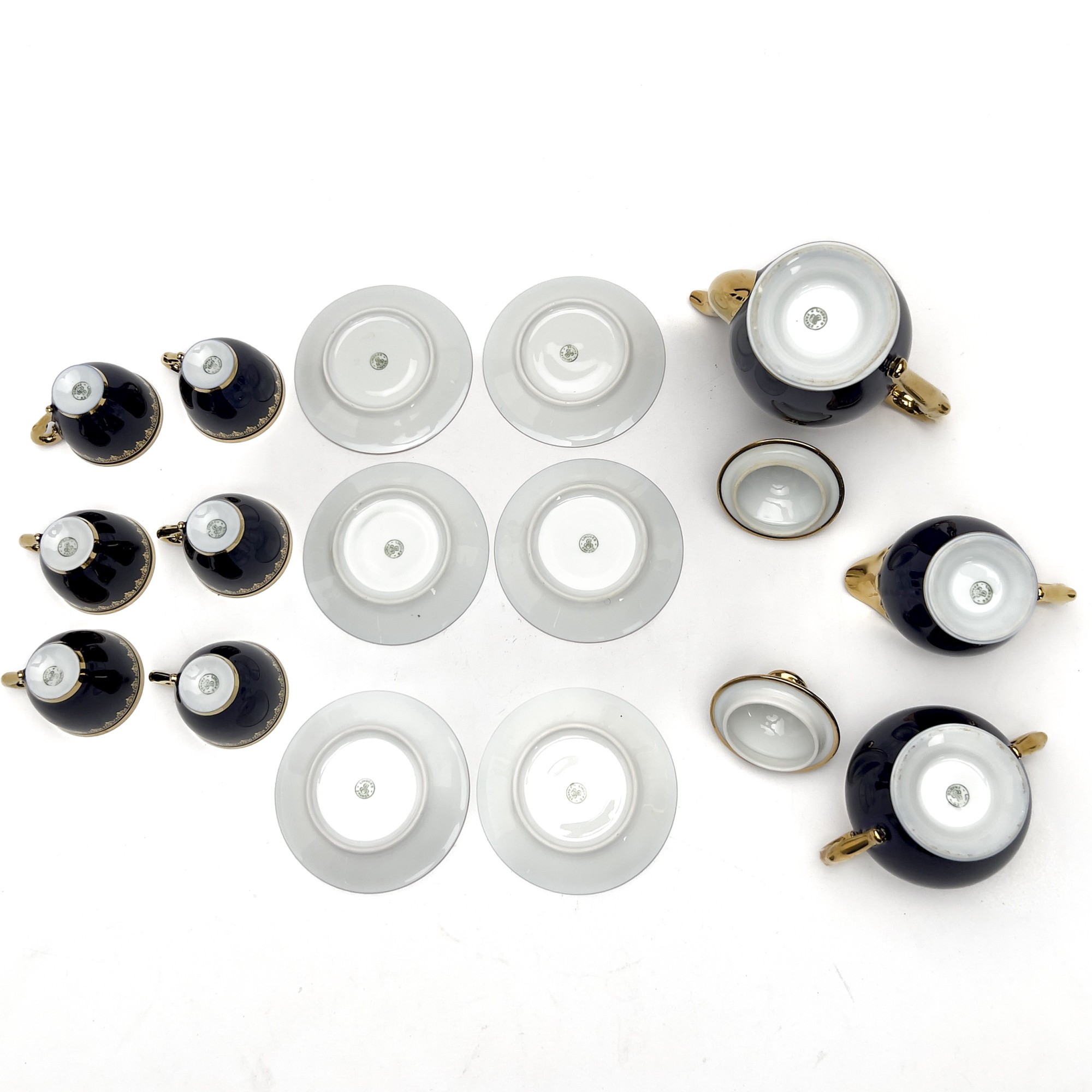 Comprising six demitasse cups and saucers, a coffee pot, a creamer, and a covered sugar bowl. Each in a cobalt blue with gilded trims and decorative accents, with a gilded interior to cups. Includes a blue snake-skin fitted carrying case for cups & saucers