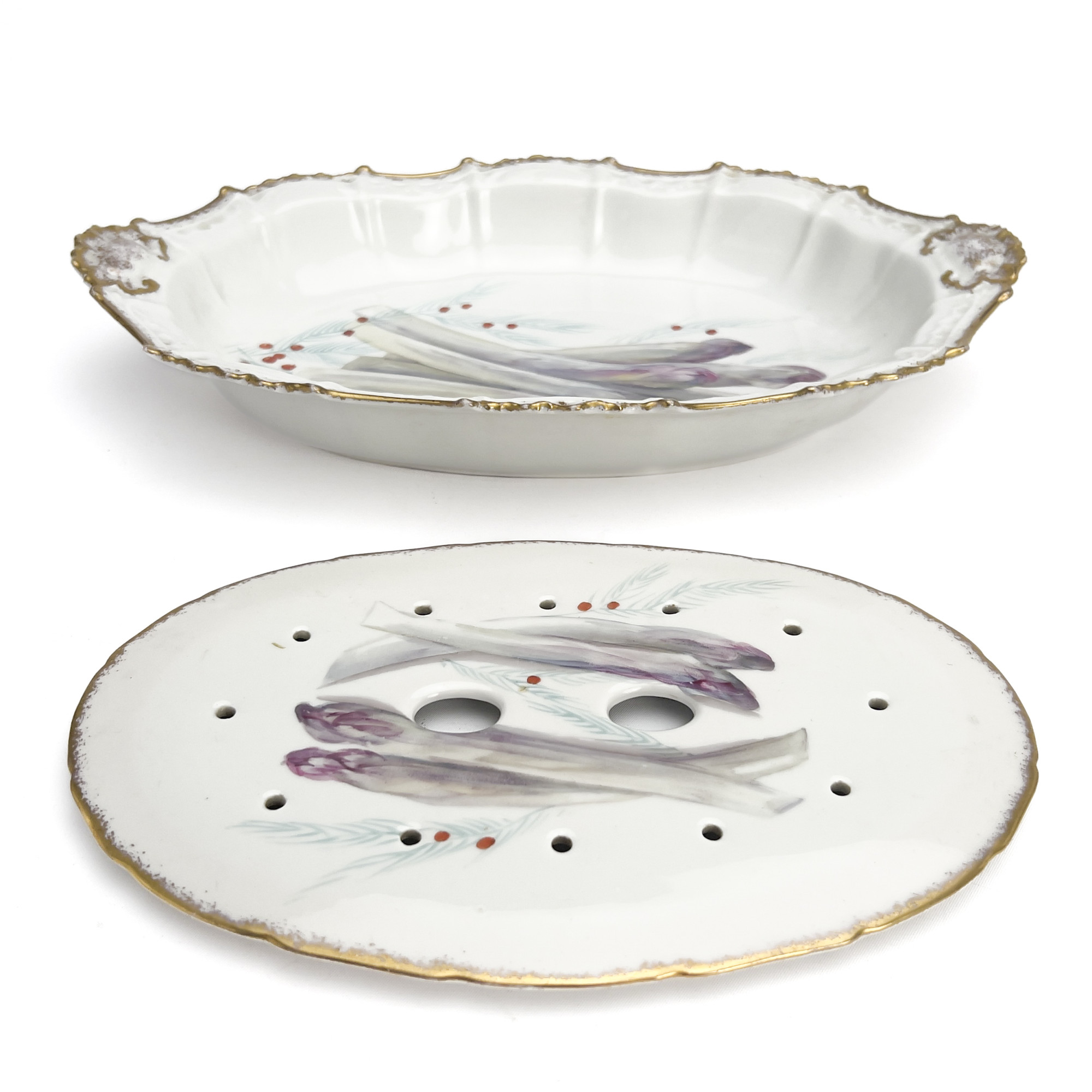 A Limoges, France porcelain asparagus service featuring hand-painted asparagus stalks and a gilt scalloped rim by Lewis,Strauss, & Sons. Comprising eight plates featuring a well for sauce, a sauce boat (broken handle) with an underplate, and a oval serving platter with a drainer insert