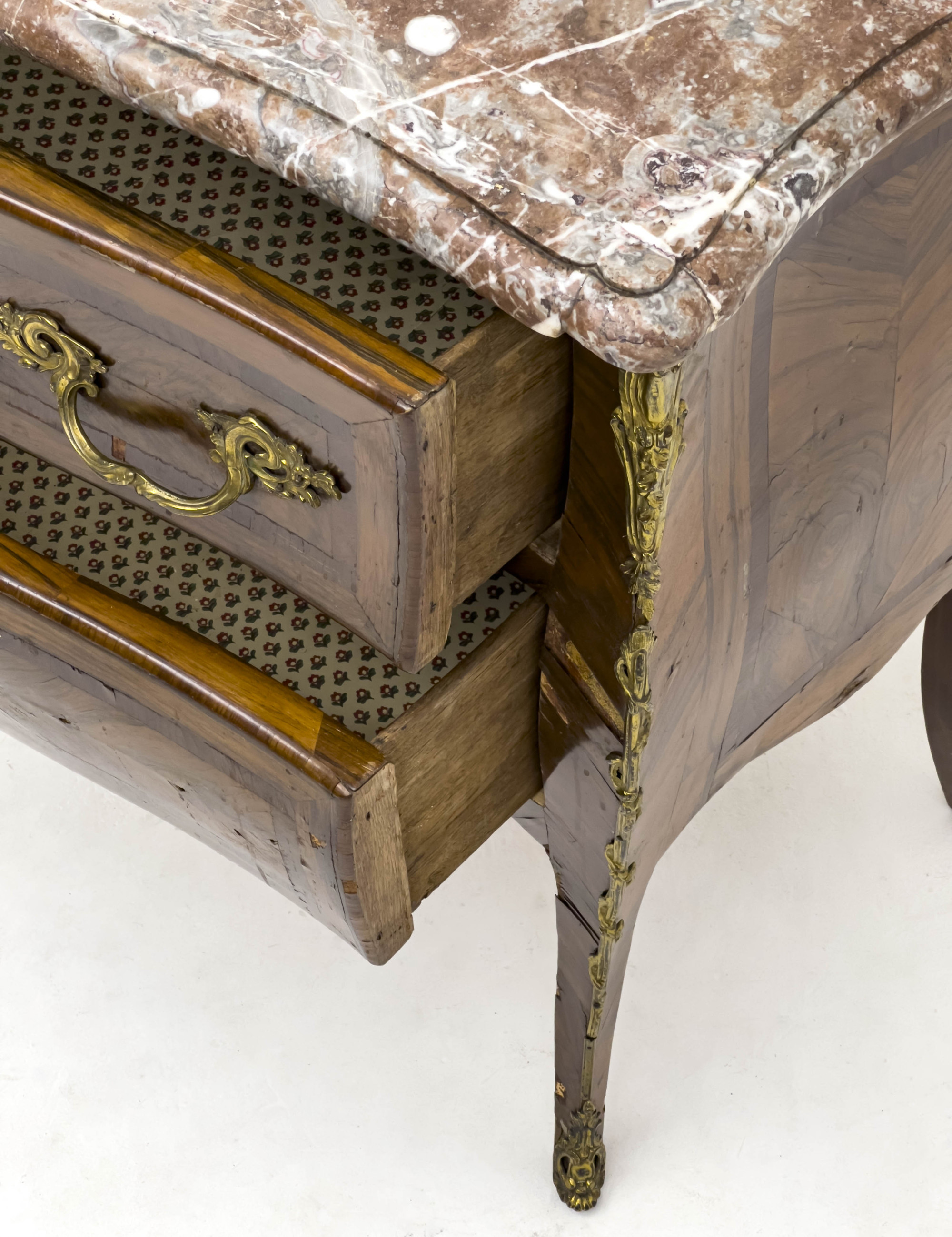 Commode in wood veneer, with ormolu details, stone top situated above two drawers, raised on four curved legs