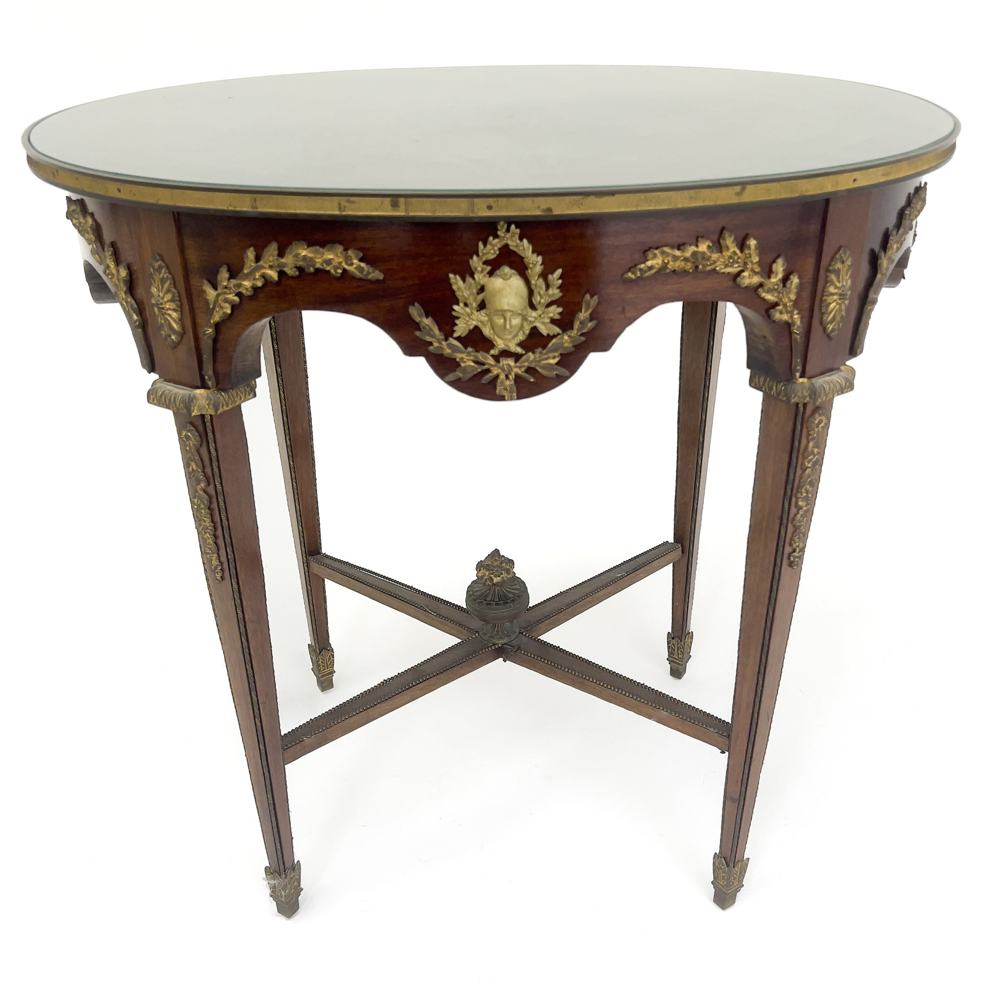 overall good vintage condition, wear commensurate with age and use, stretcher is missing 2 screws, ormolu mount missing on one side of table